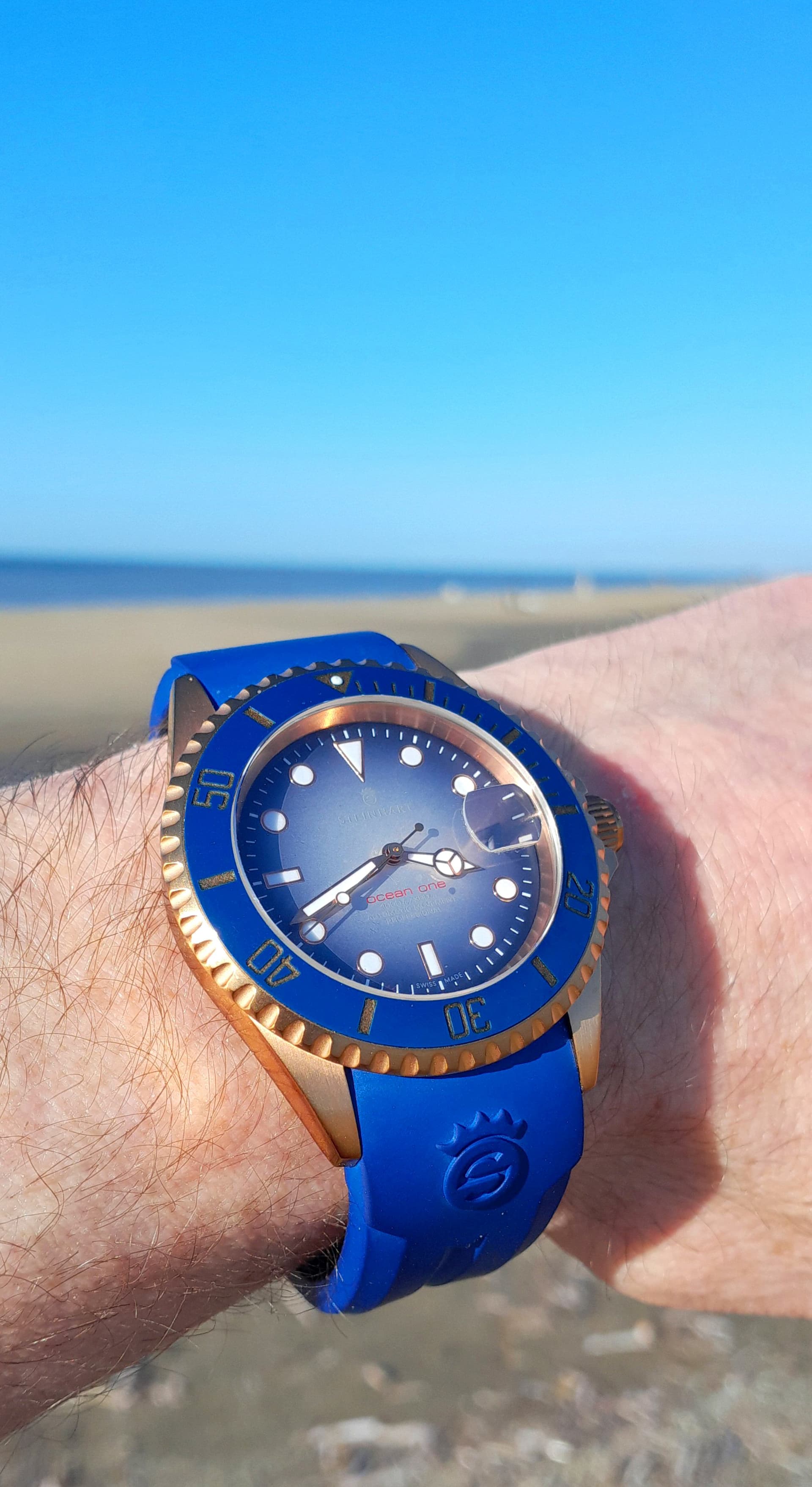 hij kwam met een goudkleurige bracelet, maar dan is hij veuls te patserbakkerig. Blauw rubber maakt hem speels.