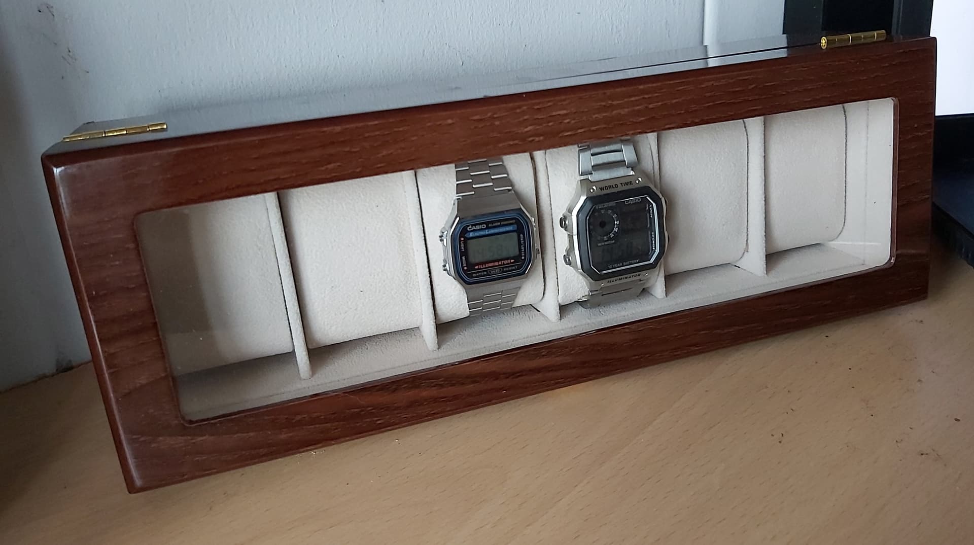 Als eerste kocht ik bij BOL een horlogedoos. Voor 13 Euro. Kunnen er 6 in. Ik begin dus met digitale Casio’s. Ik heb er nu twee en een ABL-100 (stappenteller en bluetooth) is incoming. Er moet ook zeker een F-91W bij komen. Dan misschien nog een Waveceptor.