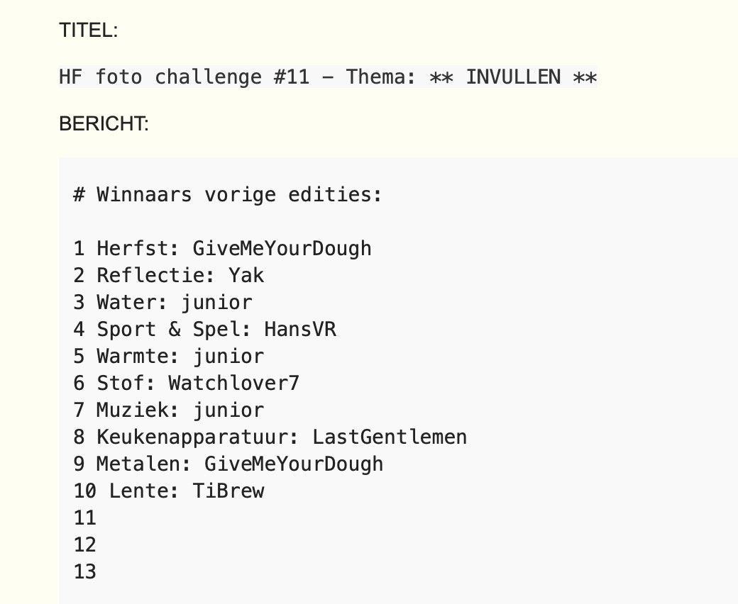@TiBrew, you’ve got a PM met de template voor het wedstrijdtopic.