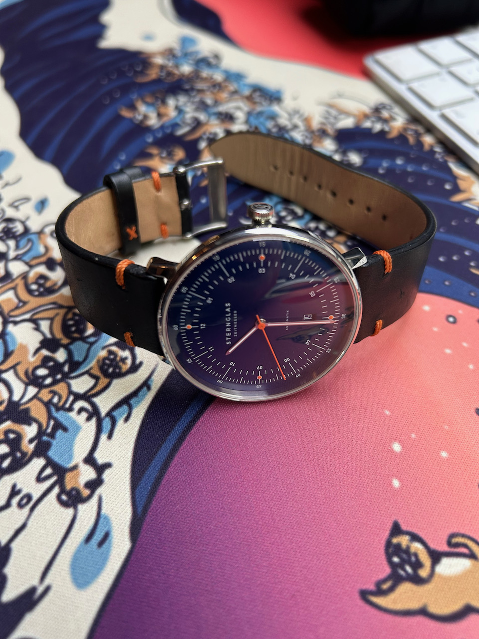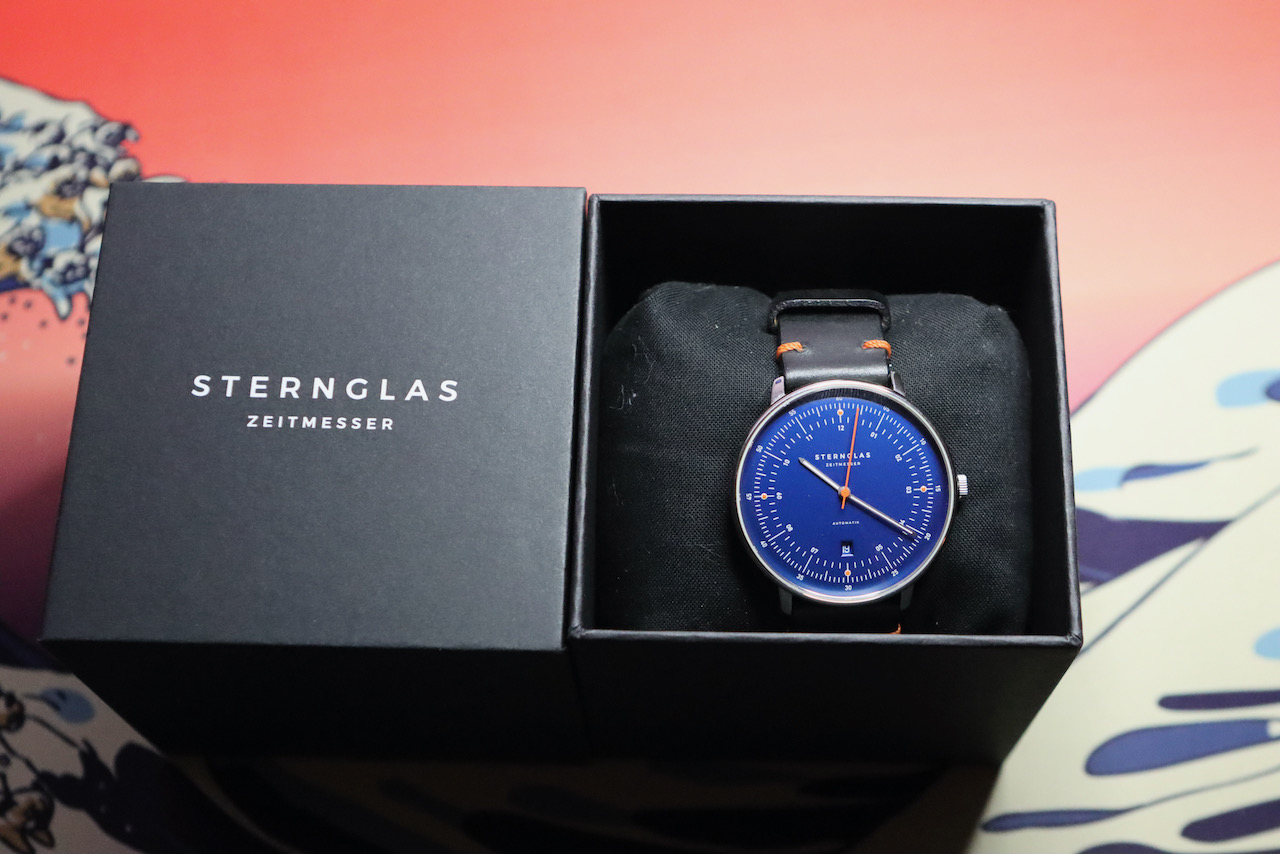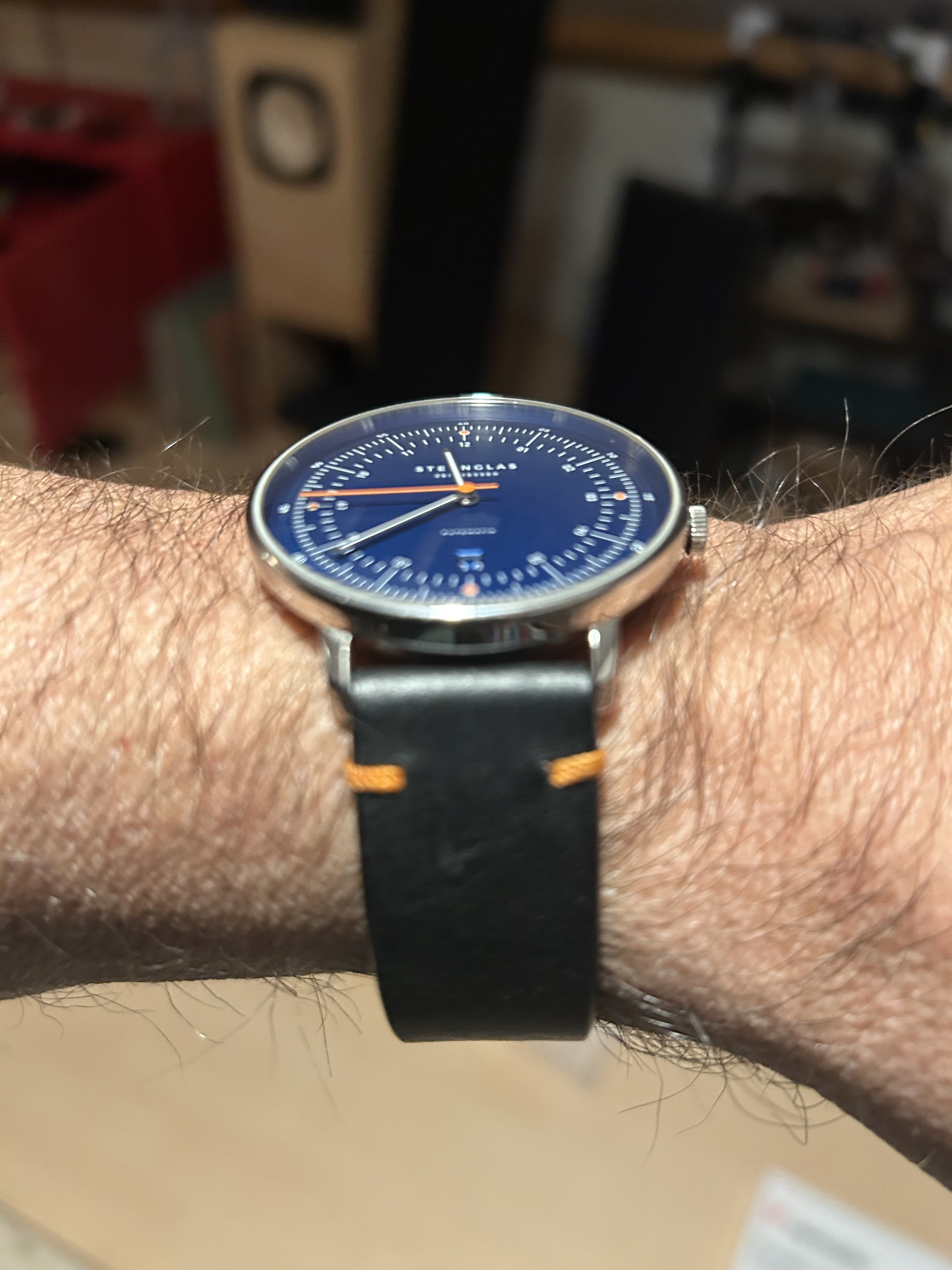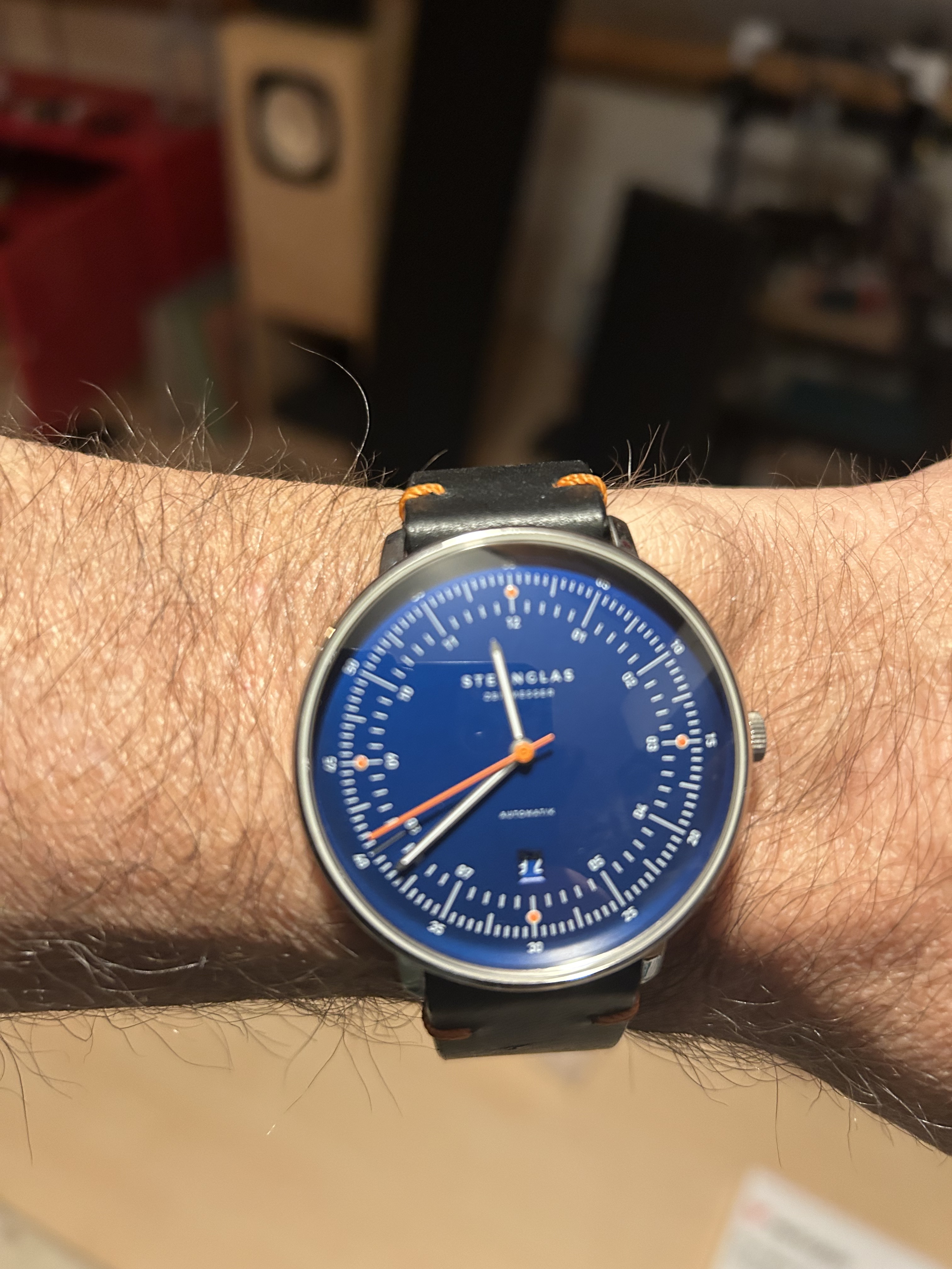 Mijn horlogedoos is te vol en ik laat een aantal gaan die ik toch niet draag. Deze mooie mechanische Sternglas Hamburg “Edition Küste” heeft saffier glas en zit op het originele bandje. Enkele dagen gedragen in totaal en horloge ziet eruit als nieuw.