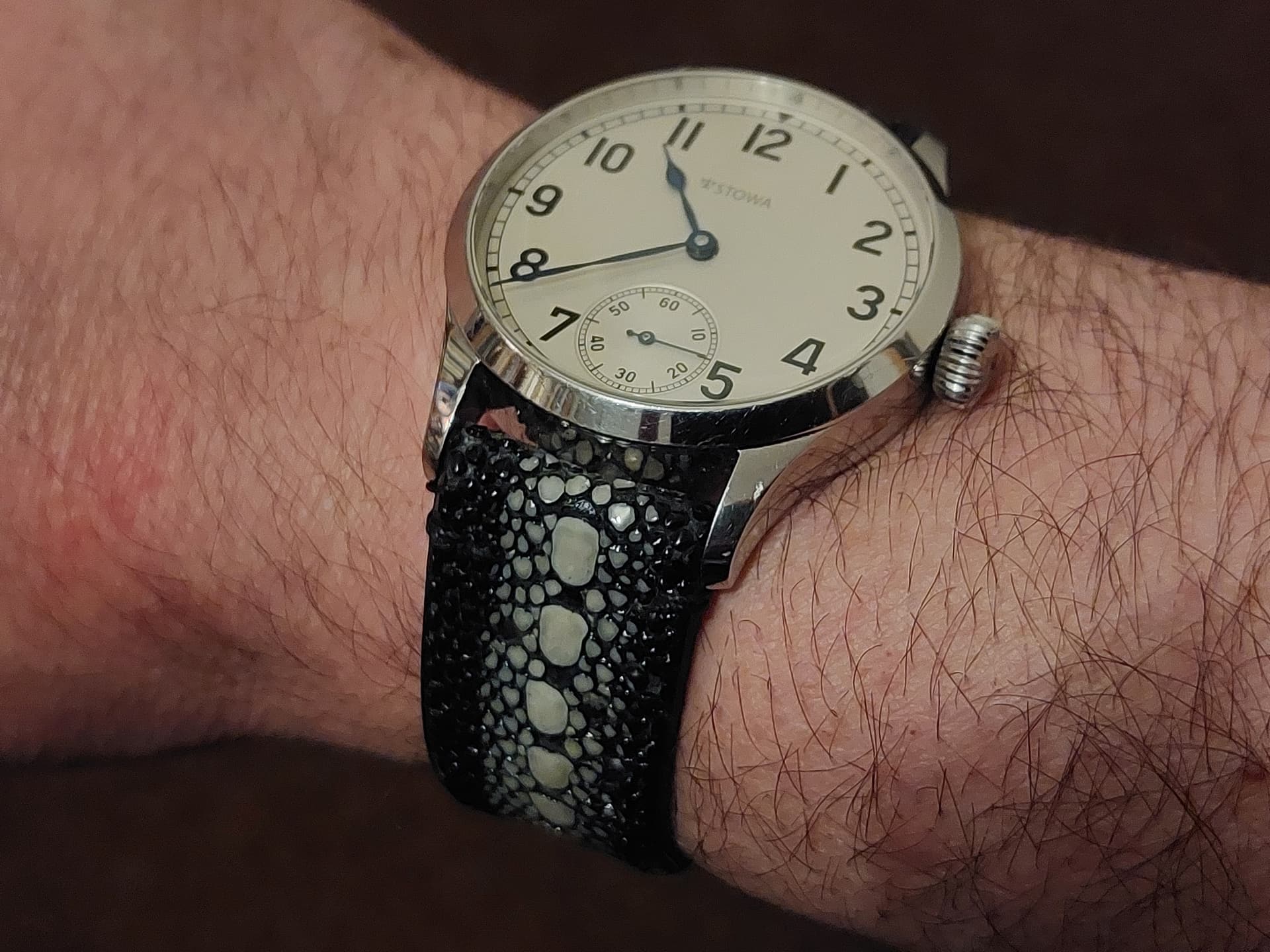 Vandaag een bezoek gebracht aan 1971straps. Ik ben enorm blij met mijn nieuwe β speciaal voor mij gemaakte β aanwinst, een bandje van Row Stone Stingray Black (lugsize 22 mm) voor de Stowa Marine (42 mm).