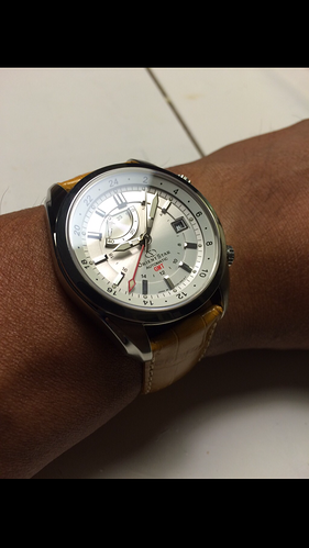 Oeh ja, de Nomos bandjes zijn erg mooi inderdaad. Maar die ik gezien heb, waren steeds recht (niet padded). Voor een Nomos is dat prachtig, maar deze GMT is best een flinke jongen.