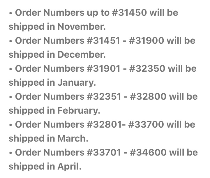 Hieronder de verwachte levertijd afhankelijk van het ordernummer: