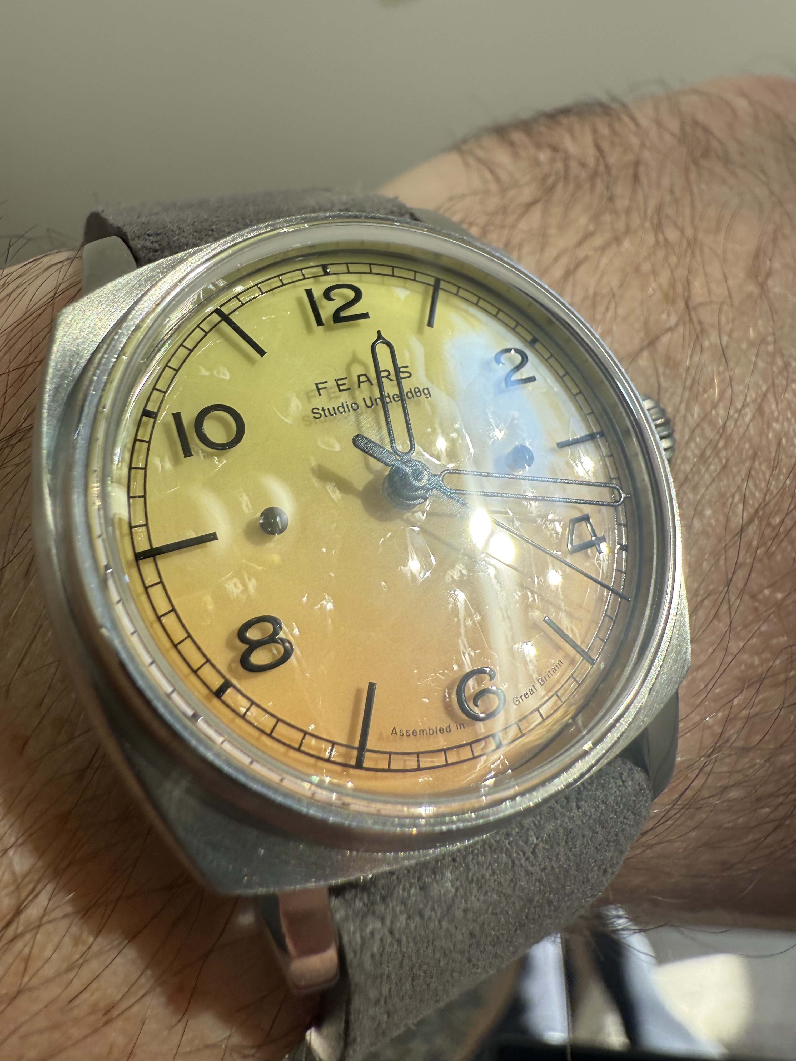 Dial: Speelt mooi met het licht. Geen GS niveau, daar is het te grof voor. Maar gaat van fel en egaal geel naar eigeel met effect. Mooi. Bij veel licht wel een hoop reflectie; alsof er een folie over de dial zit.