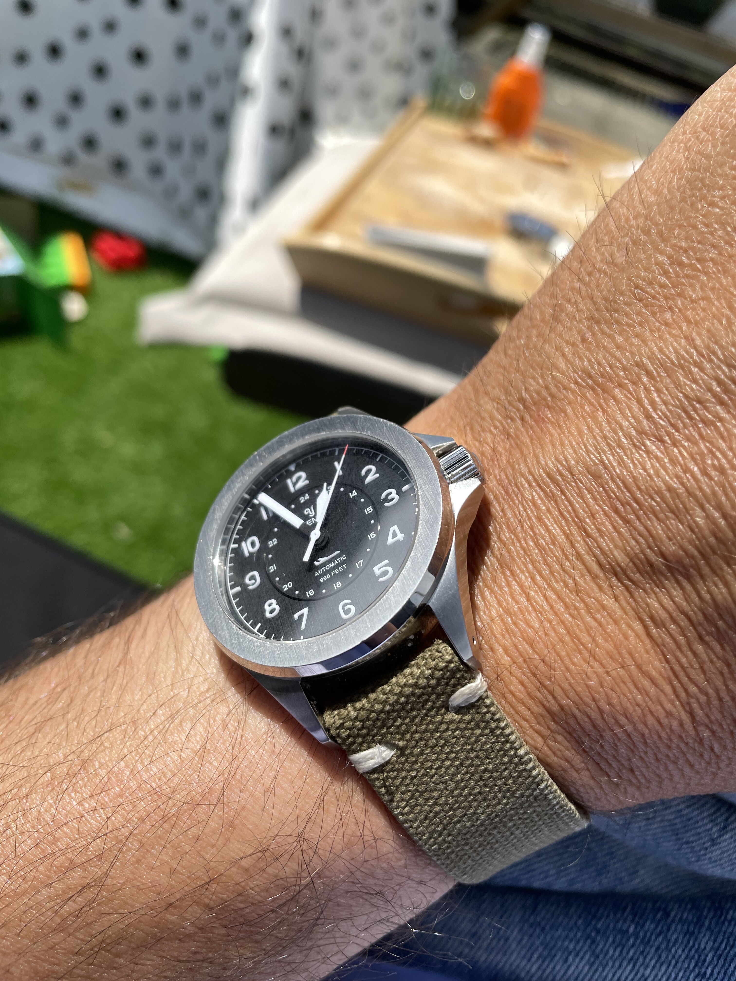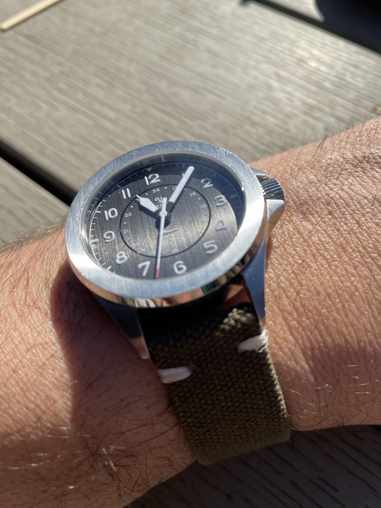 Mooie keuze. Geel is leuk. Dat scheelt, want ik zou net dit ding voorstellen toen ik zag dat het ook gewoon een field watch mocht zijn in plaats van een duiker: