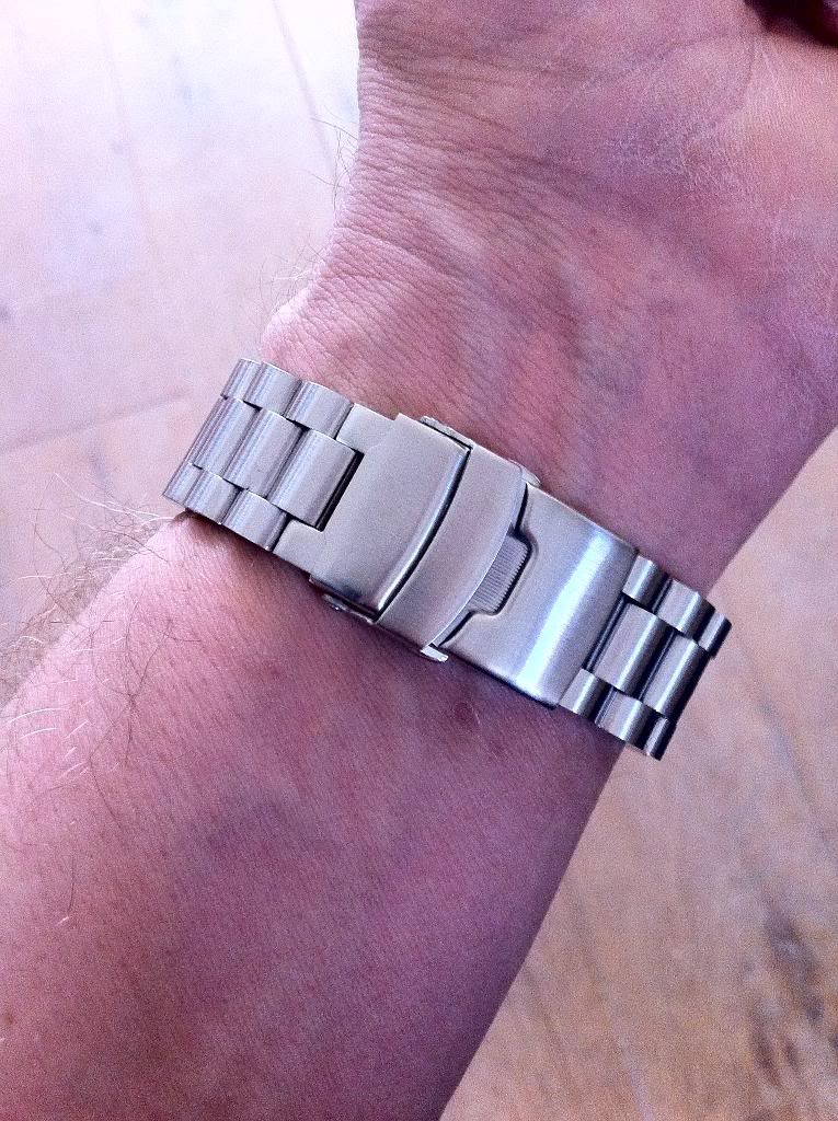Te weinig ruimte doordat de schakels vrij dik zijn. Maar of het erg is, nou nee, want de sluiting van Strapcode is aanmerkelijk beter van kwaliteit dan de Seiko-sluiting, die ook inderdaad nog eens langer is. En mijn pols is toch al zo smal (18 cm)…