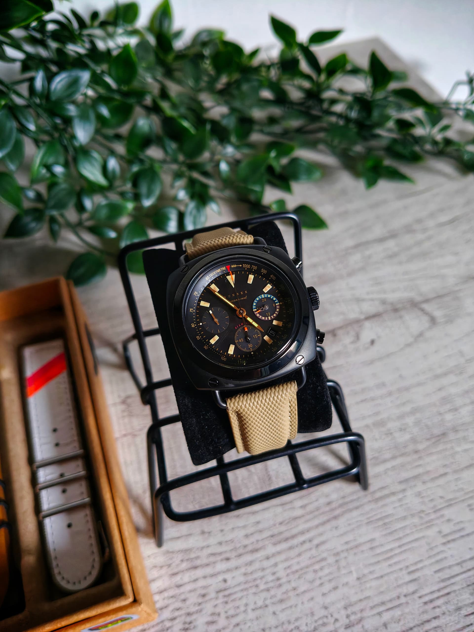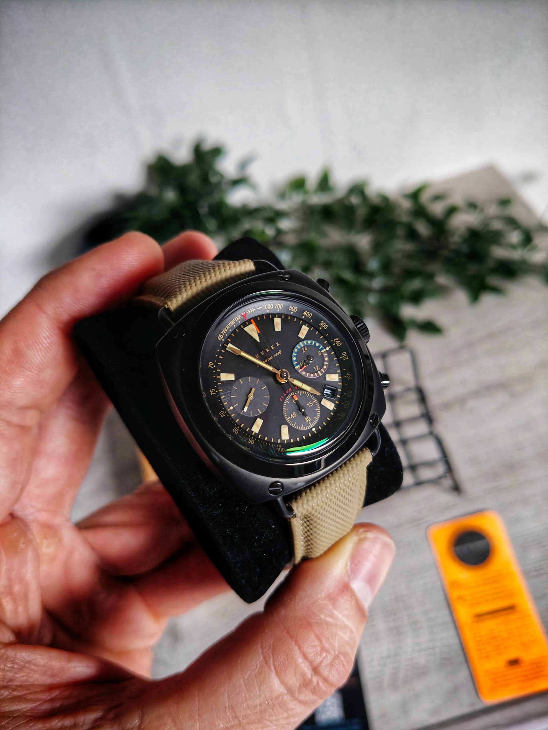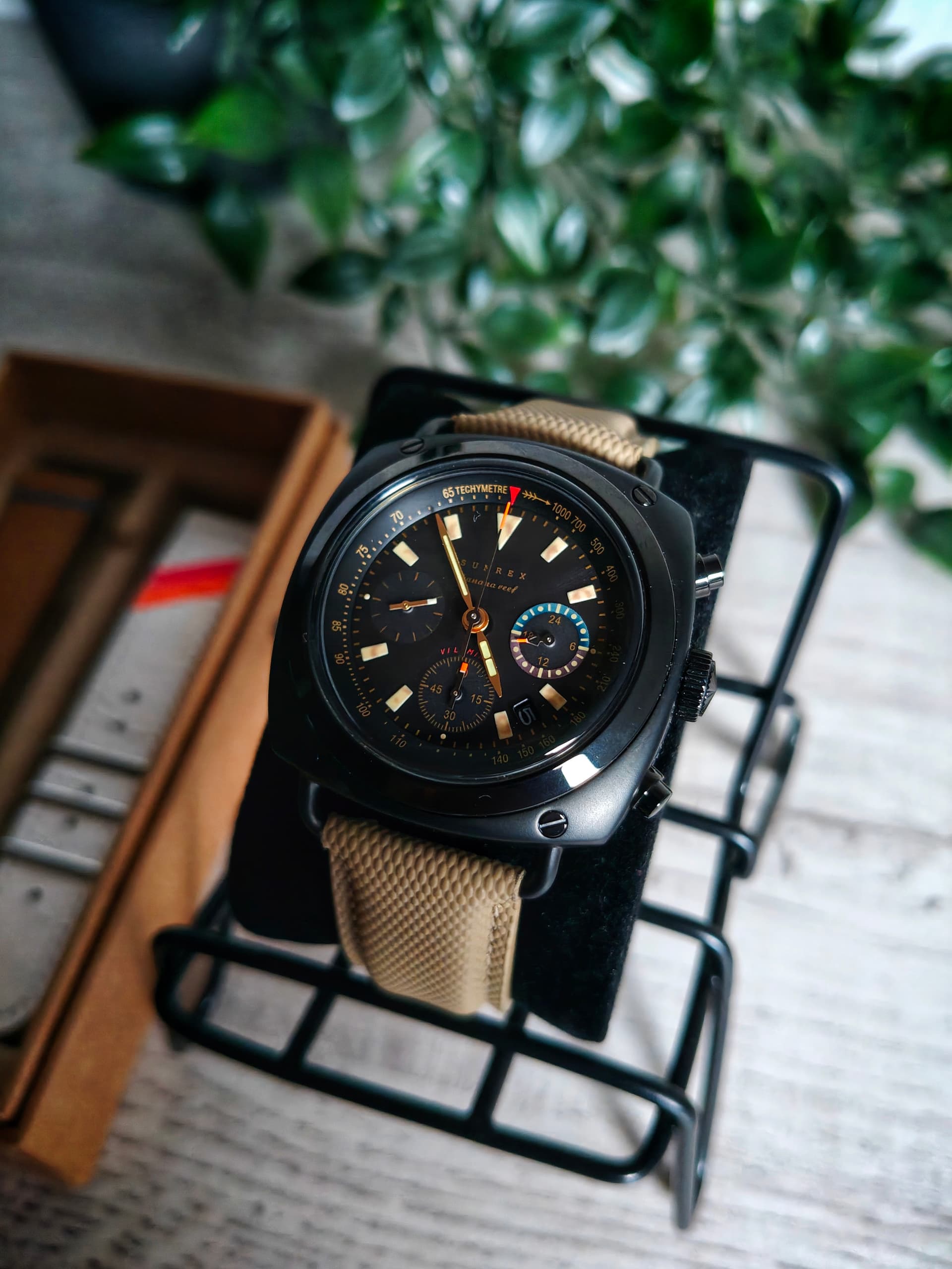 Deze prachtige eigenwijze Solar van Sunrex mag de collectie weer verlaten. Volledig opgeladen gaat deze tot 5 maanden mee. Het horloge is nog geen maand oud en dus nauwelijks gedragen en is als nieuw. De twee meegeleverde straps zijn ongedragen. Bij aankomst heb ik de Banana Reef direct op een band van CNS gezet die je er ook bij krijg. Nieuwprijs van deze Sunrex was 430,- euro maar mag weg voor een vraagprijs van 250,- euro.