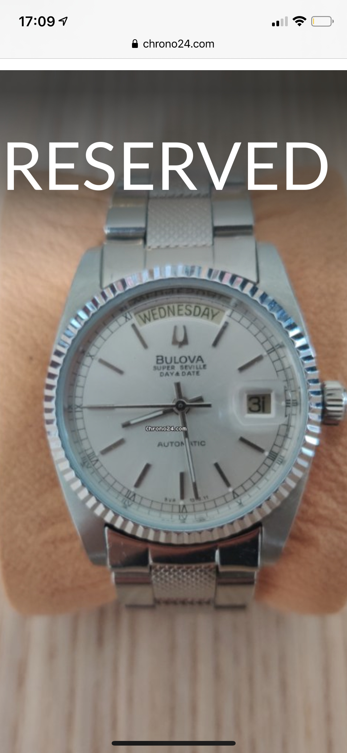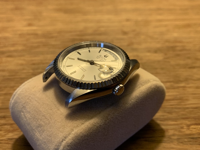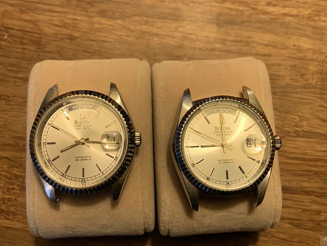 Een enkele heb ik op internet gevonden met deze lugs, dus compleet uitgesneden tegen de kast. Er staat een kleiner opgelegd bulova logo op de plaat, ik mis een streepje of ‘&’ teken tussen day en date.