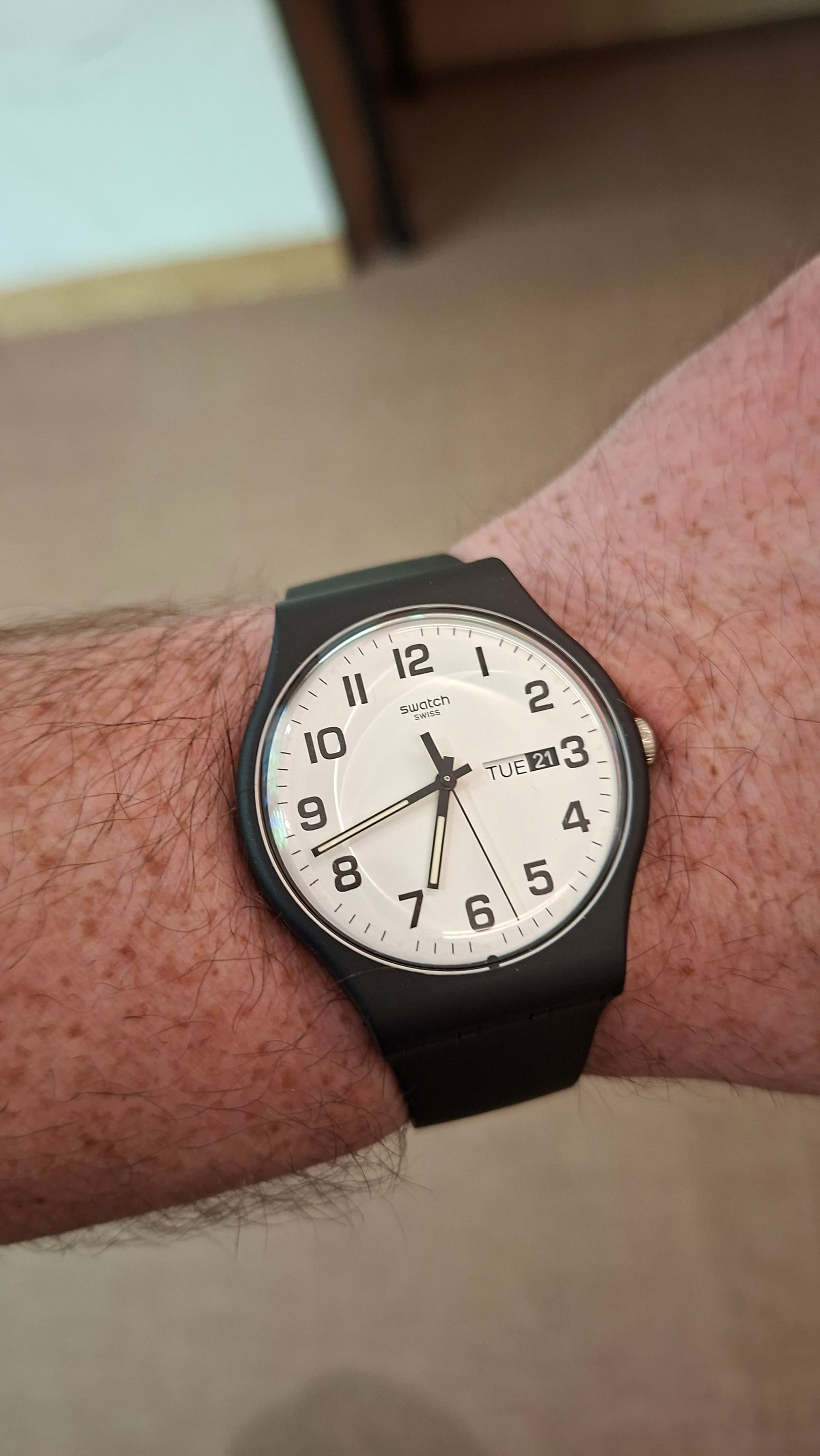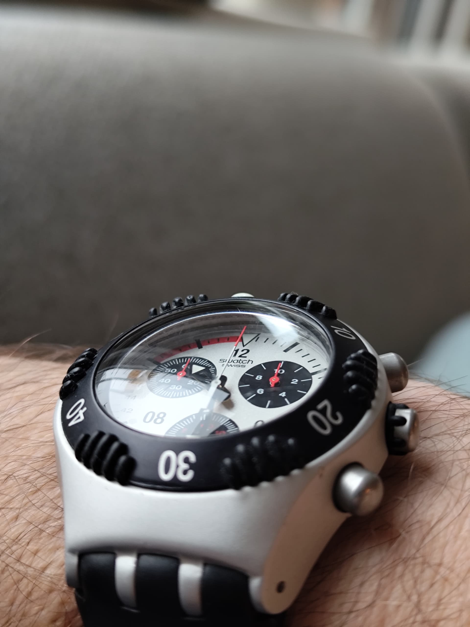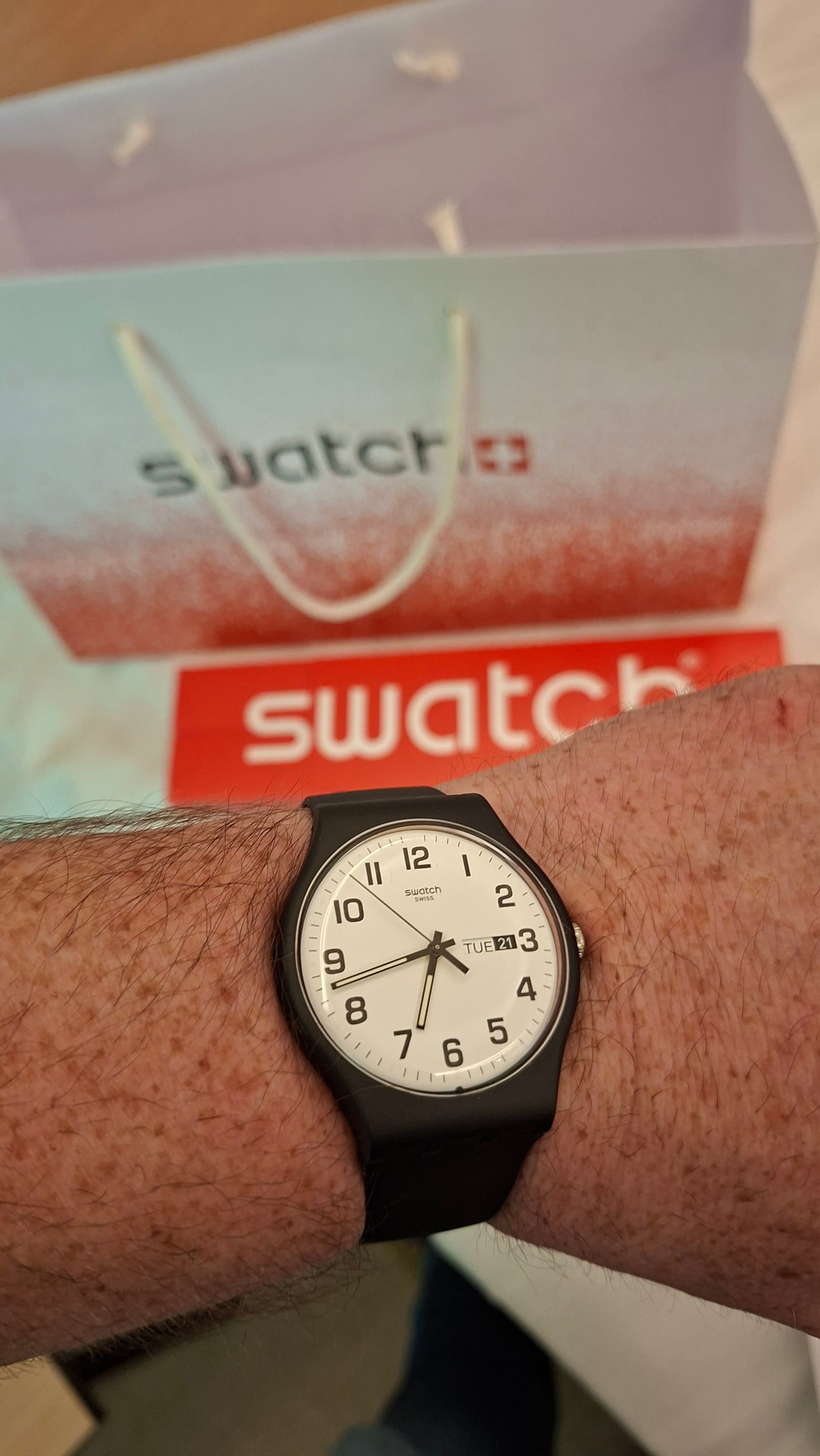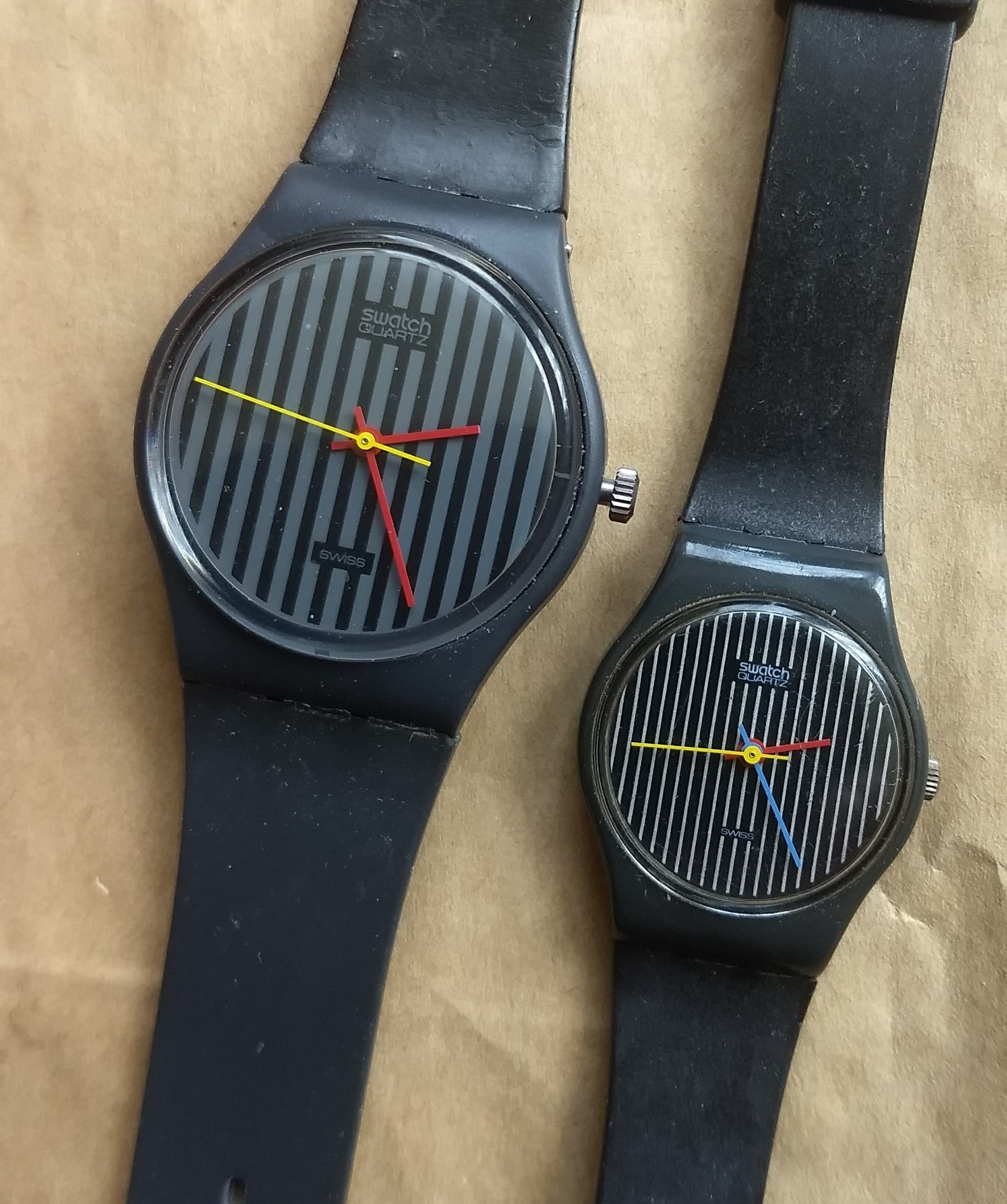 De Swatch die ik in 1984 voor mijn Heilige communie kreeg heb ik niet meer. Deze is degene die bij de Swatch boutique in Genève het dichtst in de buurt kwam van mijn eerste horloge. Zeer trots was ik destijds als 7 jarig jochie ![]()