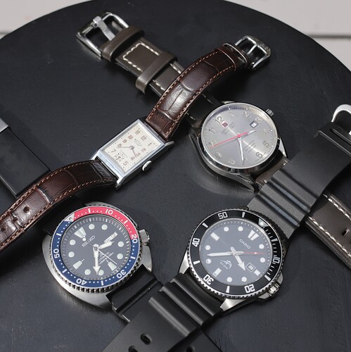 Goed, misschien moet ik er even aan wennen, dus toch even serieus vergeleken met een paar concurrenten in de collectie. De Lorus fieldwatch, een Seiko vijfje en de schildpad.
