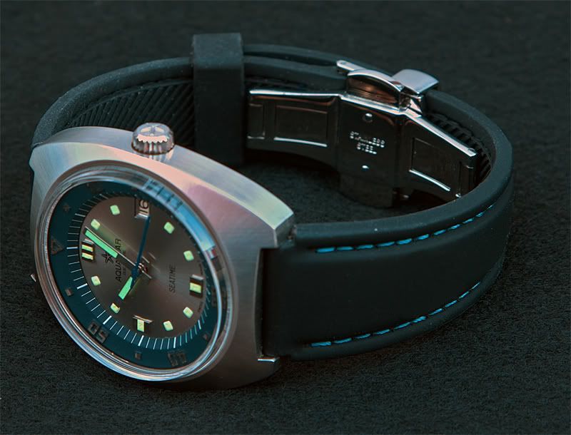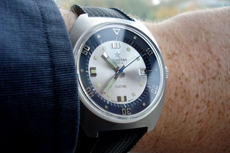 Vanmorgen de knoop doorgehakt. Een tijdje geleden stond hij al te koop. Toen viste ik achter het net. Vandaag zette de nieuwe eigenaar 'm weer te koop vanwege de financiering van een dure aankoop. Een 70’er jaren Aquastar Seatime in heel goede conditie. A. Schild uurwerk (zat ook in Blancpain FFs en Glycines), 40mm zonder kroon. Interne bezel. Geserviced in Engeland.