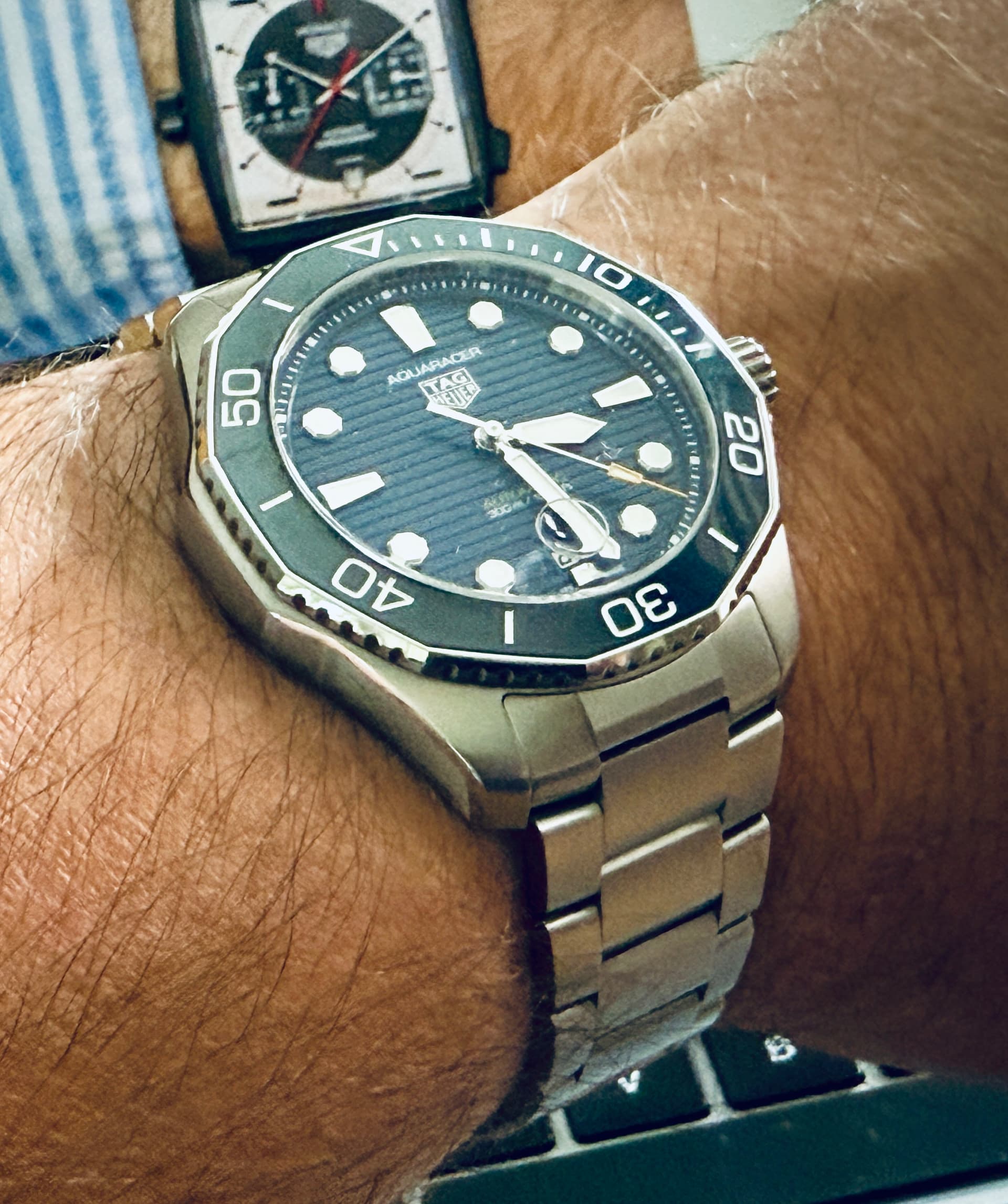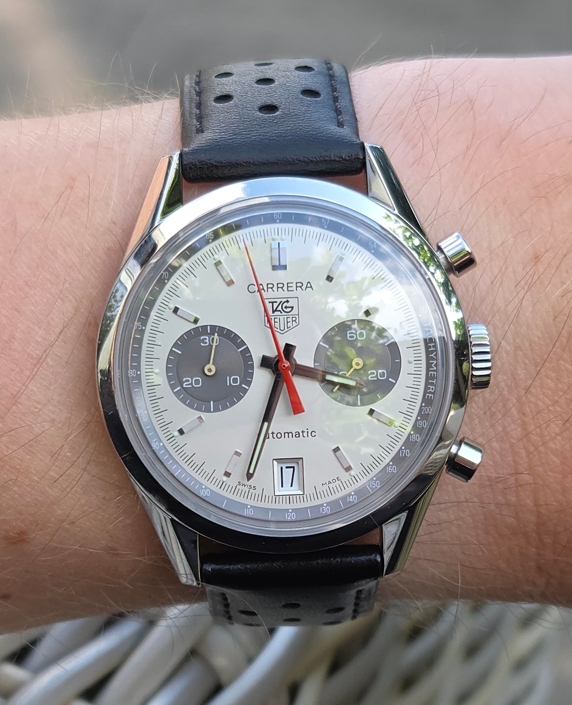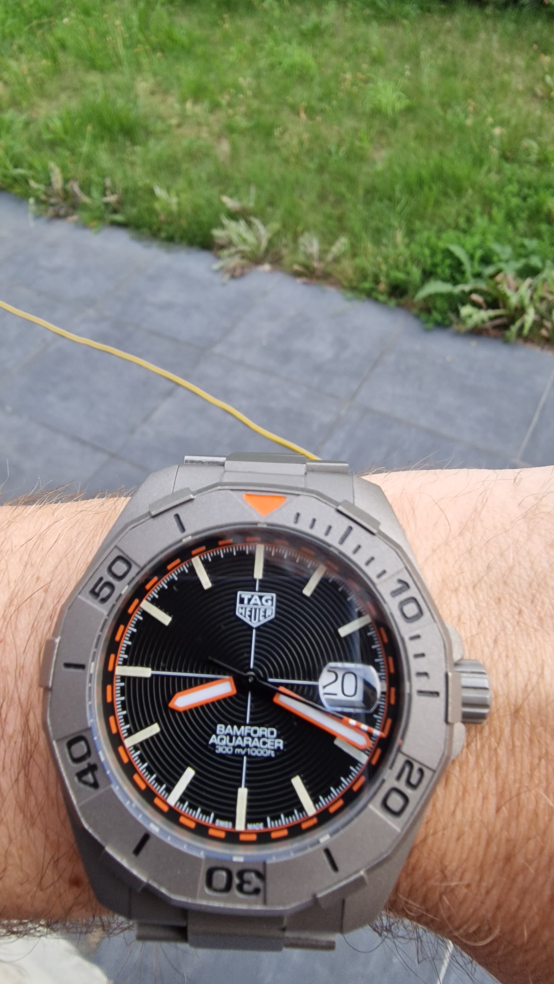 Vandaag om de pols gehad. 1 van 970. Oogt kleiner dan een gebruikelijke Monaco. Titanium met DLC. Zag er leuk uit maar werd er niet hebberig van.