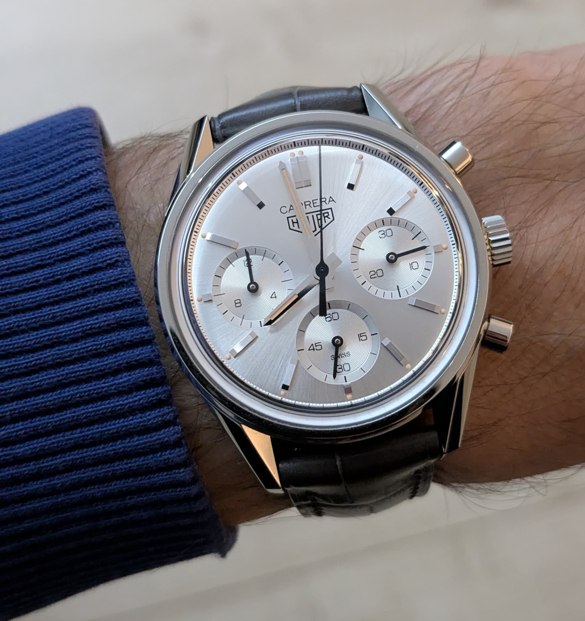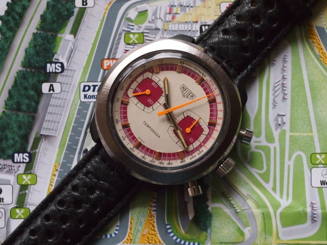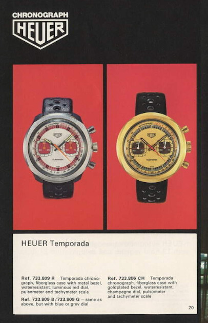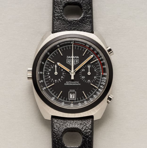Nog een relatief onbekend model. De Heuer Jarama. Vernoemd naar het circuit dat in 1967 werd gebouwd, aan de rand van Madrid. De Jarama verscheen voor het eerst in de catalogus van 1977 en werd aangeboden als drie modellen, die elk werden aangedreven door Heuer’s Chronomatic Calibre 12-uurwerk.