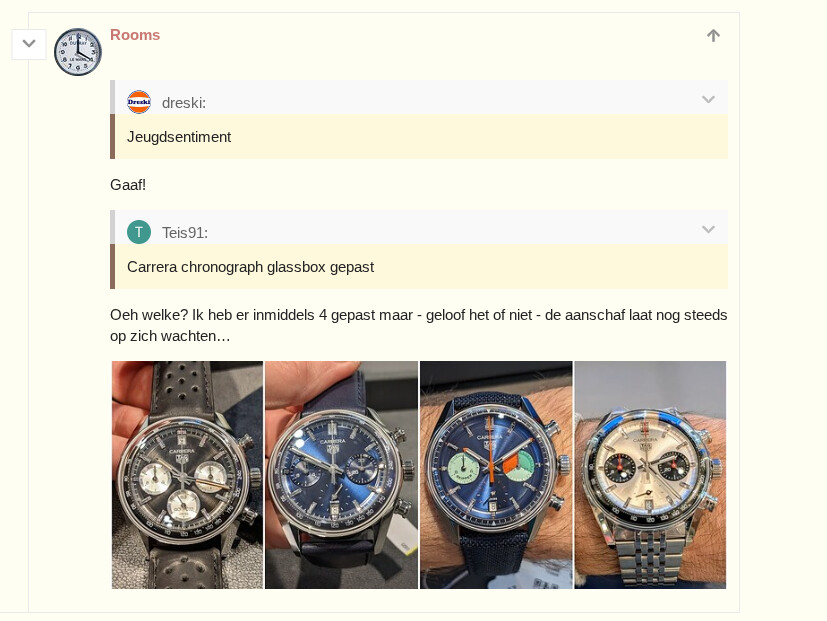 Maar, gaaf! Ik vind zelf de reverse-panda 't mooist. Maar zou, als ik er nú een zou kopen, voor de panda gaan - die trouwens niet in de poll voorkwam. Komt natuurlijk omdat ik al 'n reverse-panda Autavia heb. De Skipper is voor mij een goede derde, gevolgd door de blauwe. De paarse en de groene vind ik ook mooi. Maar vind ik misschien iets te specifieke kleuren.