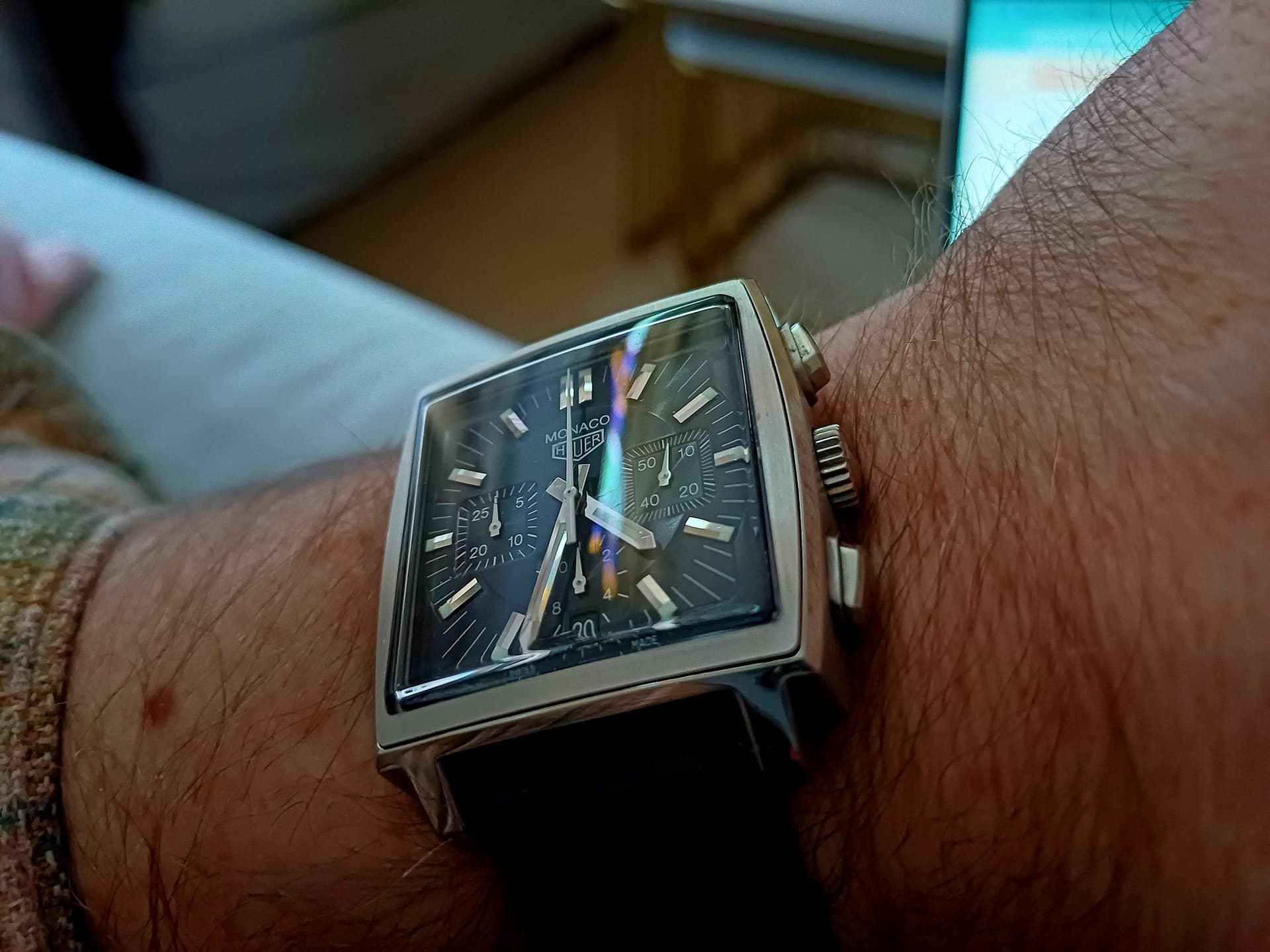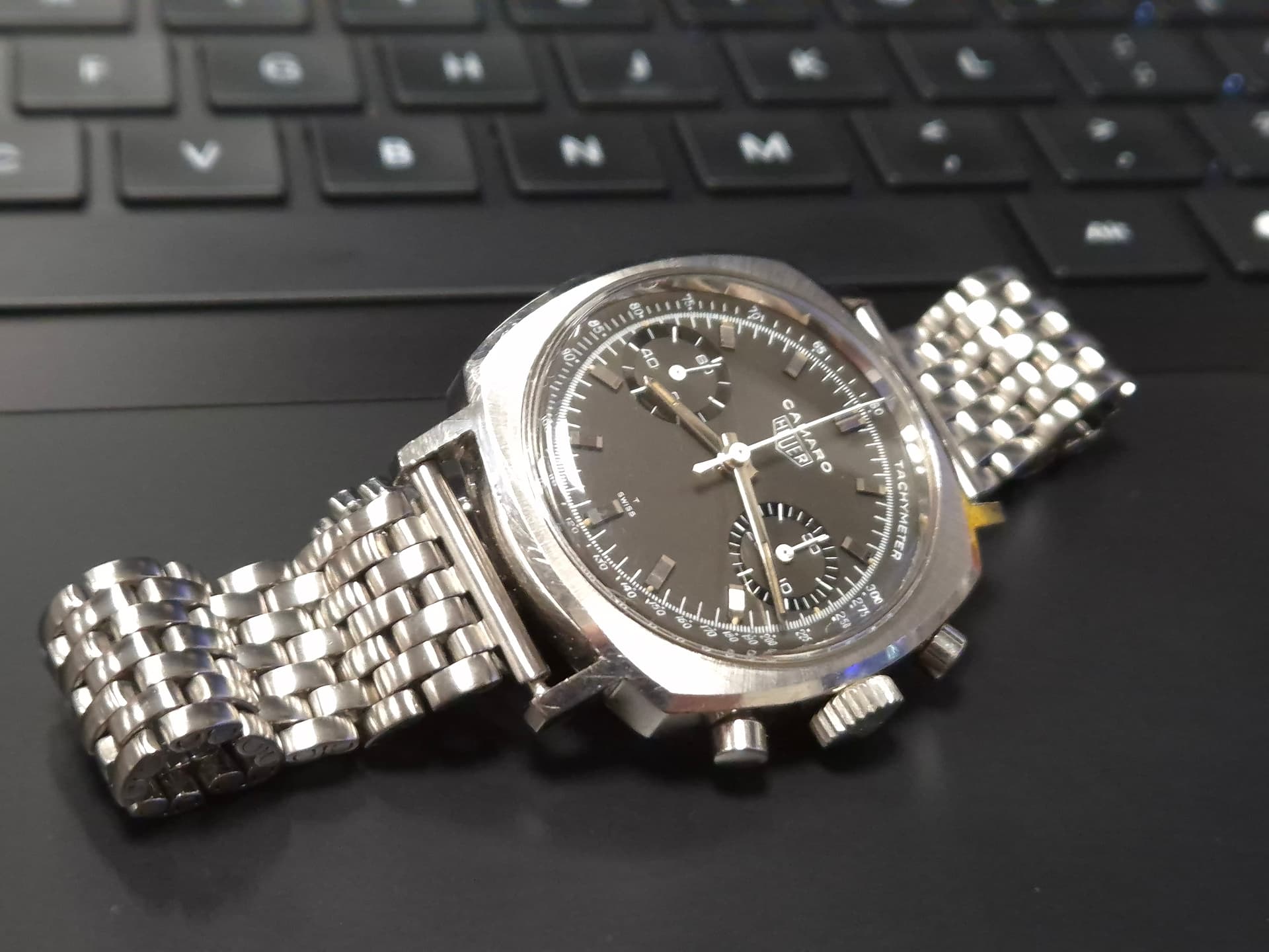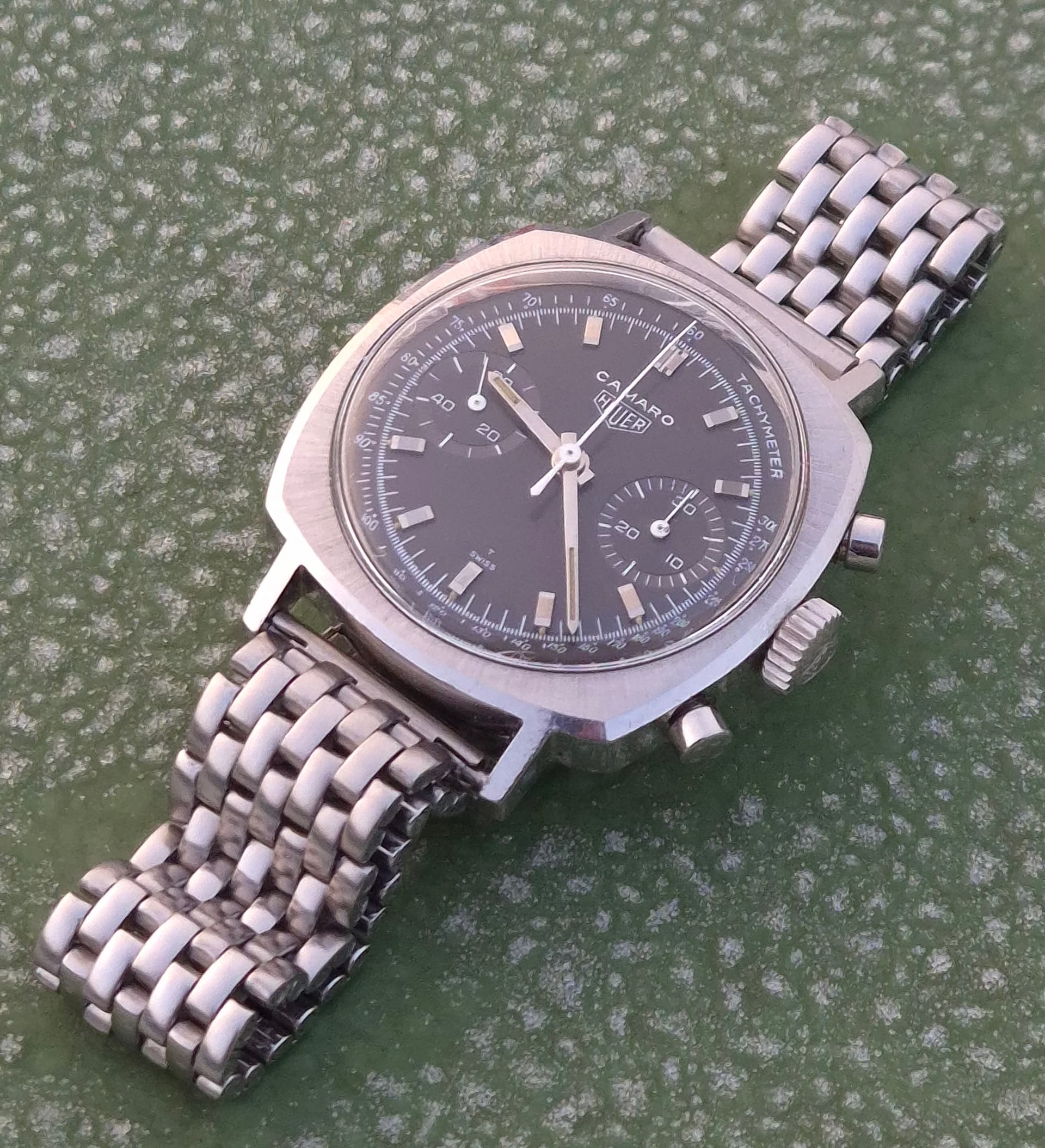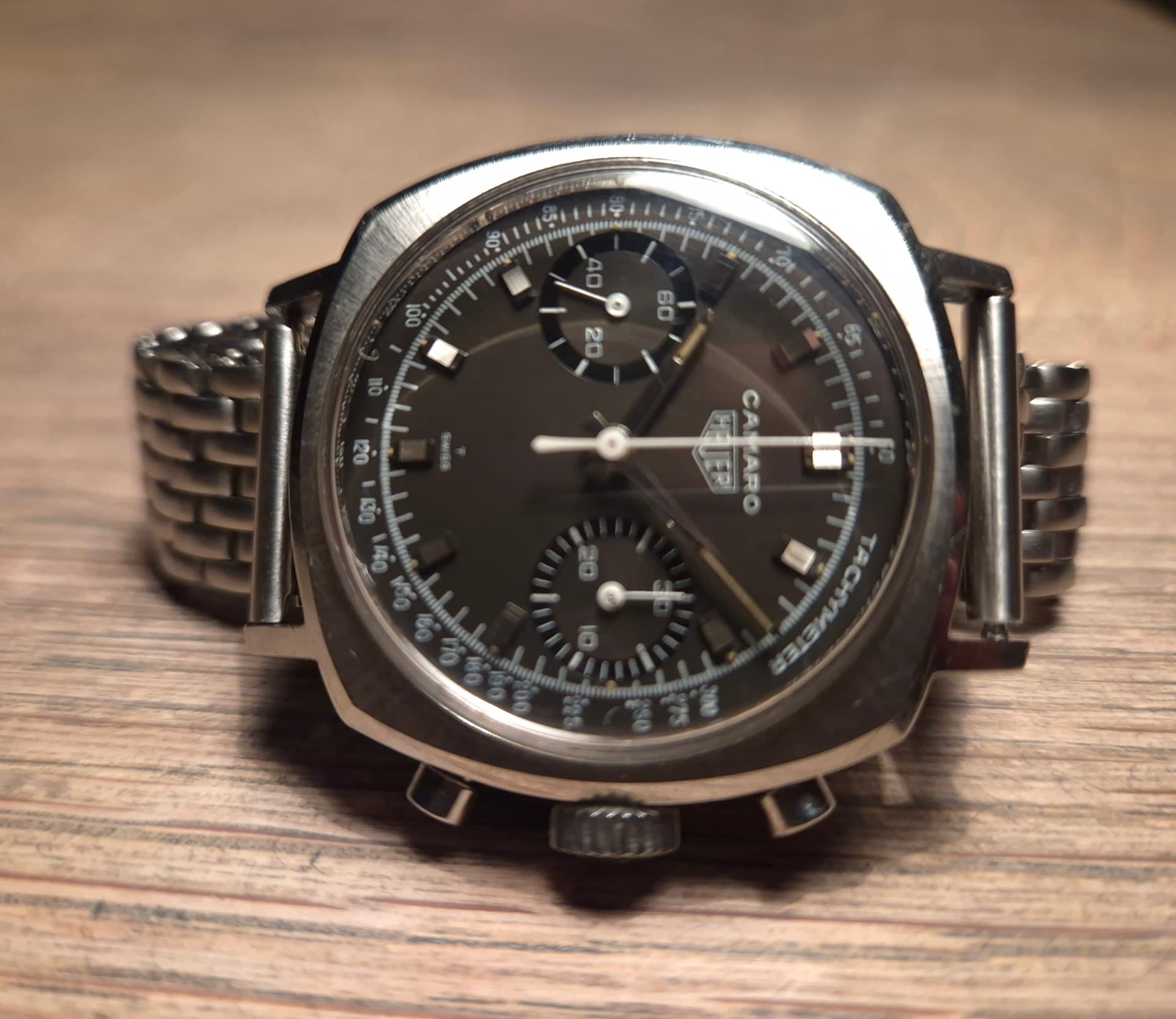 Yep, gisteravond opgehaald. Niet geschikt voor watch only liefhebbers (denk ik) maar in een collectie prima om af te wisselen. Gekke kast vorm, bruin verkleurde plaat (af fabriek noemden ze het charcoal en was het aards grijzig) maar met de subdials nog glossy. Met de tritium bollen nog aanwezig en een scherpe kast Zo wilde ik 'm graag. Nu nog een Heuer band vinden.