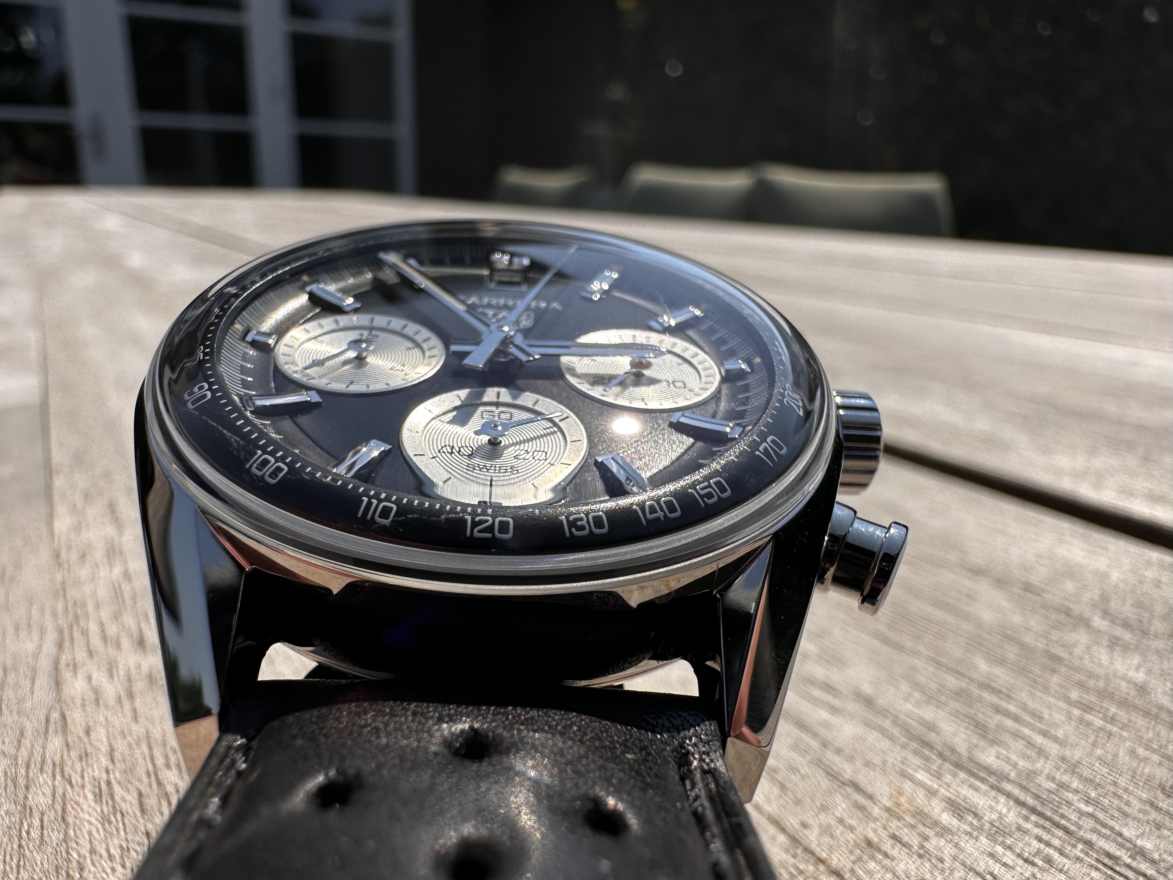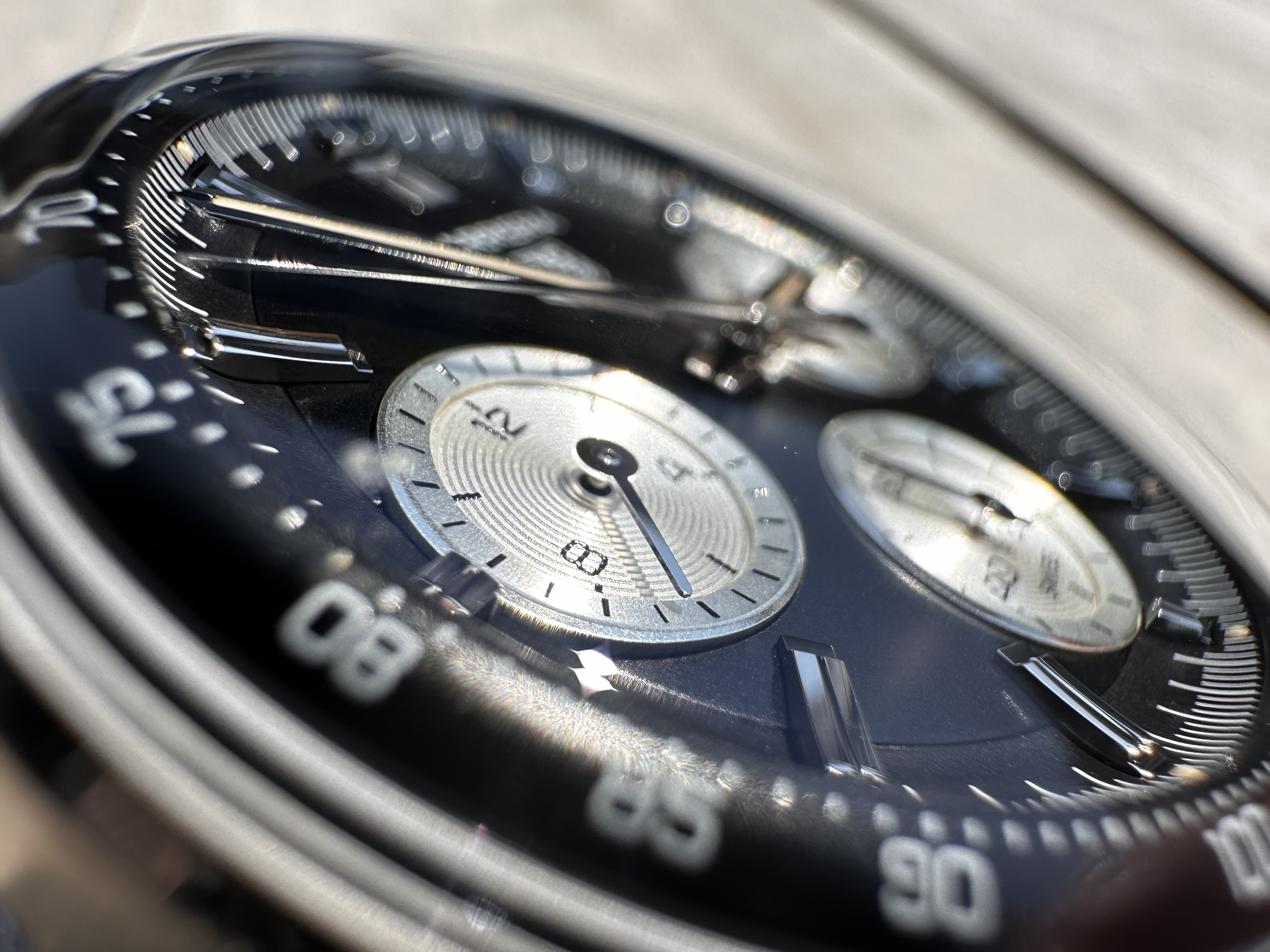 Mooie gestripte wijzerplaat, de onzichtbare running seconds subdial staat me tegen om maar helemaal niet te beginnen over die rare gebolde tachy bezel.