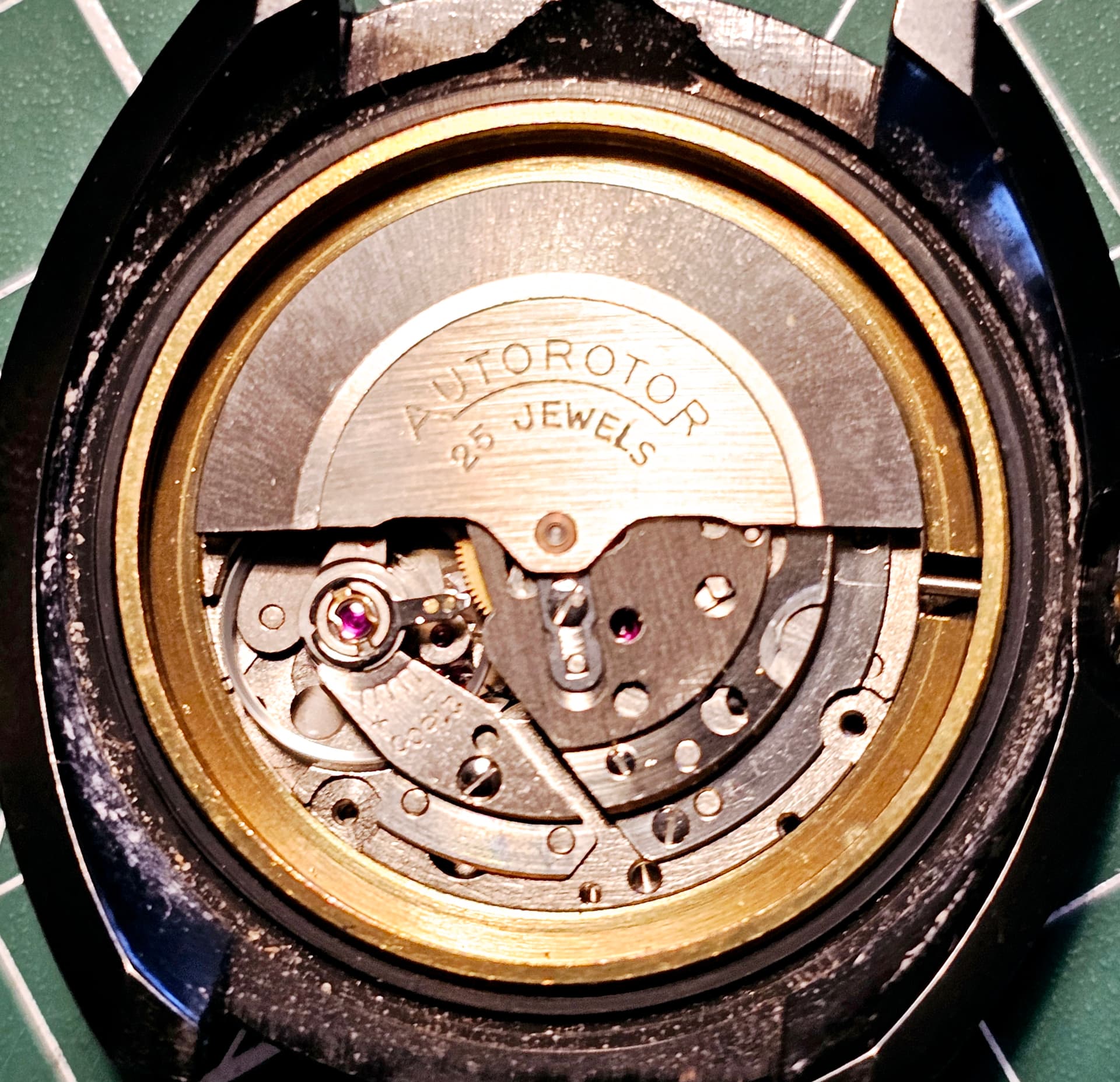 De stalen kast is vrij robuust (ongeveer 40 mm in diameter), typisch voor die tijd, en de wijzerplaat is klassiek met een werkelijk prachtige lichtreflectie (het horloge ziet er anders uit afhankelijk van de lichtinval.