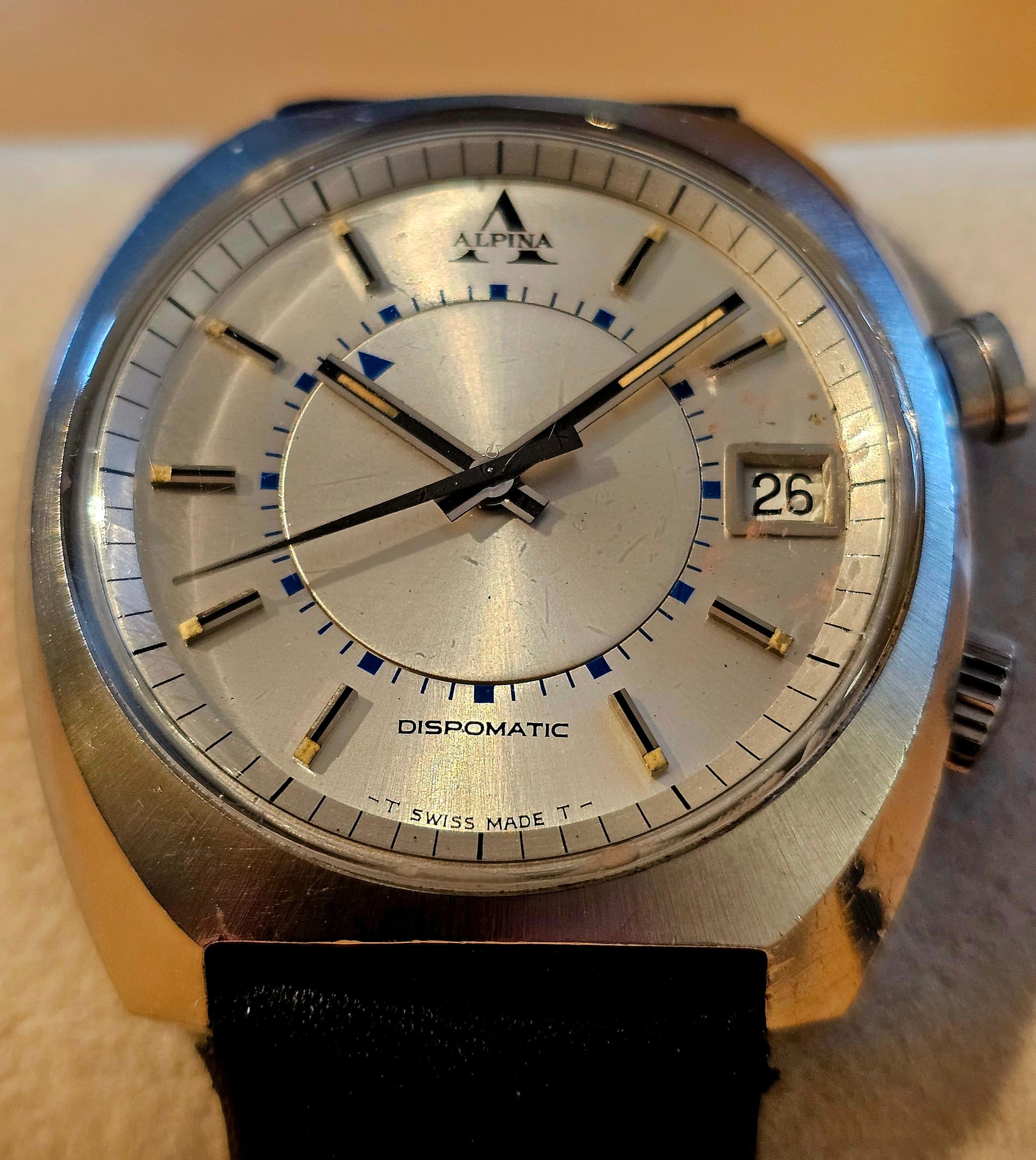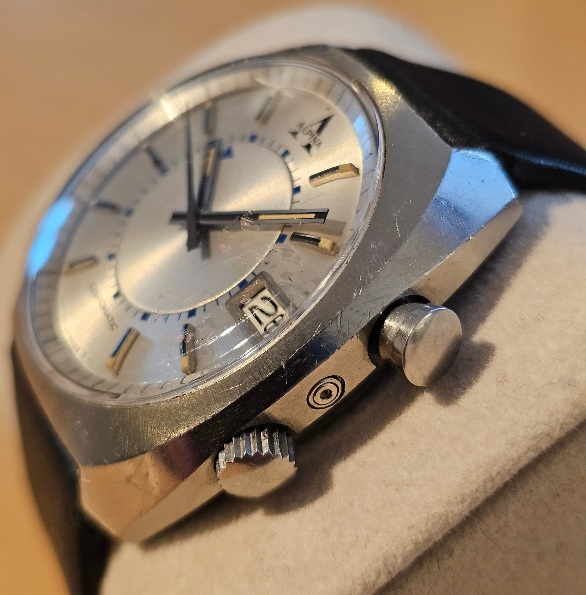Ik bied mijn Alpina Dispomatic aan, een automatisch Alpina-horloge met alarmfunctie. Het is in uitstekende staat en loopt (en rinkelt) zoals het hoort. gebruikssporen zijn zeker aanwezig, maar is verder niet gepolijst. Het kaliber 2980 is nauw verwant aan het Lemania 980, dat Omega, de klant van Lemania, gebruikte in de “Memomatic”.
