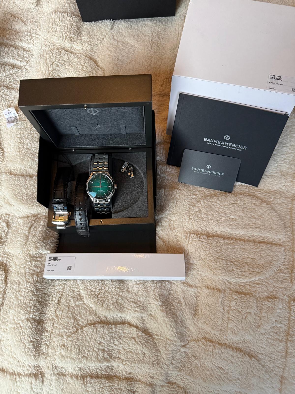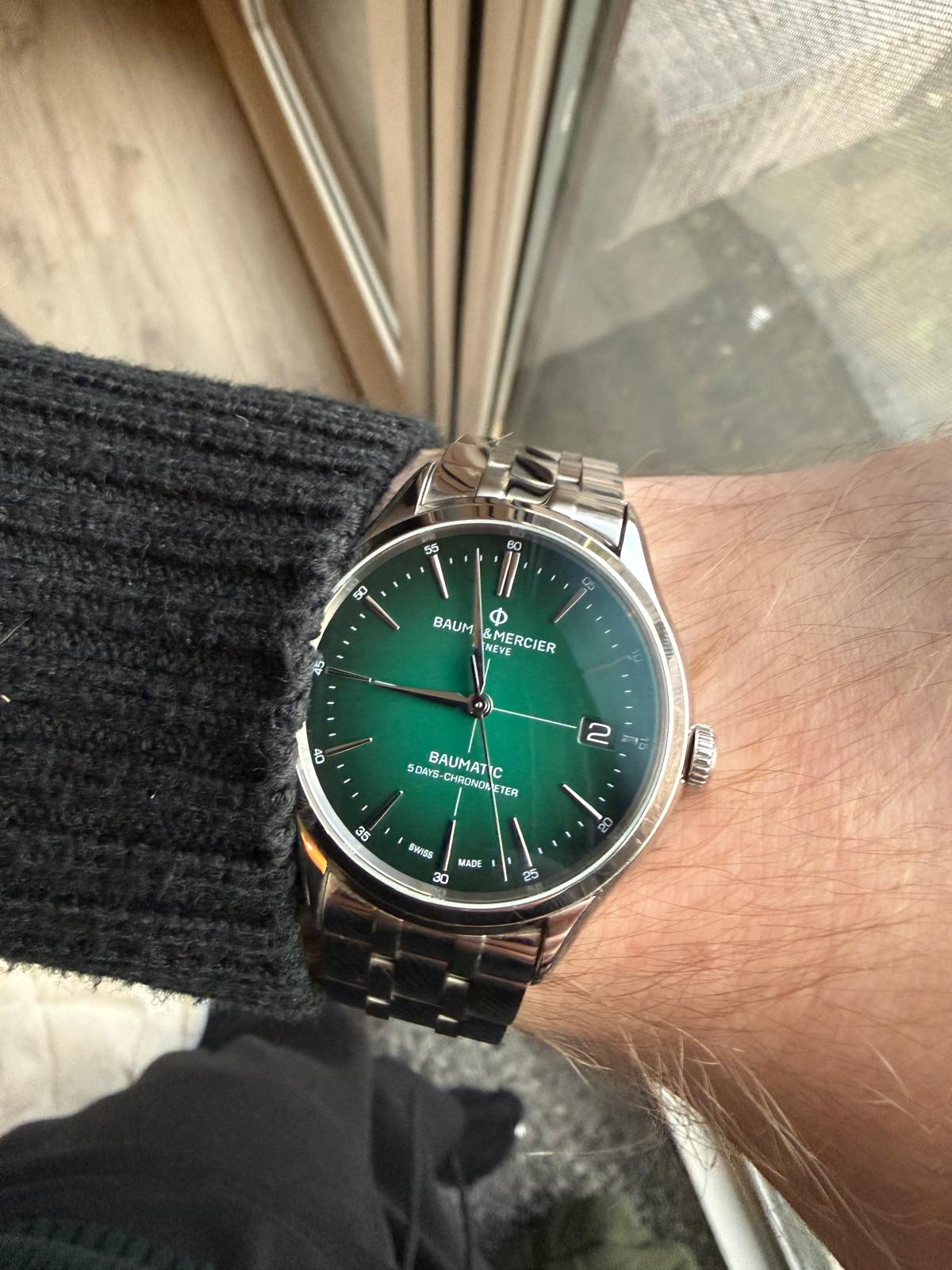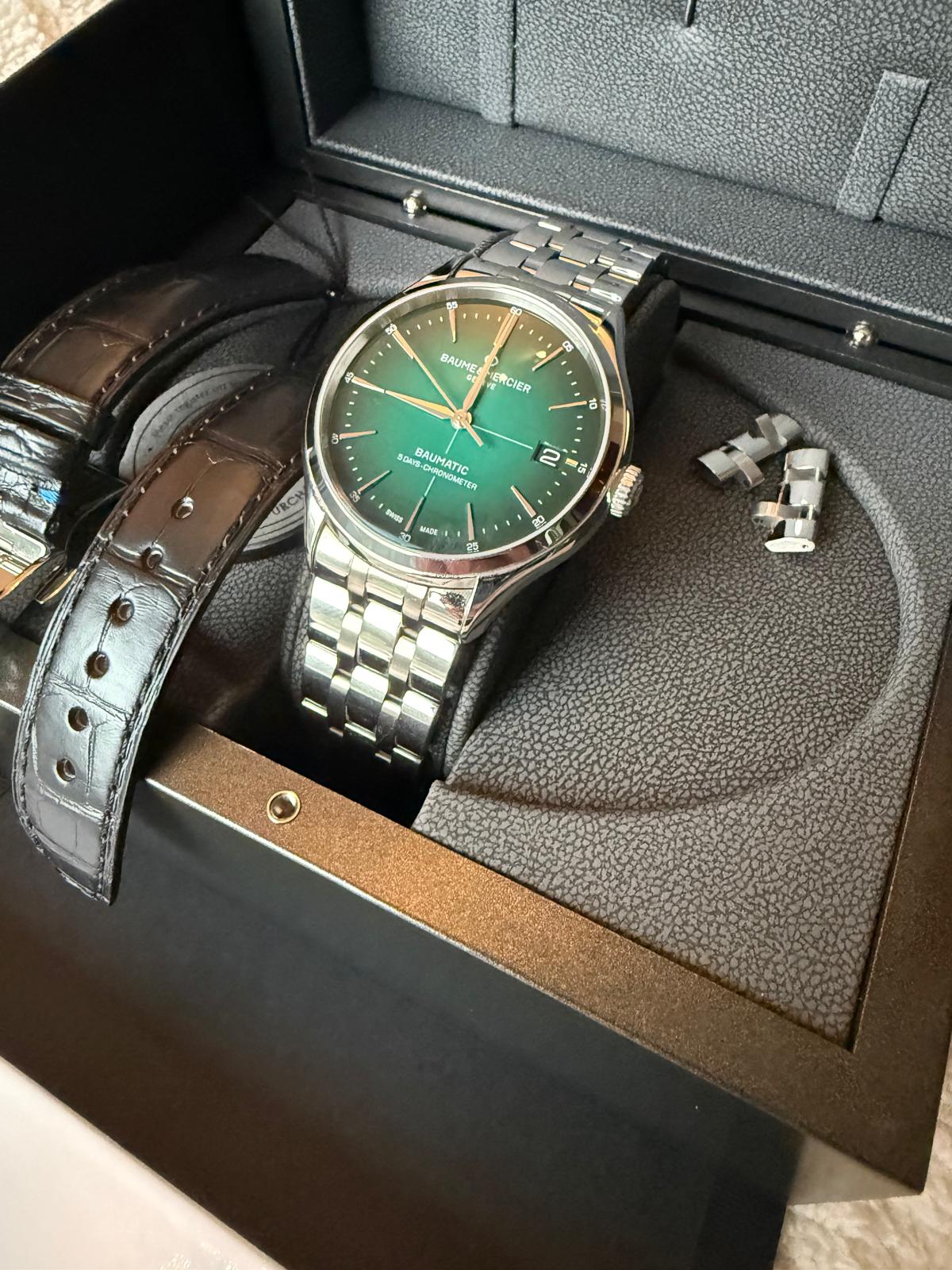 Leuke bijkomstigheid: dit horloge komt standaard niet op de stalen band. De groene variant wordt alleen met op zwartleren band, met Baume Mercier sluiting, verkocht. De stalen band heb ik rechtstreeks bij Baume Mercier besteld, t.w.v. € 740(!). De leren band is daarom ook volledig ongebruikt. Er zitten twee extra schakels bij de stalen band en mijn polsen zijn 20cm in omtrek.