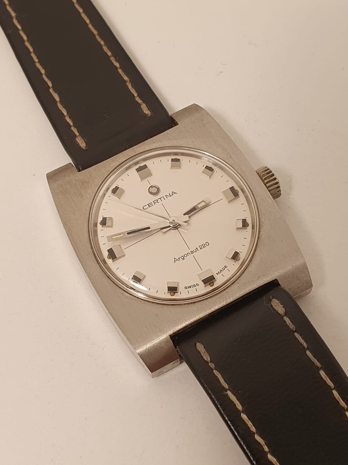 Uit mijn vintage collectie mogen ook een aantal horloges vertrekken. Zoals deze met een nette Certina Argonaut 220 met een charmante vierkante kast. Gekocht toen ik mooie vierkante vintage horloges aan het verzamelen was. Aangeschaft op een veiling als NOS.