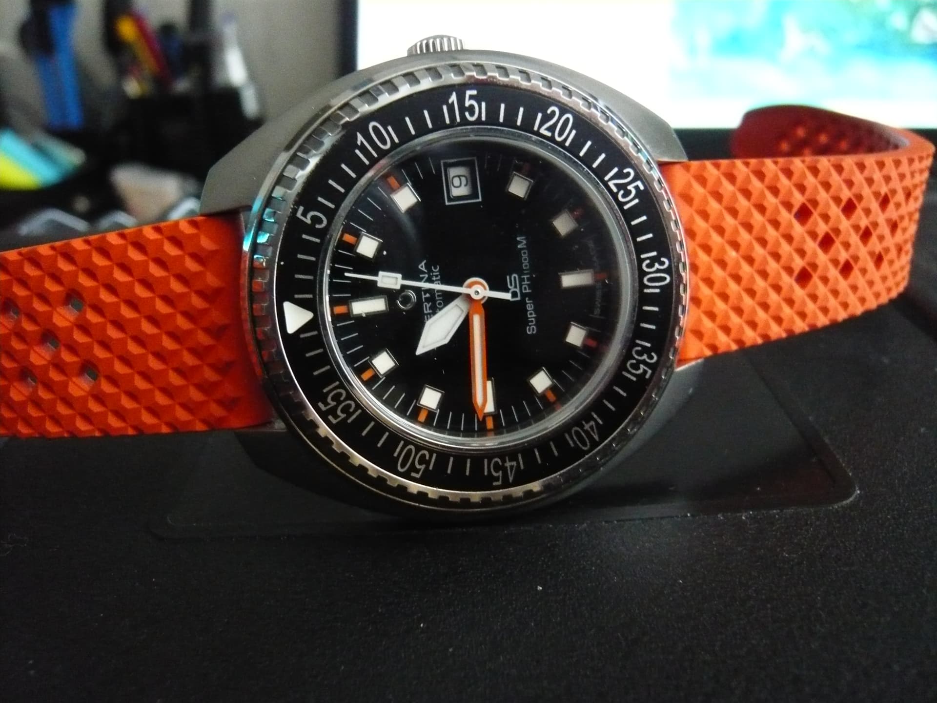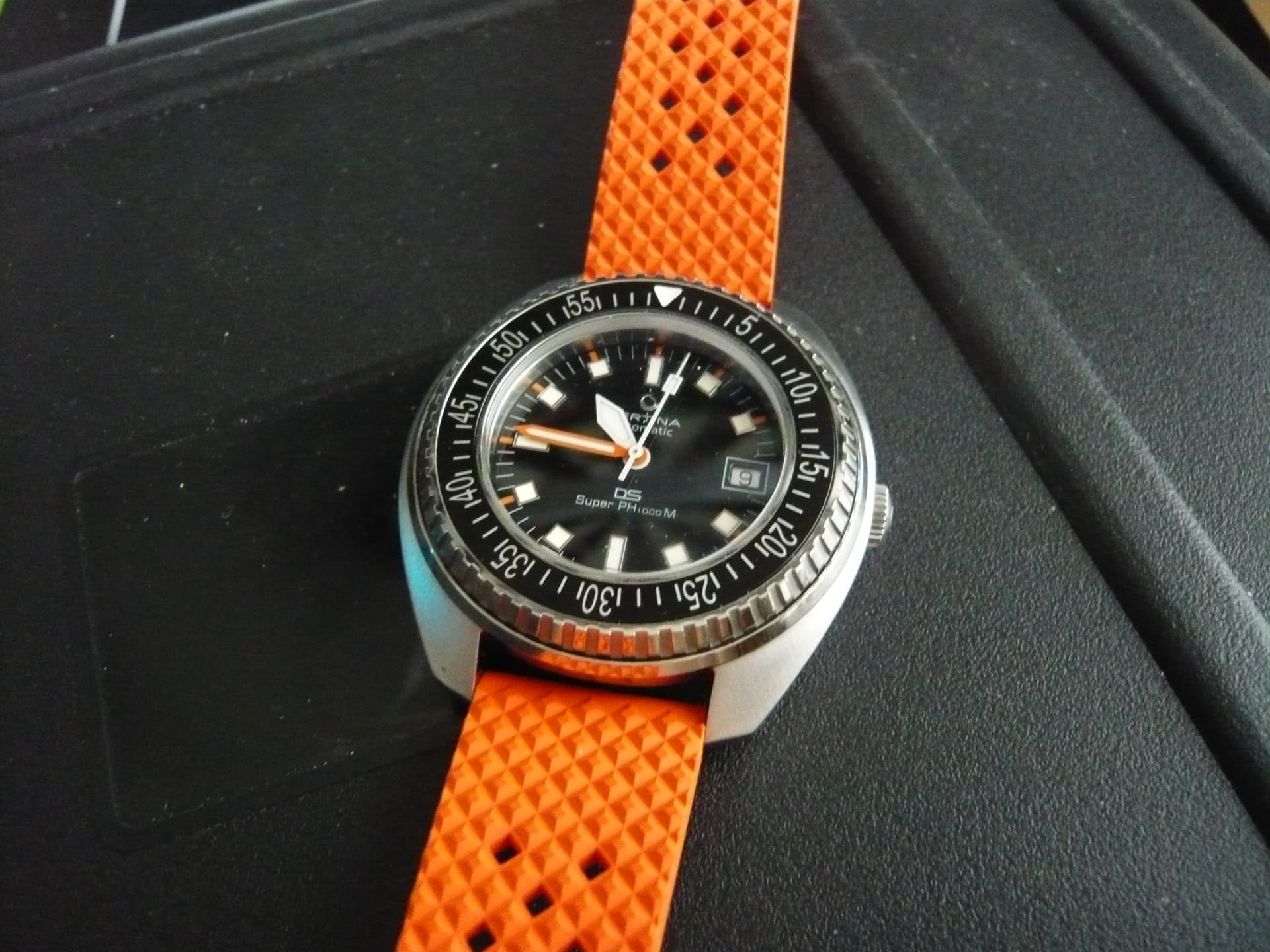 Een supergave duiker maar zoals leden wel gemerkt hebben ben ik heel veel van de collectie aan het wegdoen. Hierdoor kun je deze in topstaat voor een mooie prijs kopen. Hij is prima draagbaar voor kleine polsen door de korte lugs. De Nylonband van Certina is erg cheapo en daarom doe ik er een Oranje FKM strap bij. Heerlijk rubber dat geen stof aantrekt.