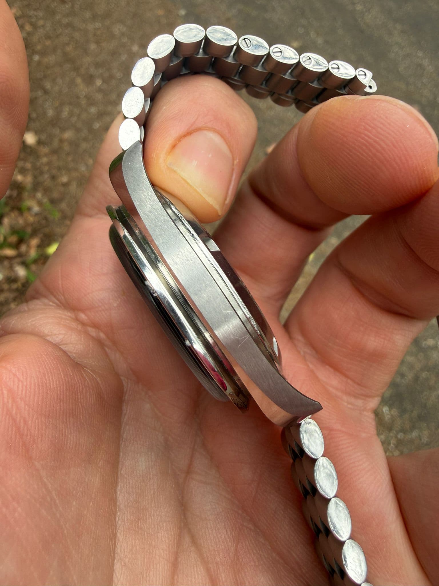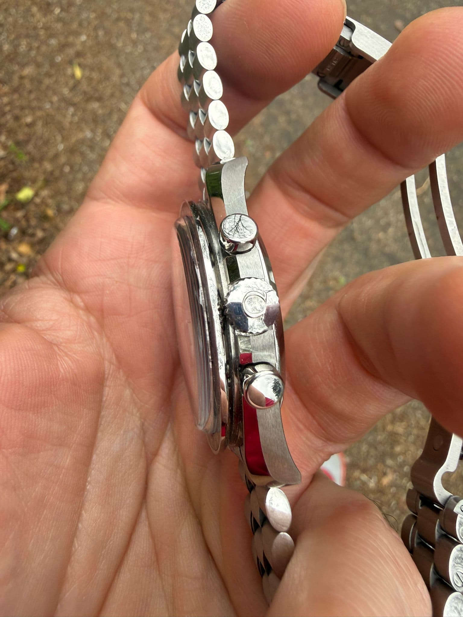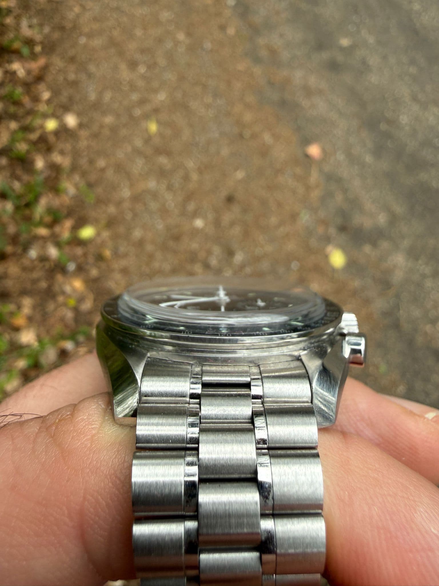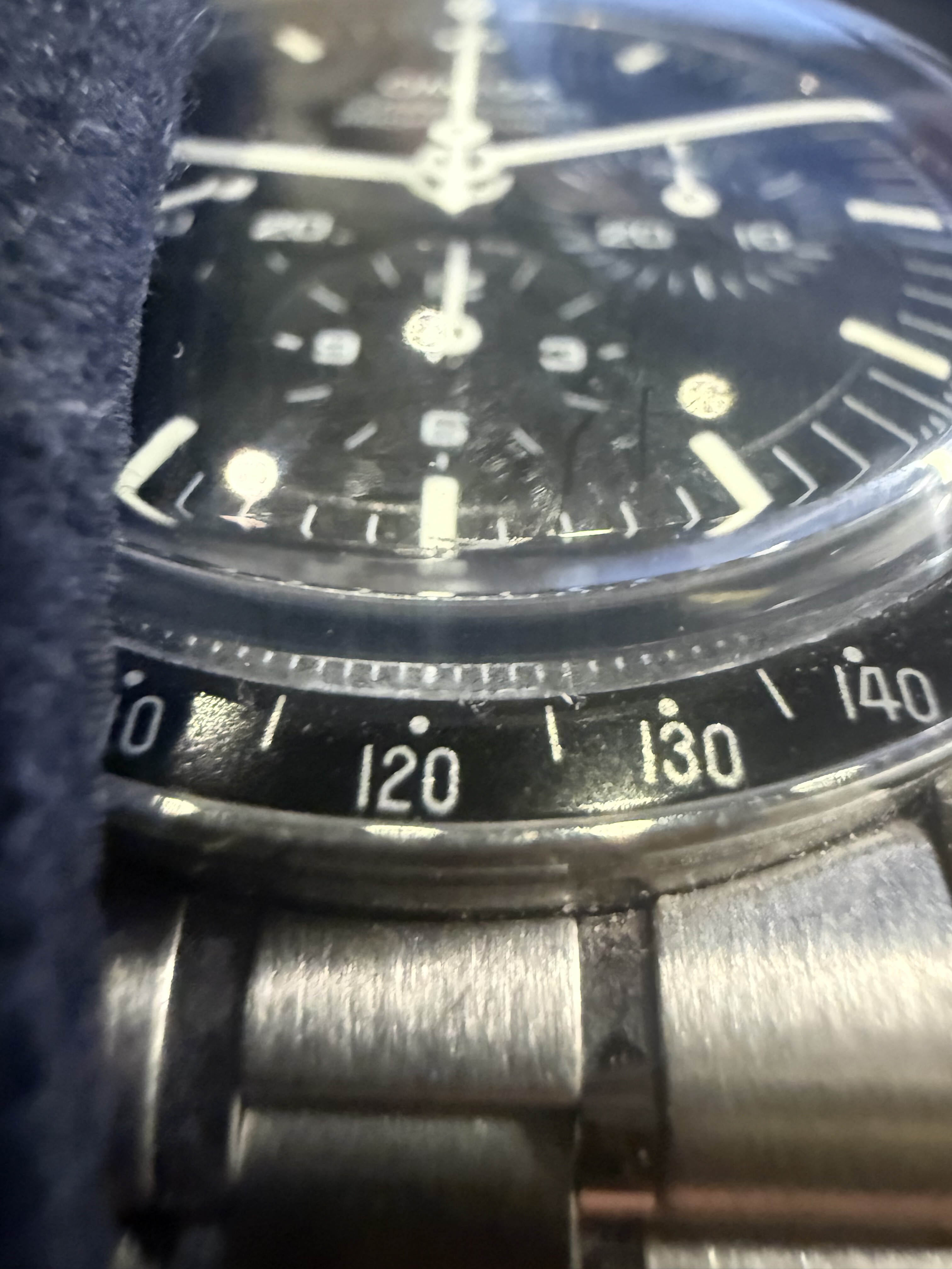 Conditie Horloge is veel gedragen. Dat is enigszins zichtbaar. Meest opvallend is een kras op het saffier op 6 en een behoorlijke kras tussen de lugs. Deze is niet zichtbaar wanneer de bracelet erop zit.