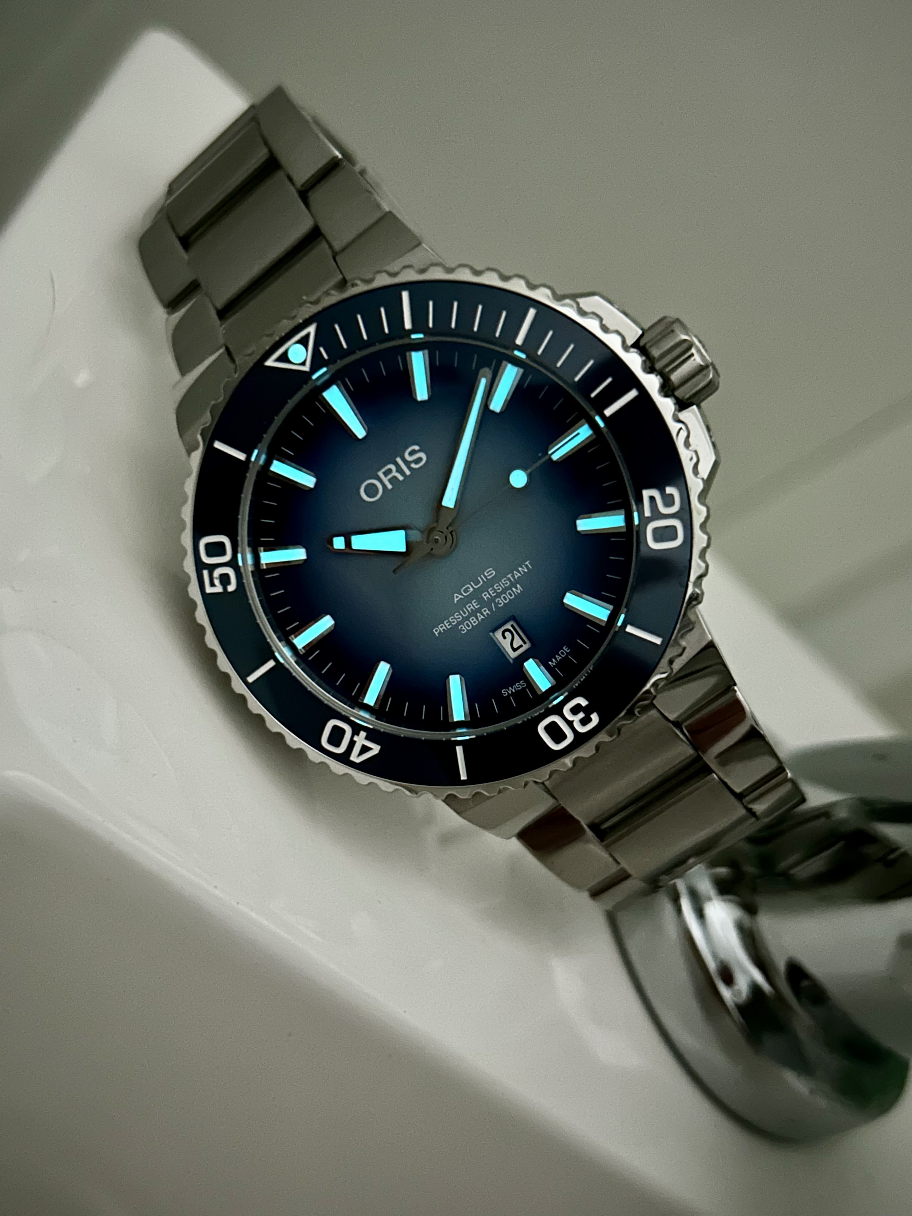 Te koop aangeboden mijn in mooie staat verkerende Oris Aquis Lake Baikal Limited Edition. Van deze Oris zijn er 1999 exemplaren uitgegegeven, dit is nummer 0163. Het prachtig blauw moet de kleur van het Baikal Meer weerspiegen, het diepste meer ter wereld.