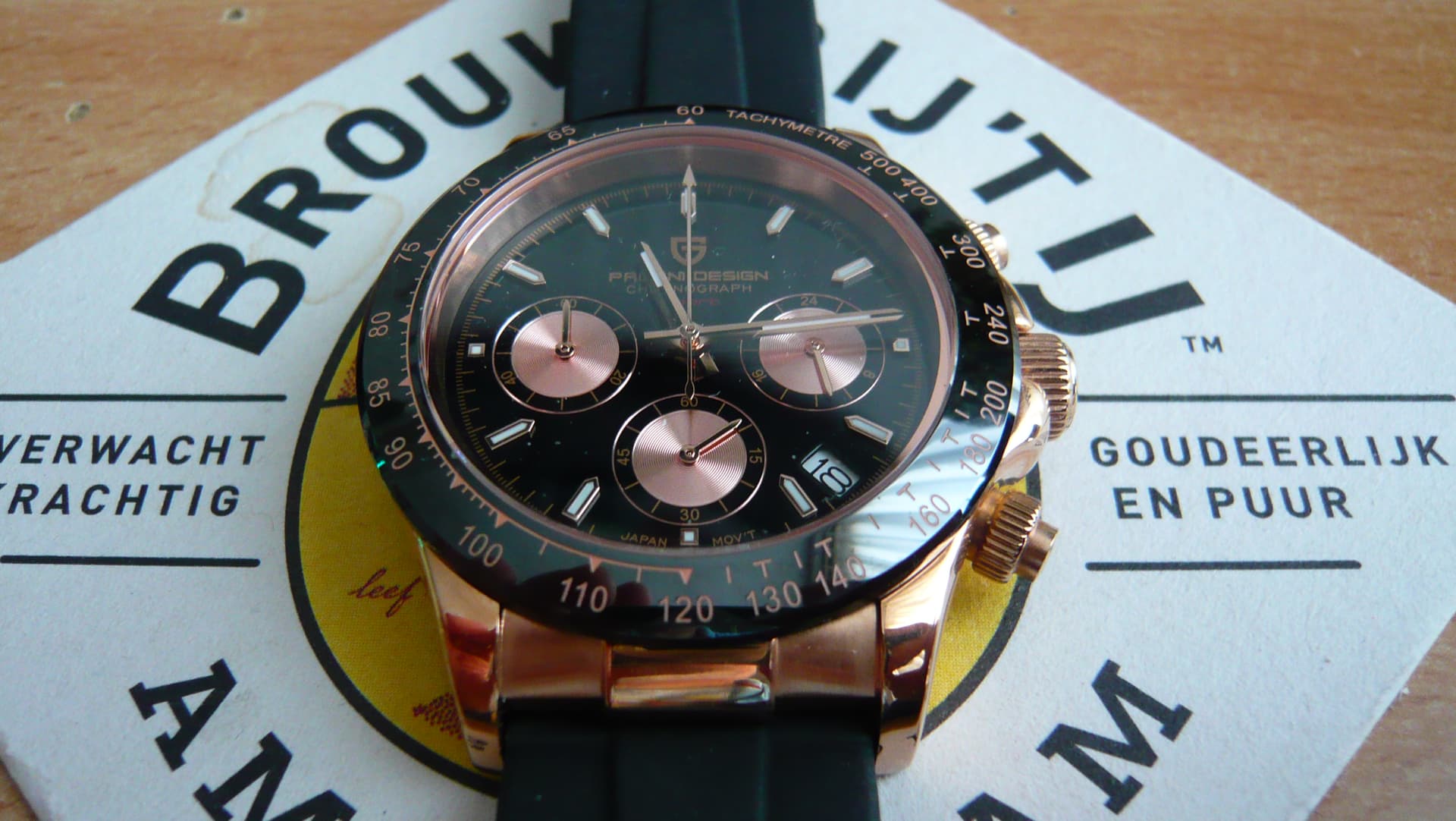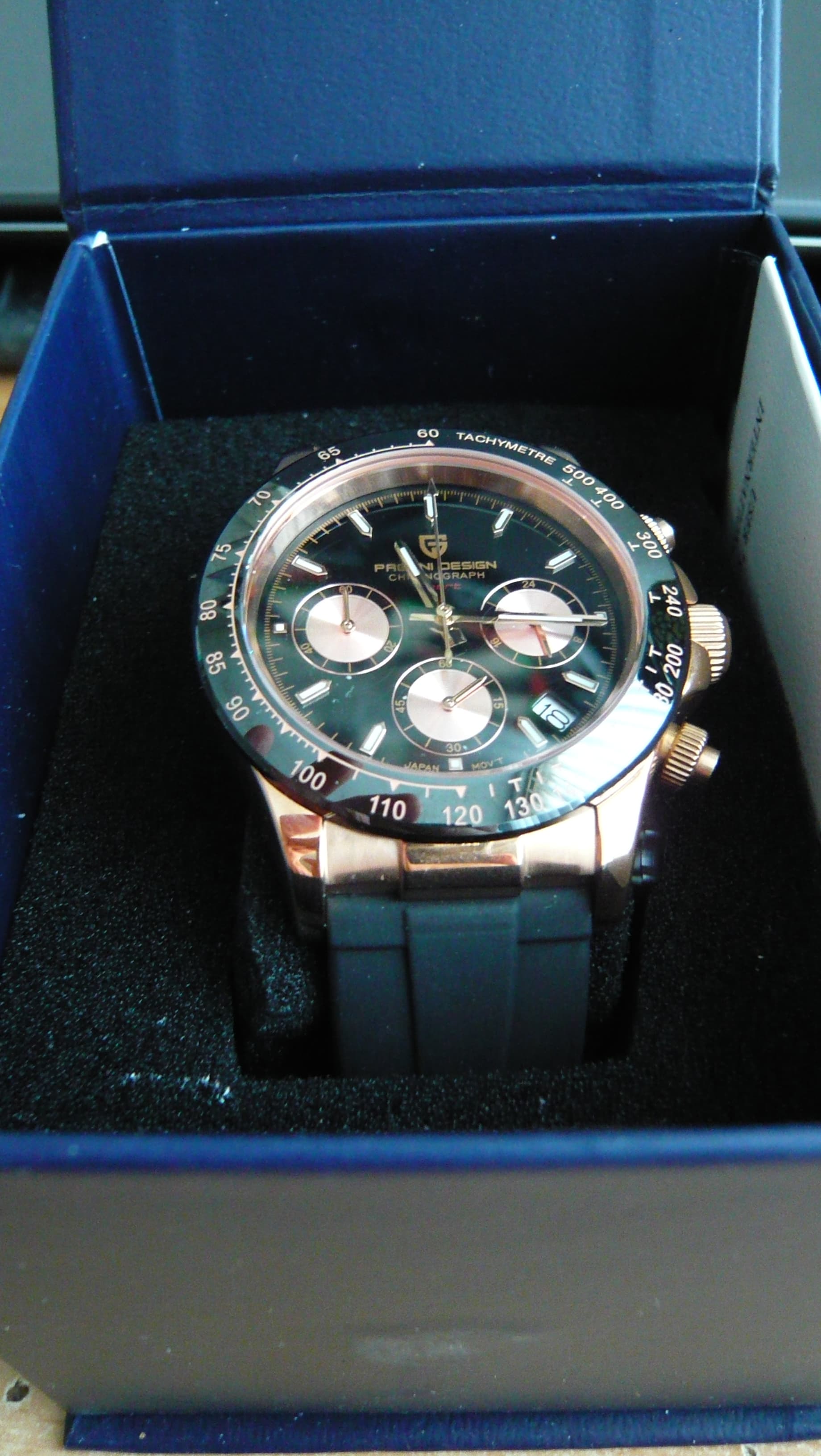 Deze besteld omdat ik hem wel eens in het echt wilde zien. Prijs kwaliteit verhouding is erg goed. De pushers zijn zelfs geschroefd alvorens je de chronograph kan bedienen die overigens een meca quartz uurwerk heeft. Bizar voor dat geld. Ik draag echter geen rose goud kleur omdat dit vloekt met mijn zilveren sierraden. Deze mag dus door voor een klein prijsje