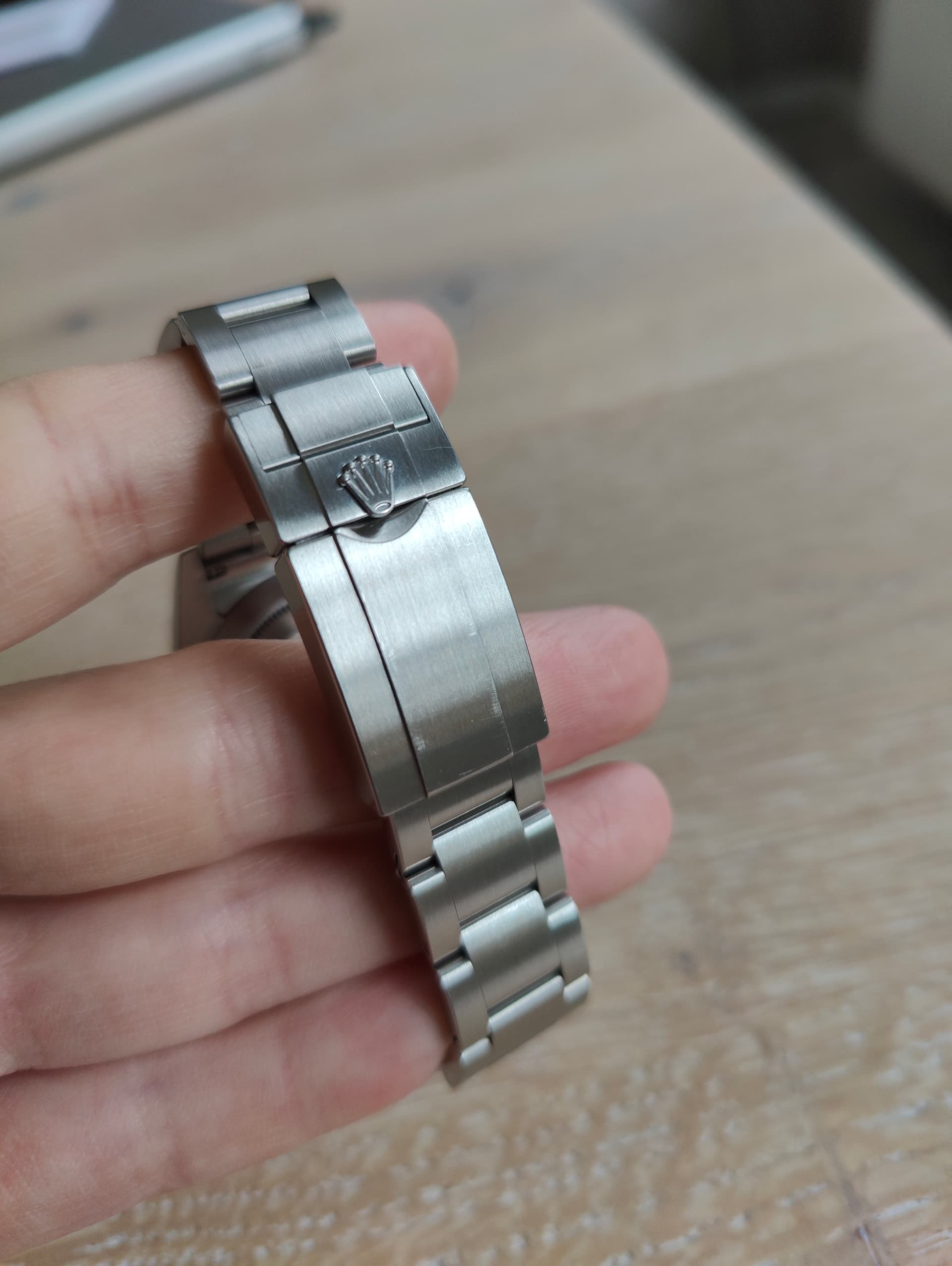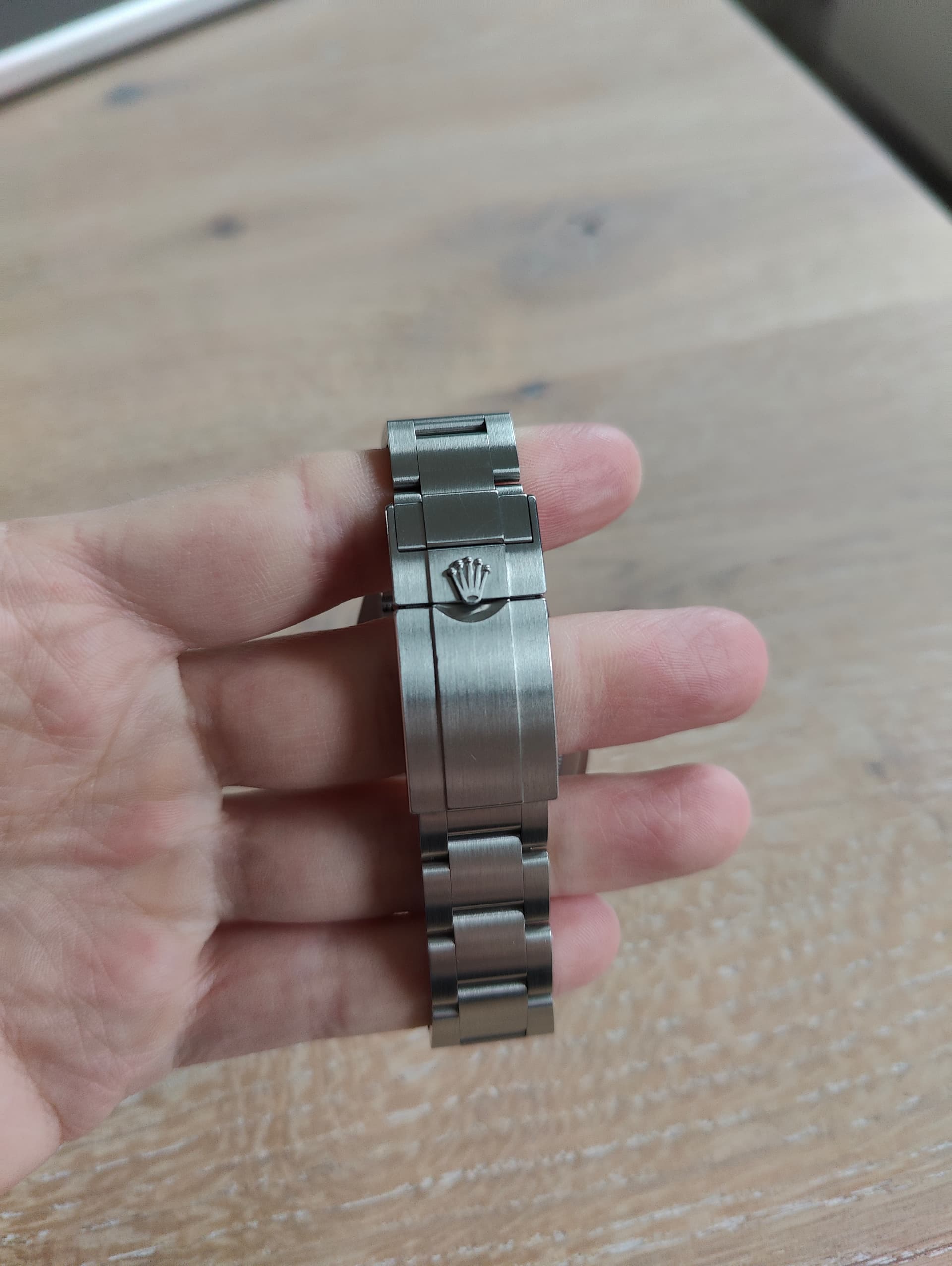 Conditie (krassen, werking etc): met plezier gedragen, dus heeft hierdoor de nodige lijntjes. 1 dieper krasje op de lug rechtsonder (zie foto). Verder wat gebruikelijke haarlijntjes op de bezel, band, clasp en aan de achterkant vd lugs door bandenwissel. Heb alles zo goed mogelijk geprobeerd op foto te krijgen.