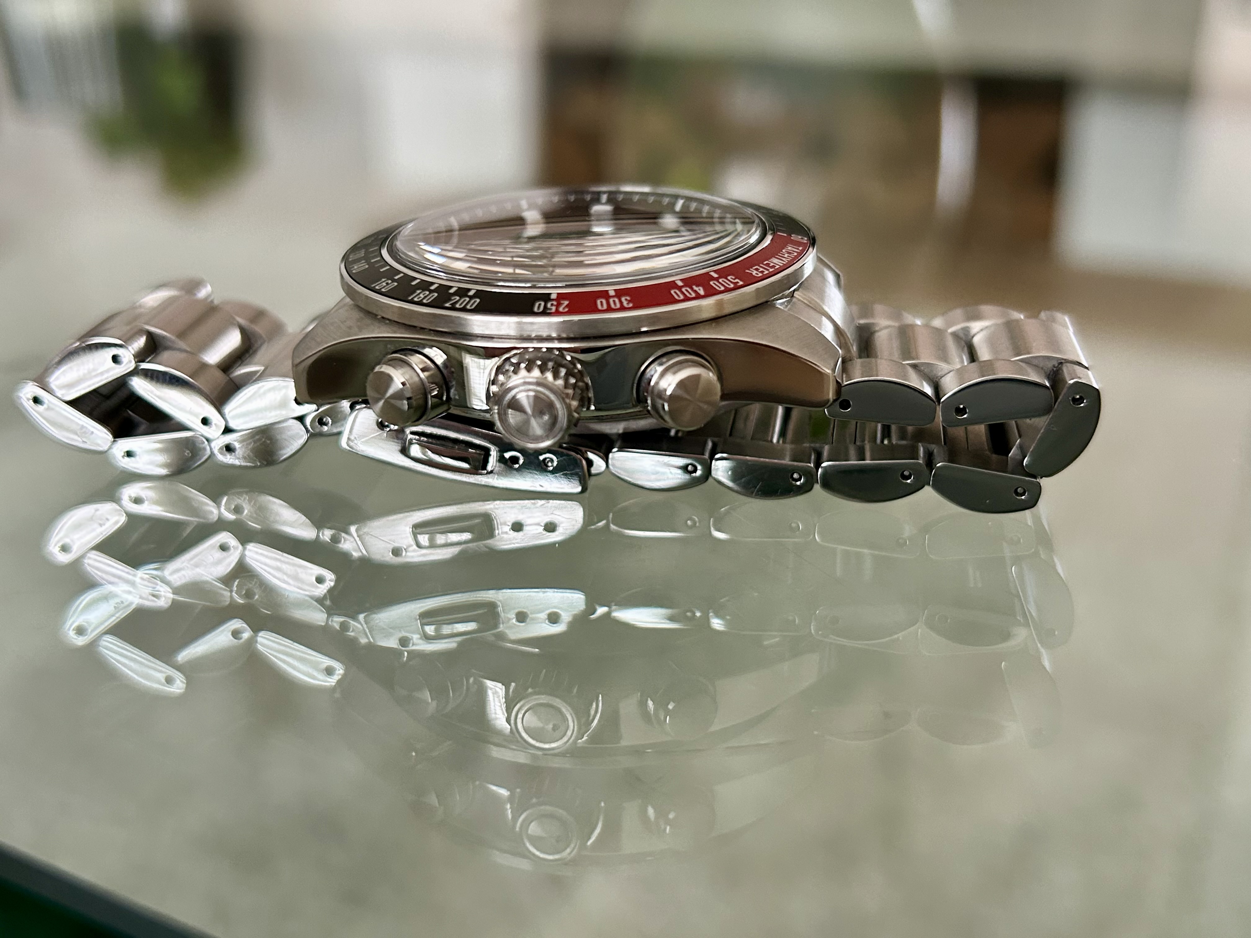 Geen krassen op het saffier of bezel, chrono reset exact naar nul, stalen band op volle lengte en datum wijzigt zoals het zou moeten. Wordt geleverd met volledig ingevulde/gestempelde garantiekaart (02/2025 Japan geleverd).
