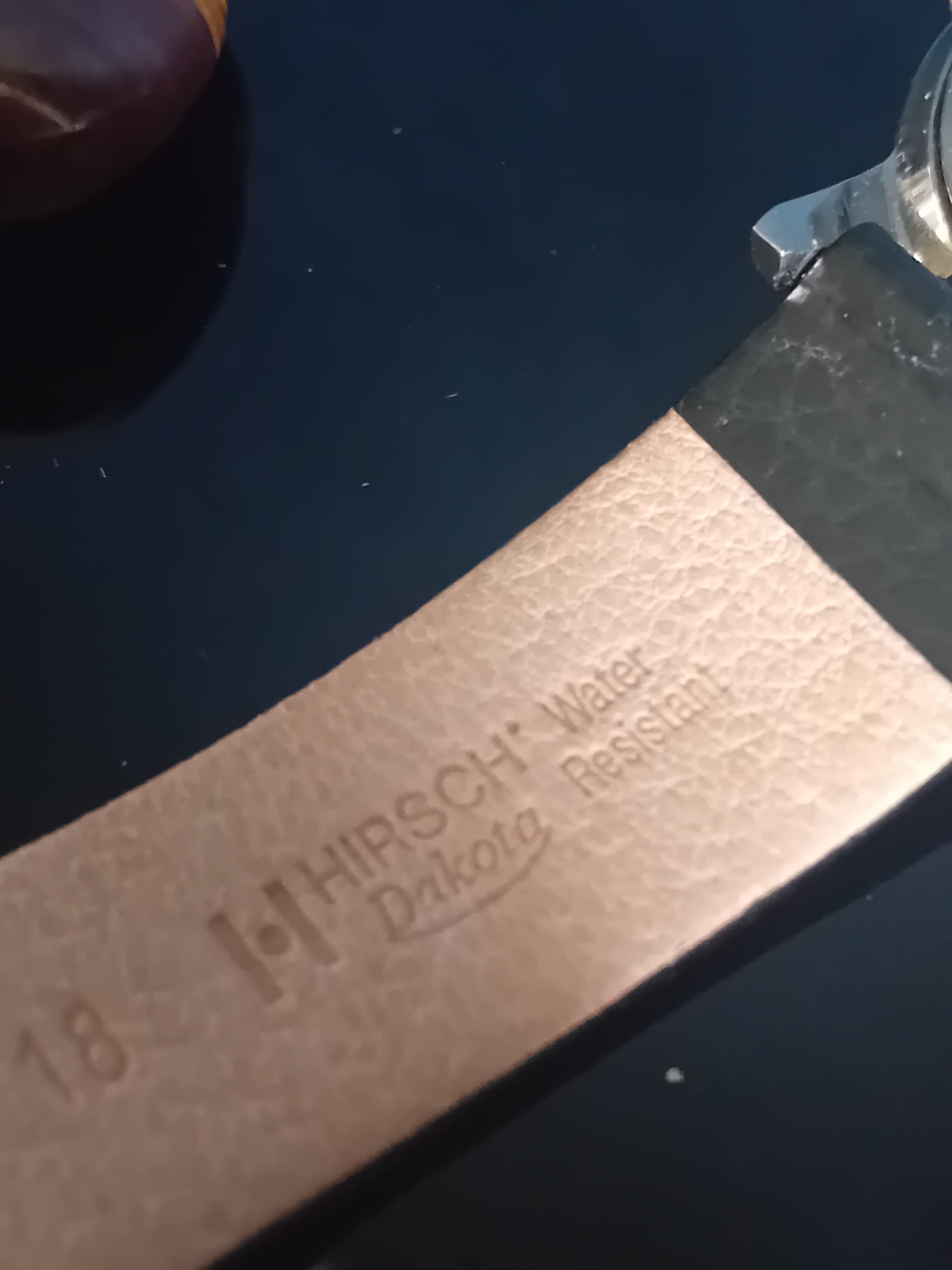 Aan het horloge zit een mooi zwart Hirsch Dakota bandje maat 18.