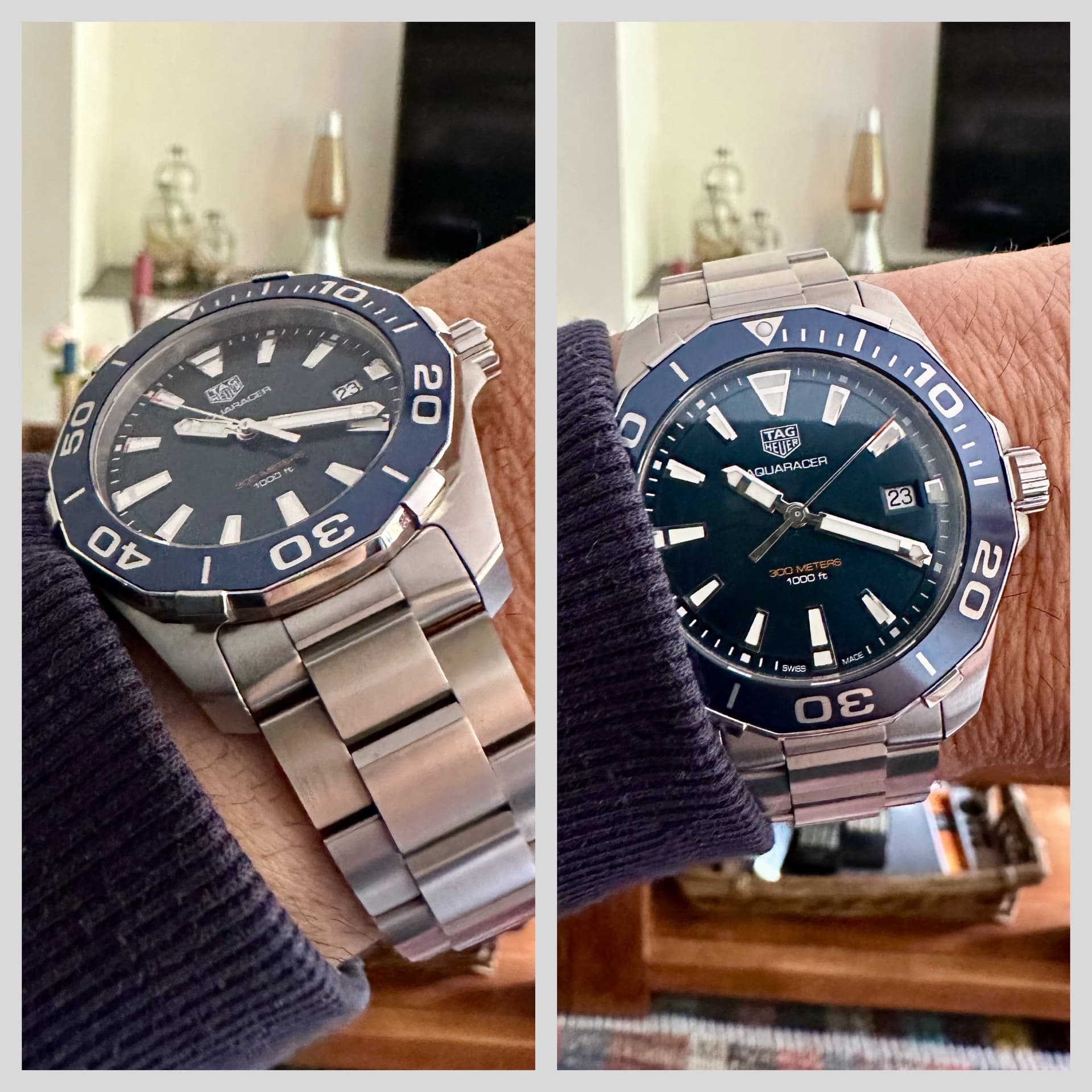 met 41mm en op de blauwe rubberband van Tag is het zeker sportieve duiker en mijn Grab en Go omdat hij quartz is en daarmee altijd op tijd en lekker draagt door zijn compacte dikte. Op de stalen band is het weer een heel andere stoere verschijning.