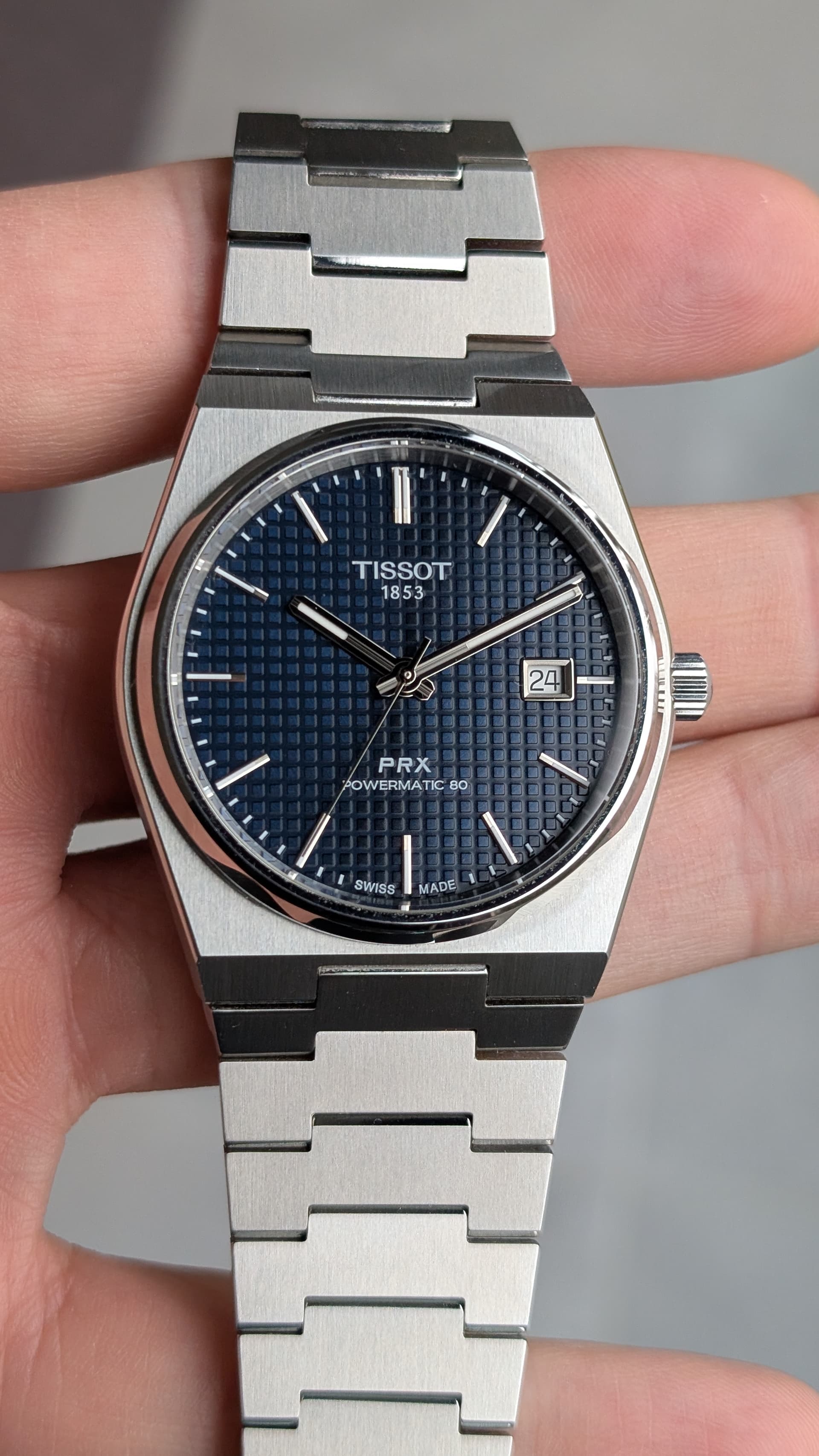 Aangezien er weer een aantal horloges bij zijn gekomen dit jaar, moet er ook weer plaats gemaakt worden. Daarom verkoop ik mijn in zeer goede staat verkerende Tissot PRX. De mooie blauwe wijzerplaat moet je in het echt meemaken om al zijn variatie te kunnen zien. De sunburst en wafelstructuur zorgen voor vele verschillende kleurovergangen, van donker, bijna zwart, tot mooi, zacht blauw. Het bandje is zeer comfortabel en speelt mooi met het licht, door de gepolijste stukjes in combinatie met de geborstelde band.
