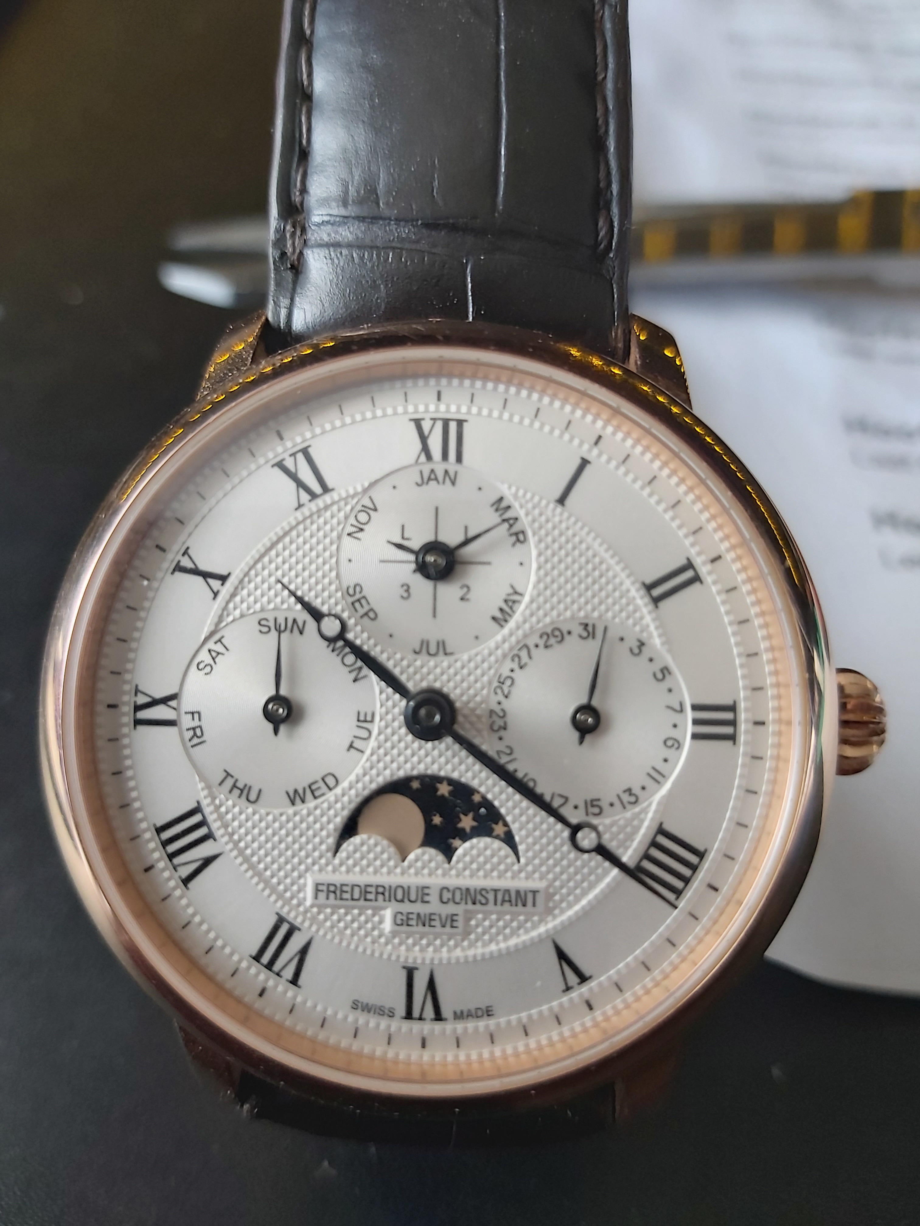 Het eventueel opnieuw instellen van dagen/maanden/jaren gaat bij dit manufacture FREDERIQUE CONSTANT uurwerk (zelf ontwikkeld) zeer eenvoudig door het indrukken met een stiftje of tandenstoker van een 4 tal kleine “push buttons” verstopt in de zij-rand van het uurwerkhuis. Dit is een heel eenvoudig klusje van minder dan een minuut en zelf te doen. Dit in tegenstelling tot b.v. IWC waarbij het horloge terug moet naar de leverancier en (naar ik me heb laten vertellen) van een zeer vorstelijke rekening van ca. €1500,-- (met een onderhoudsbeurt ) terug is te ontvangen