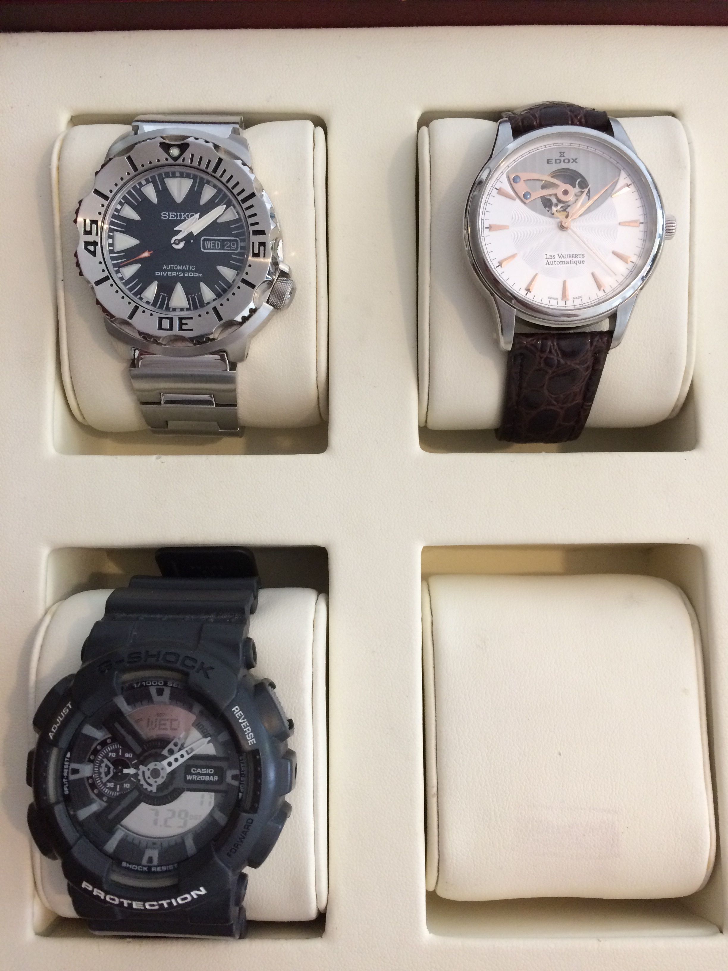 Maar het kriebelt altijd natuurlijk dus zoals eerder aangegeven ga ik wel over enkele maanden een horloge uit een andere prijscategorie aanschaffen (2500) In eerste instantie wilde ik definitief een duik horloge maar nu wil ik toch jullie mening weten wat ik nu echt mis in mijn kleine bescheiden collectie. Ik heb sowieso met mezelf afgesproken dat ik niet verder wil gaan dan een collectie met 5 horloges, dus nog 2 te gaan.