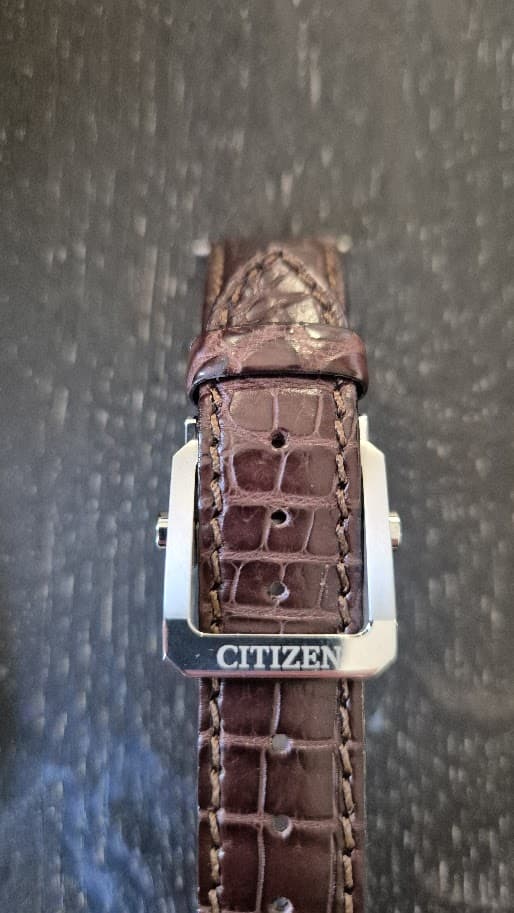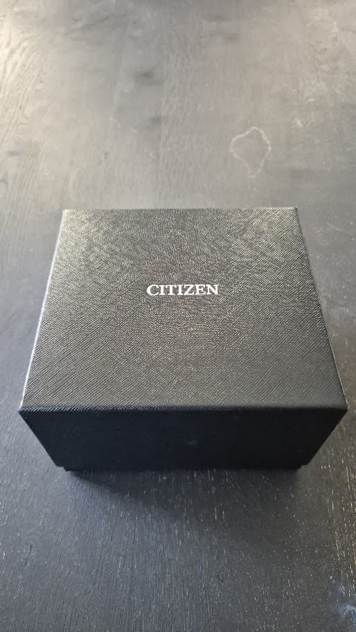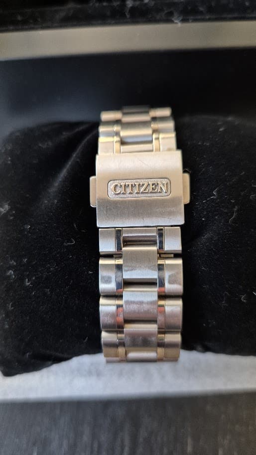 Wordt geleverd met zowel de bijbehorende Alligator-leren strap met titanium The Citizen deployant clasp als de titanium bracelet. De bracelet heeft gebruikssporen op en rond de clasp. Het horloge heeft een klein veegje op de bezel tussen 12 en 1u, enkel onder bepaalde hoeken te zien.