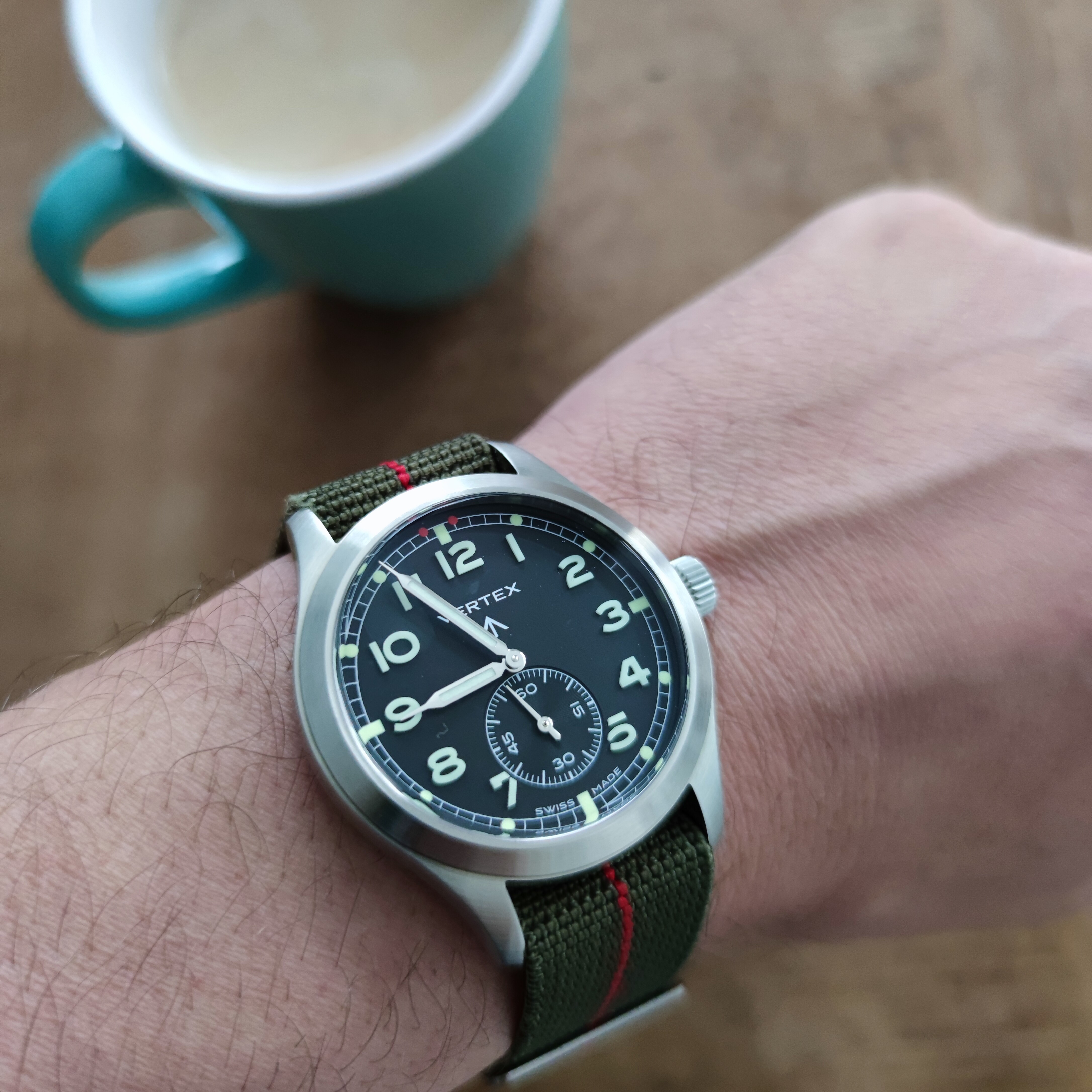 Het is een 6060 uurwerk, zoals ook in de originele Timor dirty dozen zit. Toch twijfel ik, want de sub-sec is iets anders dan de Timor dirty dozen. Wijzers zijn waarschijnlijk naar zijn grootje…