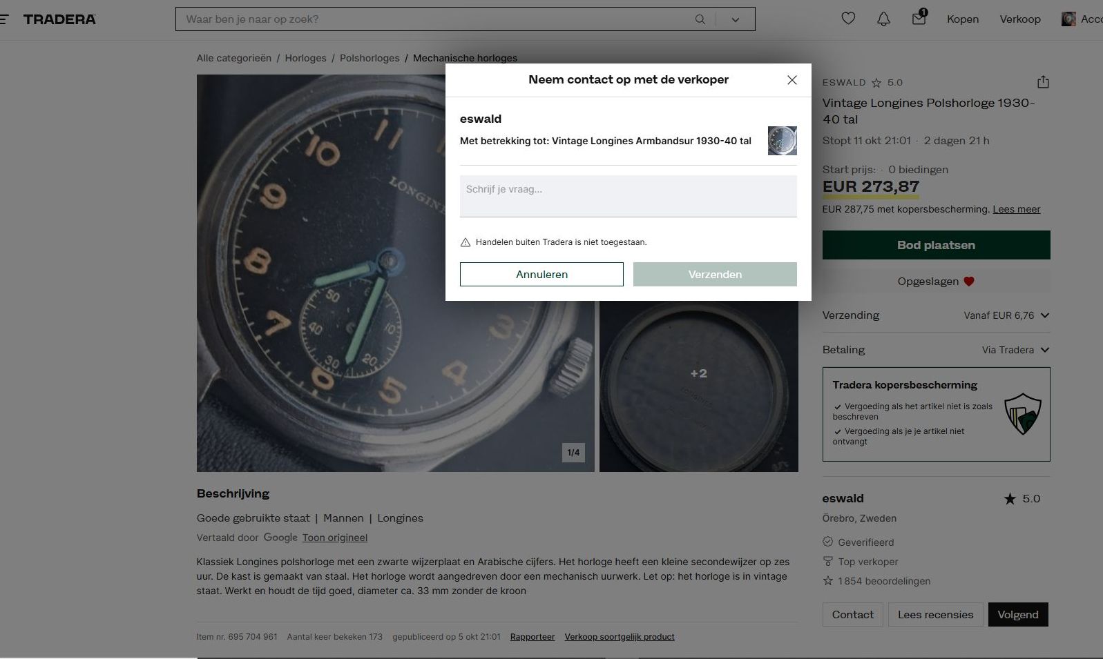 . Heb mij ingeschreven bij Tradera, nu wil ik om uit te proberen een horloge gevonden. Wil ik contact opnemen met de verkoper, komt er gelijk naar voren welke bank ik heb en mijn gegevens. Dus lijkt alsof ik item al koop. Maar wil juist eerst contact met de verkoper. Hoe en waar doe ik dat?