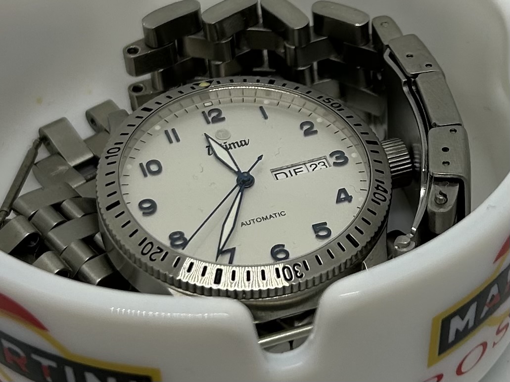 De blauwe wijzer wist de datum aan, al zijn de die blauwe datum cijfers door de tand des tijds vrijwel geheel vervaagt. Deze Heuer Datora Dato Compax is van ca 1947.