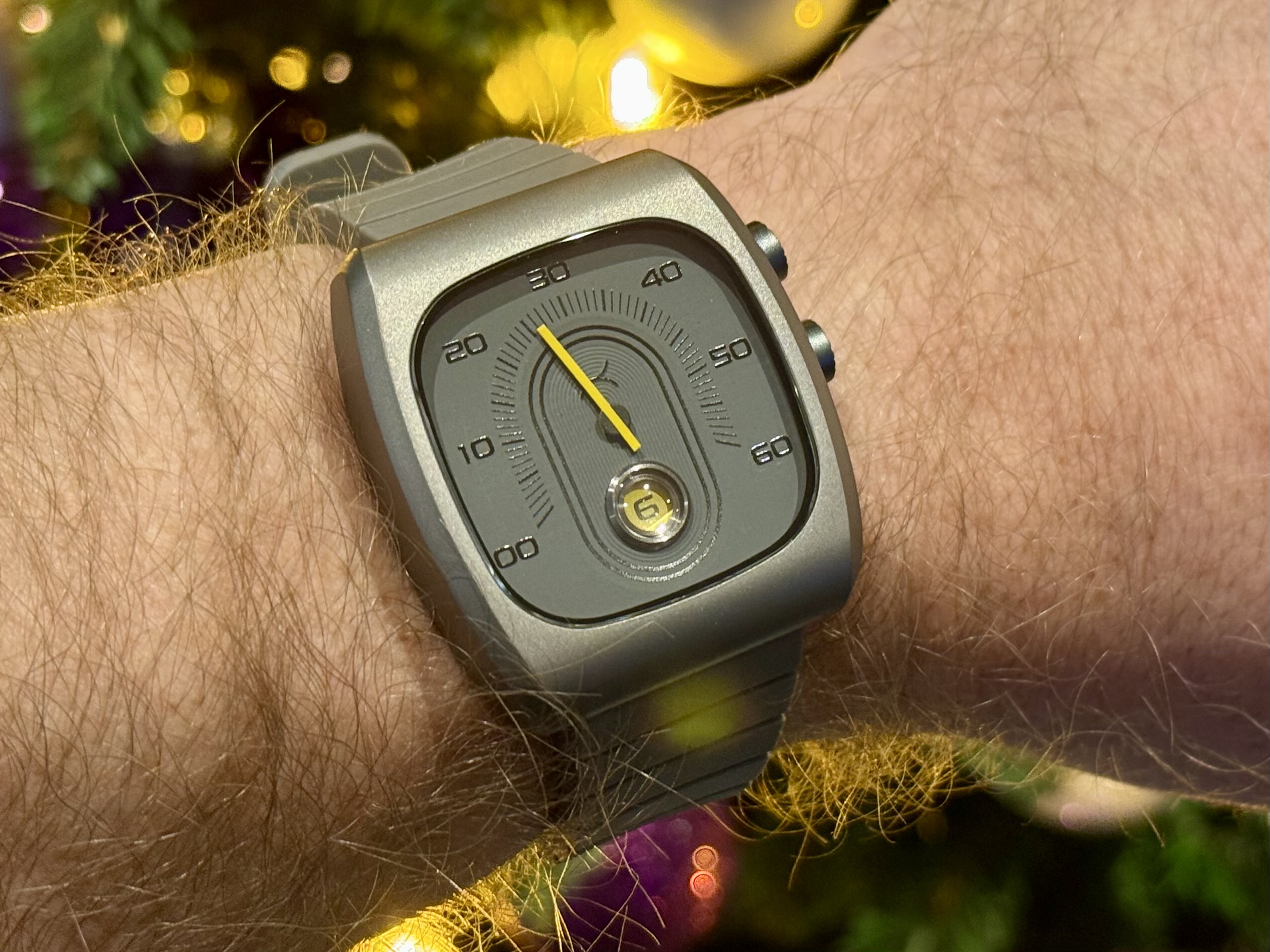 Volgens de regels van Fred mag er geen seconde-aanduiding te zien zijn. En deze Prisma geeft alleen de uren en minuten weer. Maar ik hoor het wel van de baas als het niet volgens de regels is.