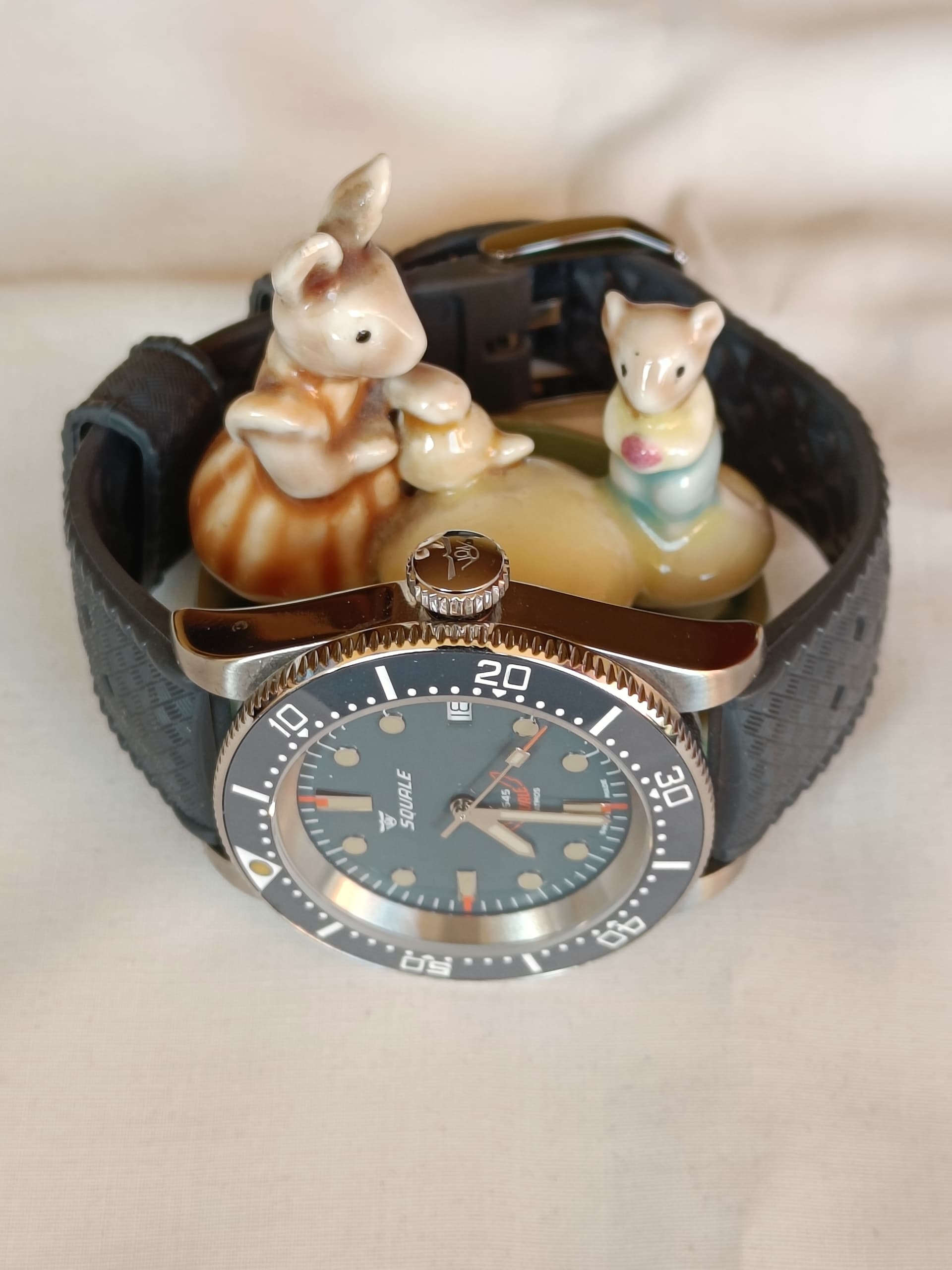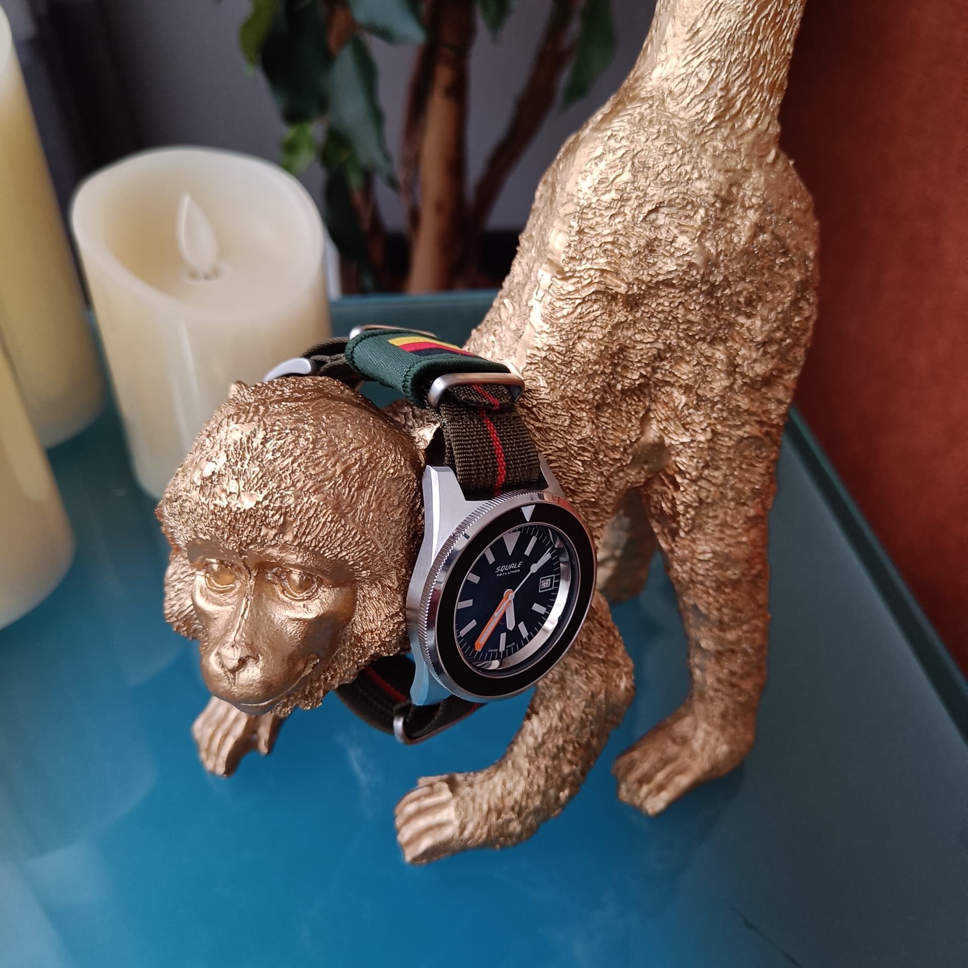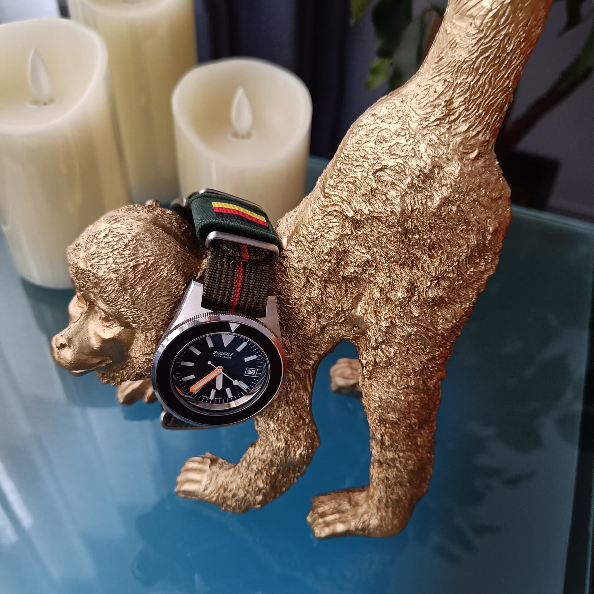 Je bedoelt die aap neem ik aan, heb je die met die olifant van mij gezien. Is antiek , zak maar niet zeggen wat die heeft gekost. Maar joh, toen zat ik nog volop in de antiek en niet in de horloges Zou je met deze Squale in India lopen gaat er echt zo een aapje er mee vandoor
