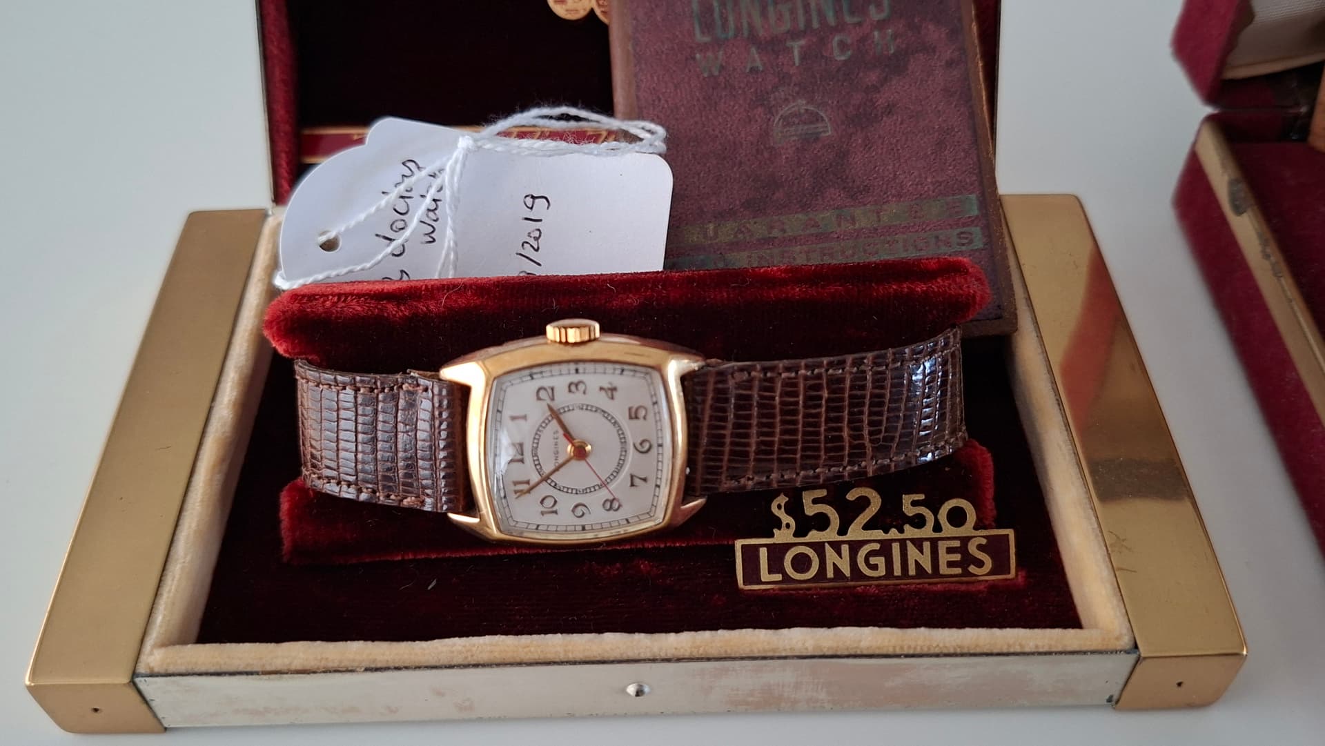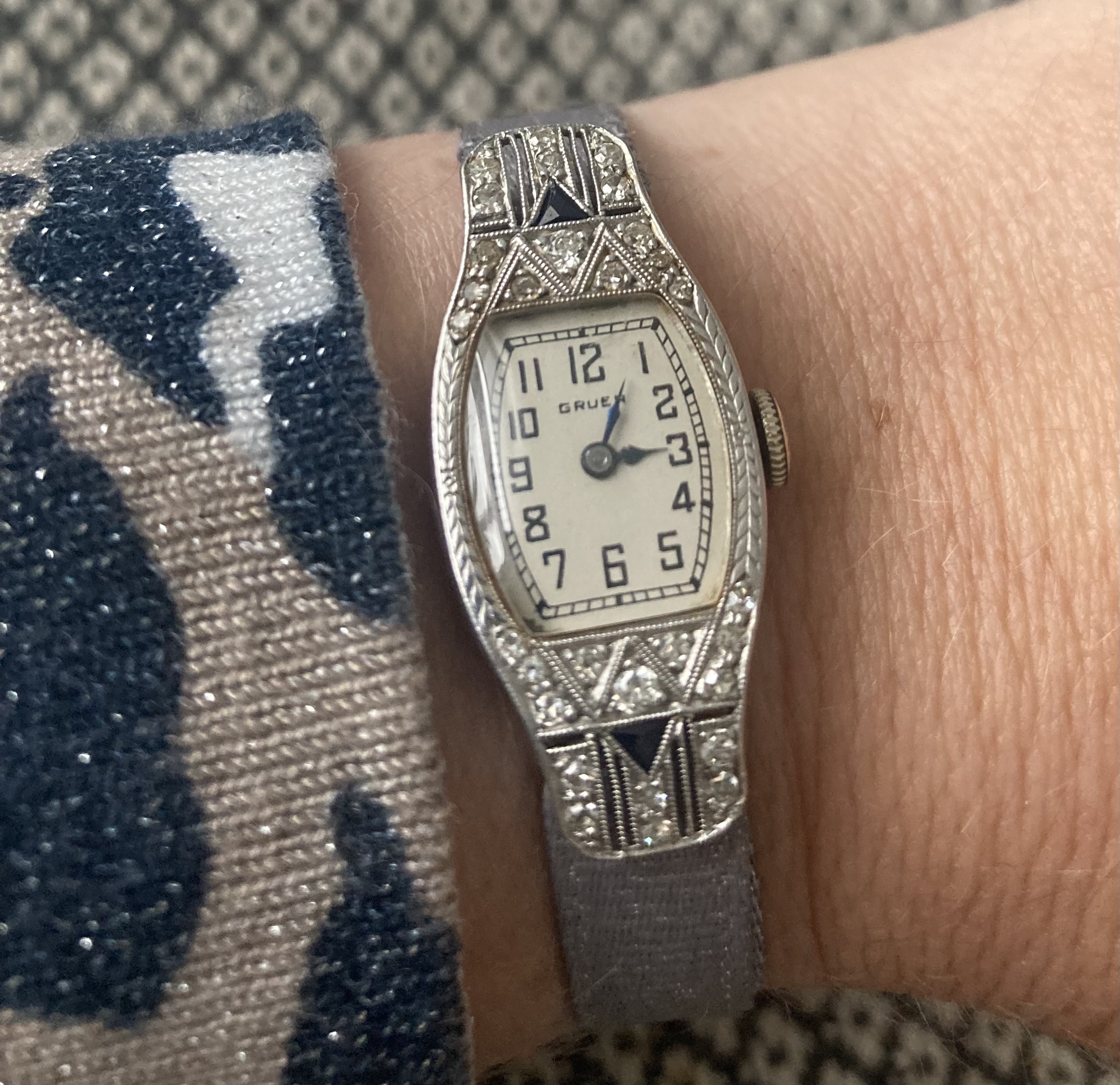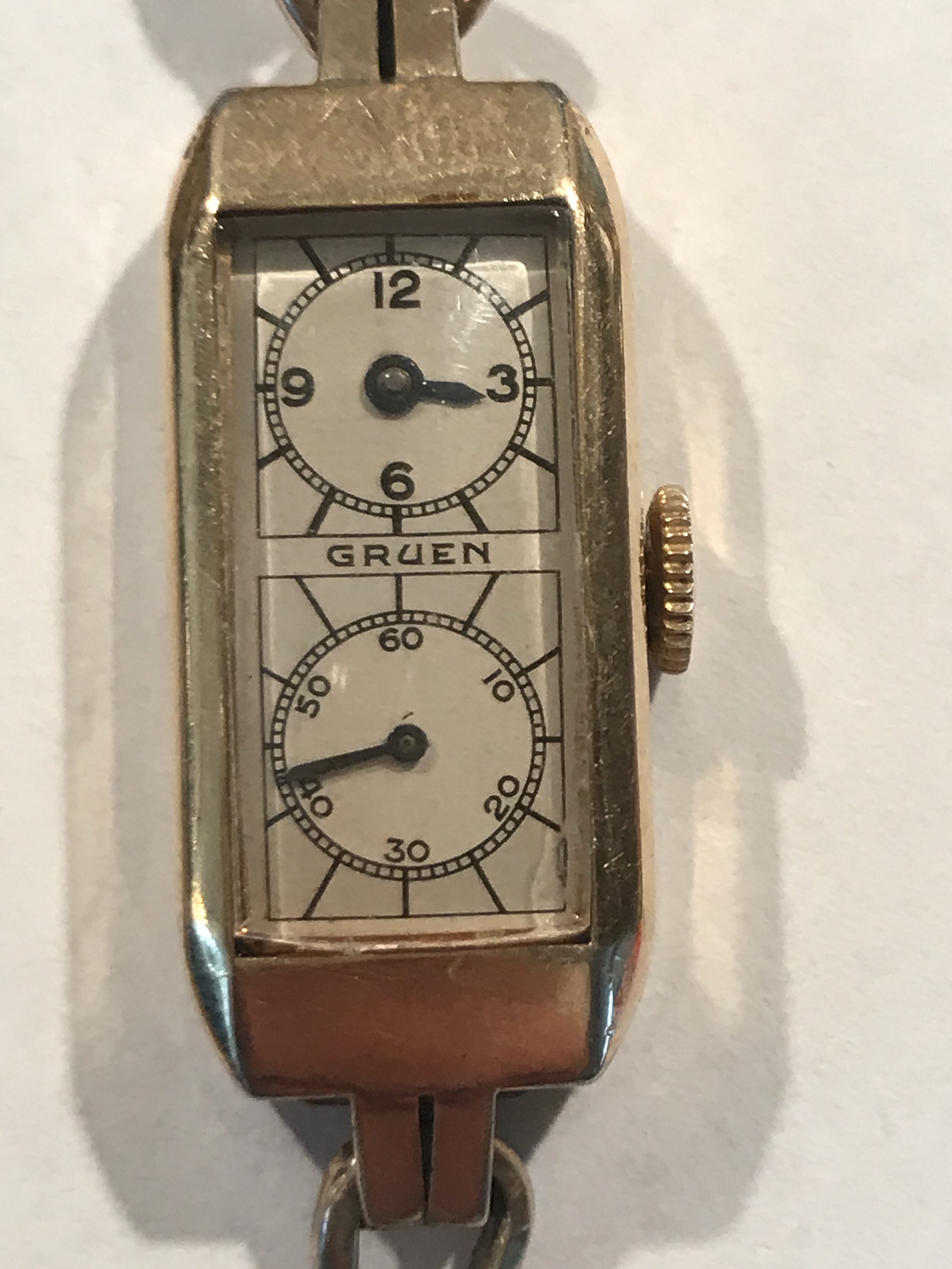 Gruen Cartouche uit 1925 met modelnaam 3P155. Verkoopprijs zal toen rond de 450 dollar zijn geweest.