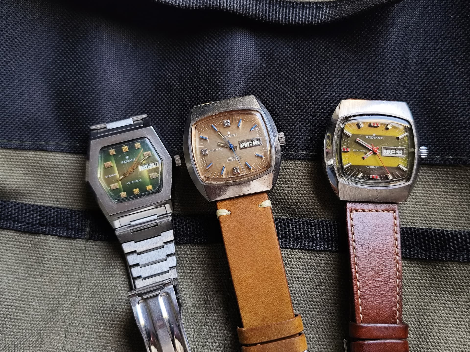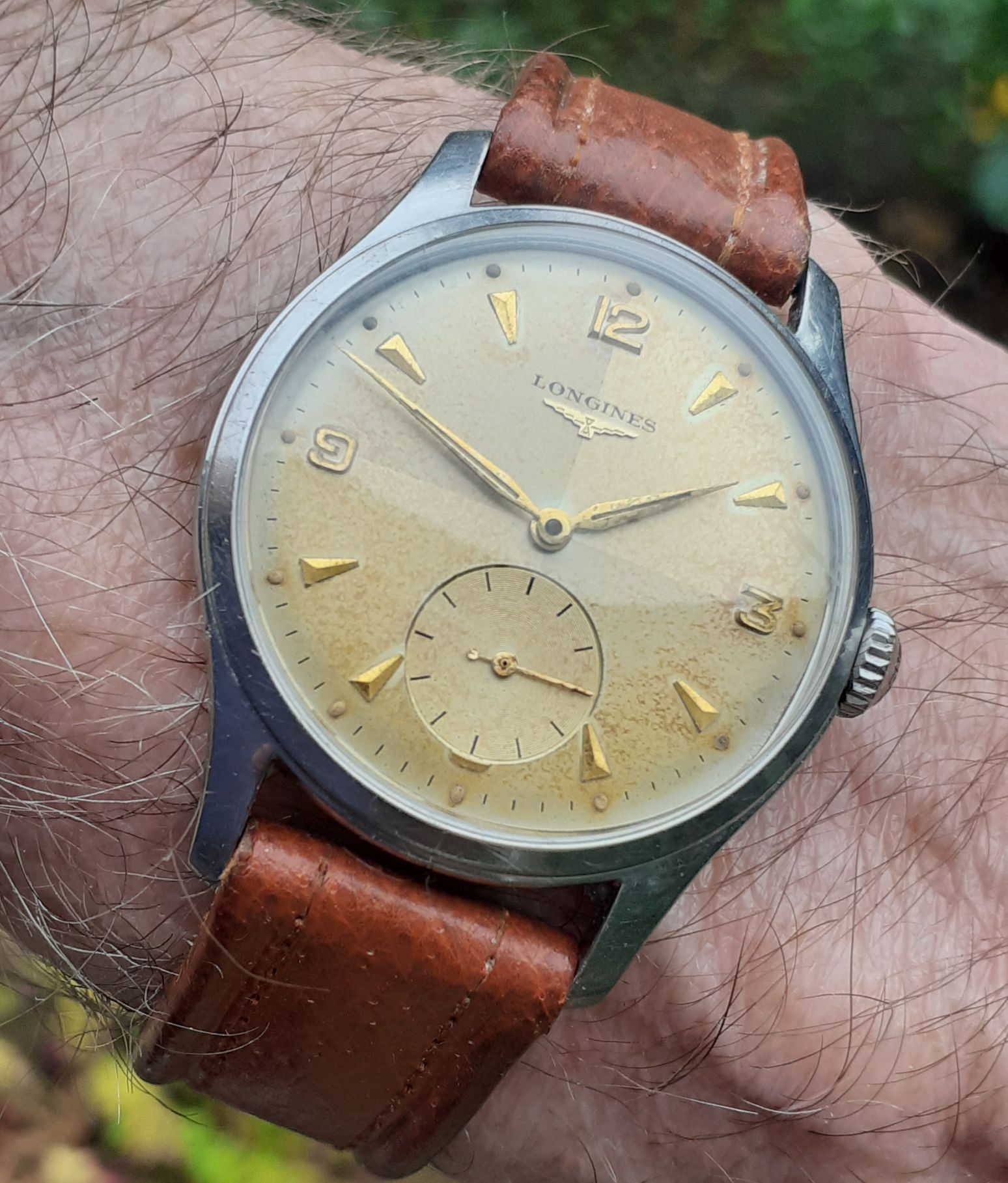 Dit prachtige horloge uit de jaren 50 heeft een opvallende wijzerplaat met kwadranten, die oorspronkelijk zilverkleurig was maar door de tijd heen deze unieke goudkleur heeft gekregen.