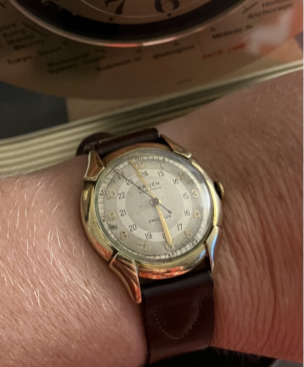 Uit 1955, een Gruen (naam weet ik zo niet) met daarin hun inhouse uurwerk gemaakt in Norwood.