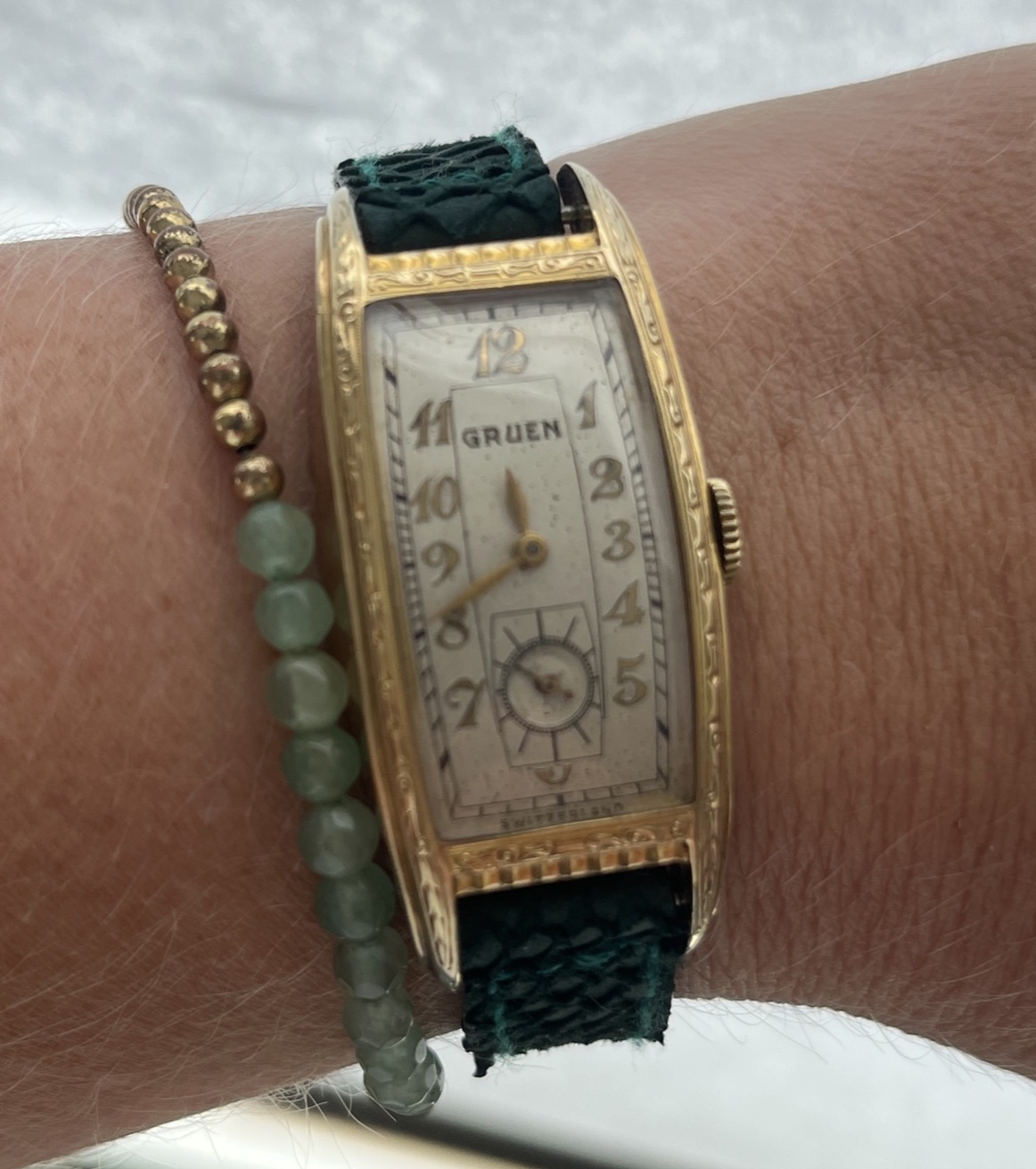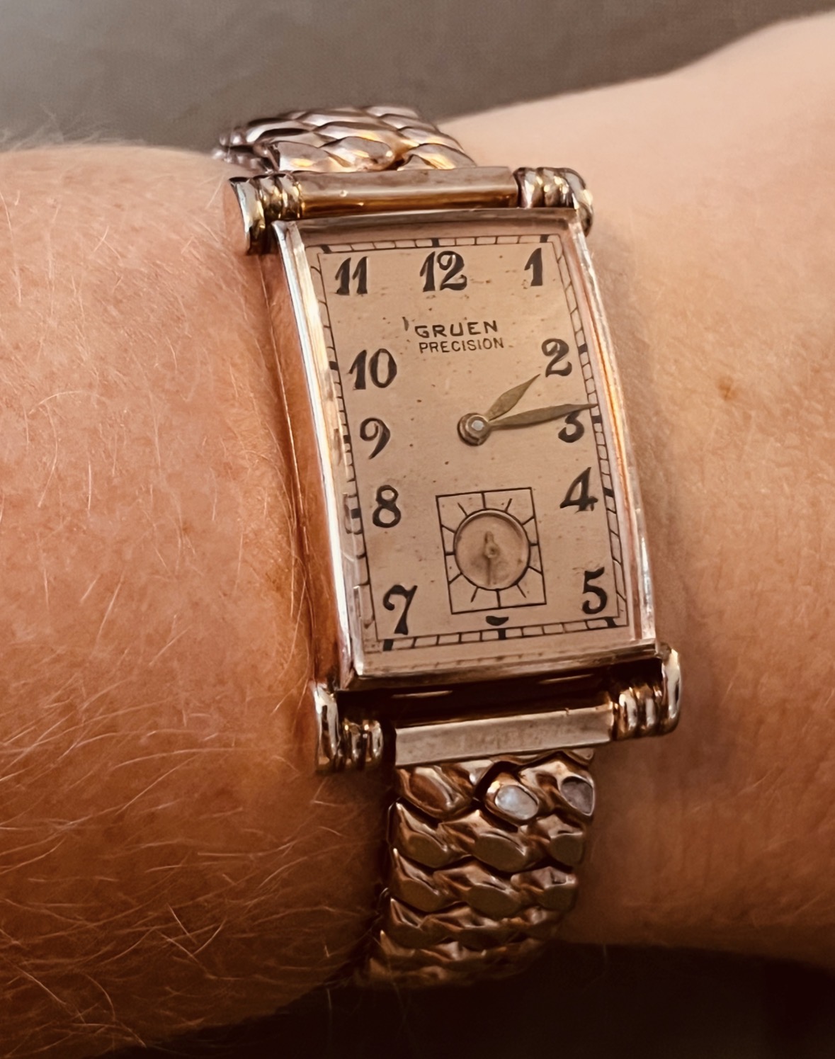 Gruen Cartouche uit 1925 met modelnaam 3P155. Verkoopprijs zal toen rond de 450 dollar zijn geweest.