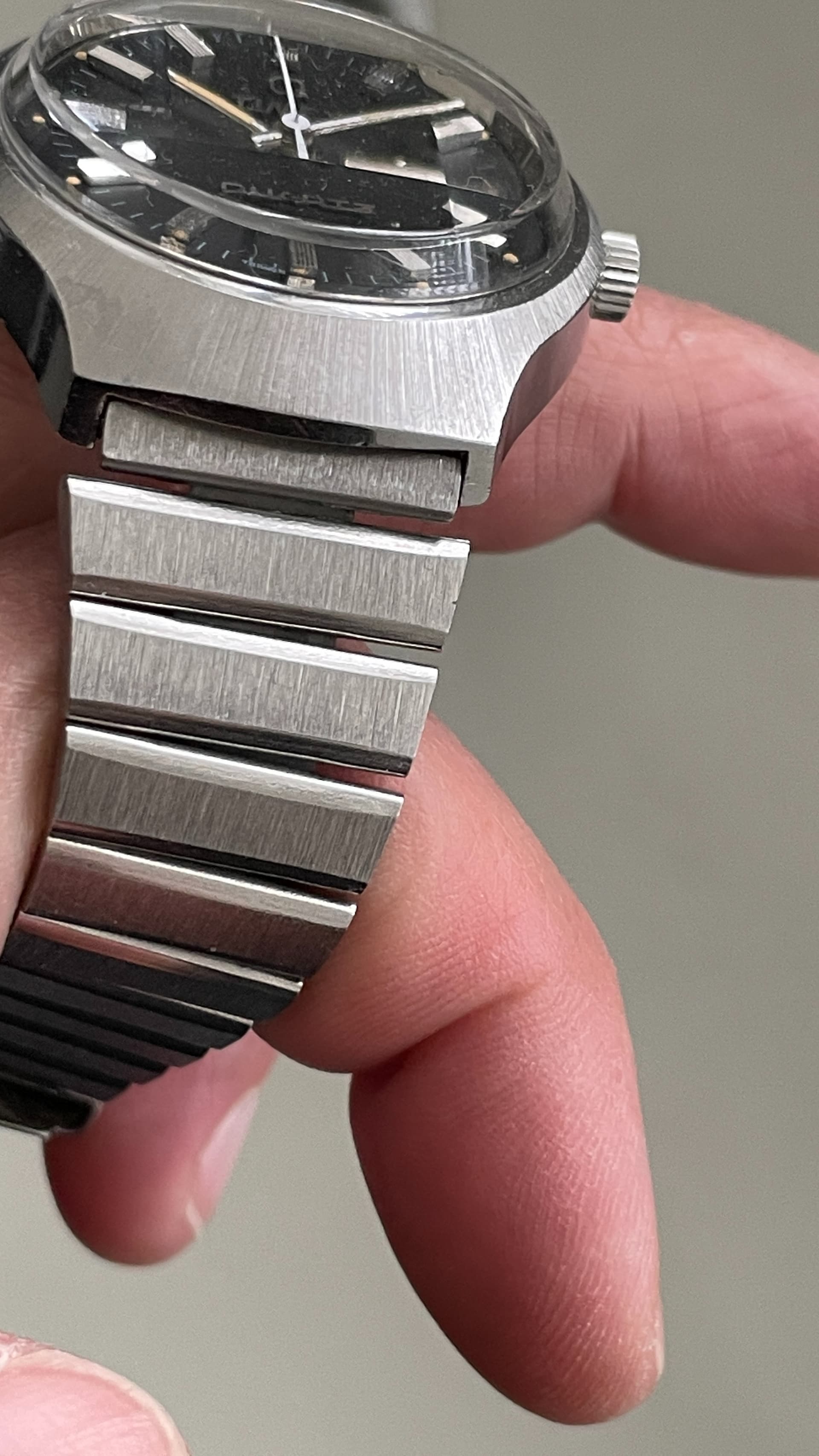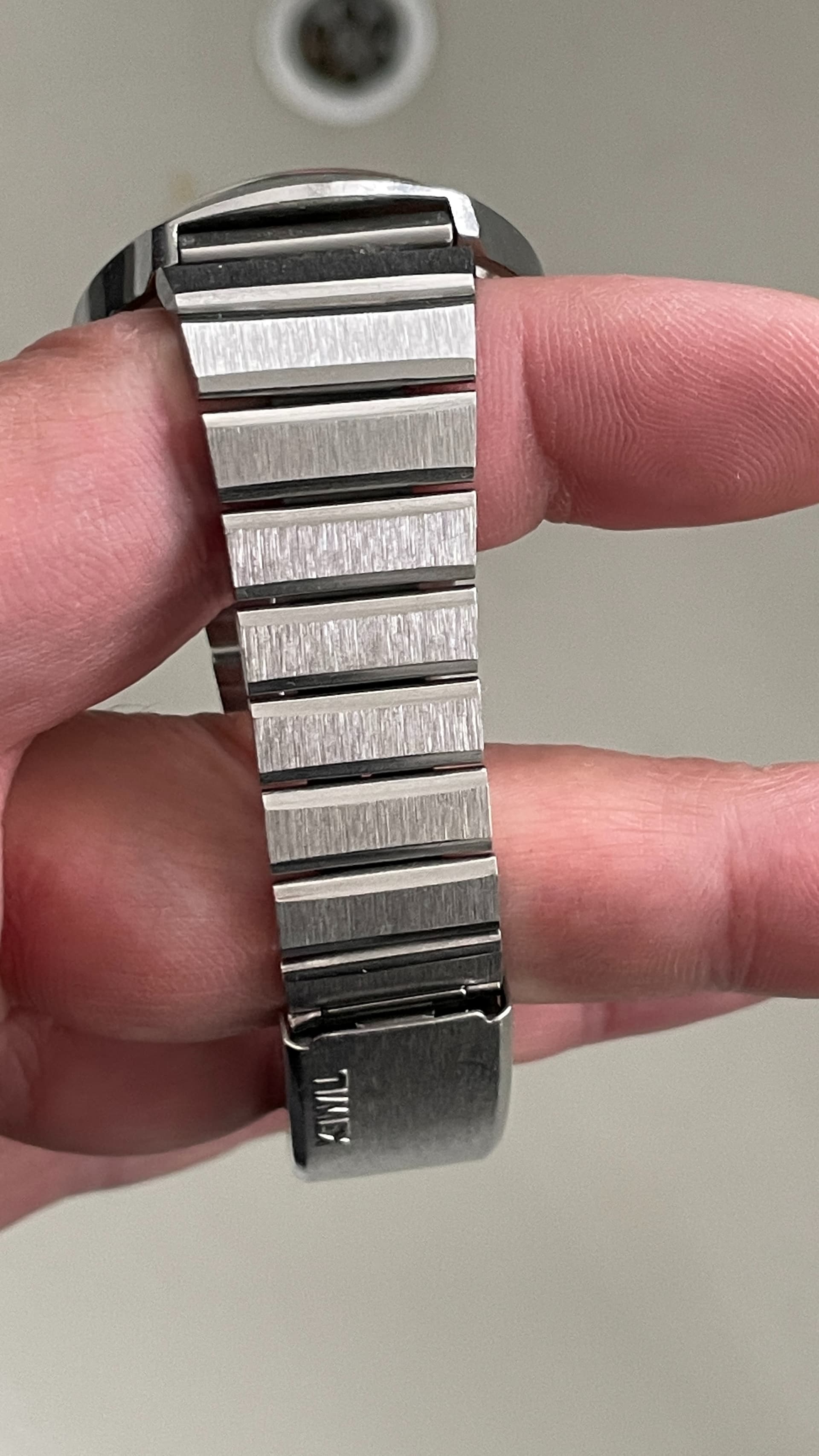 Deze band ( nos uit de jaren zeventig) is gemonteerd op hetzelfde model en kan overgenomen worden en hoort origineel op dit horloge:
