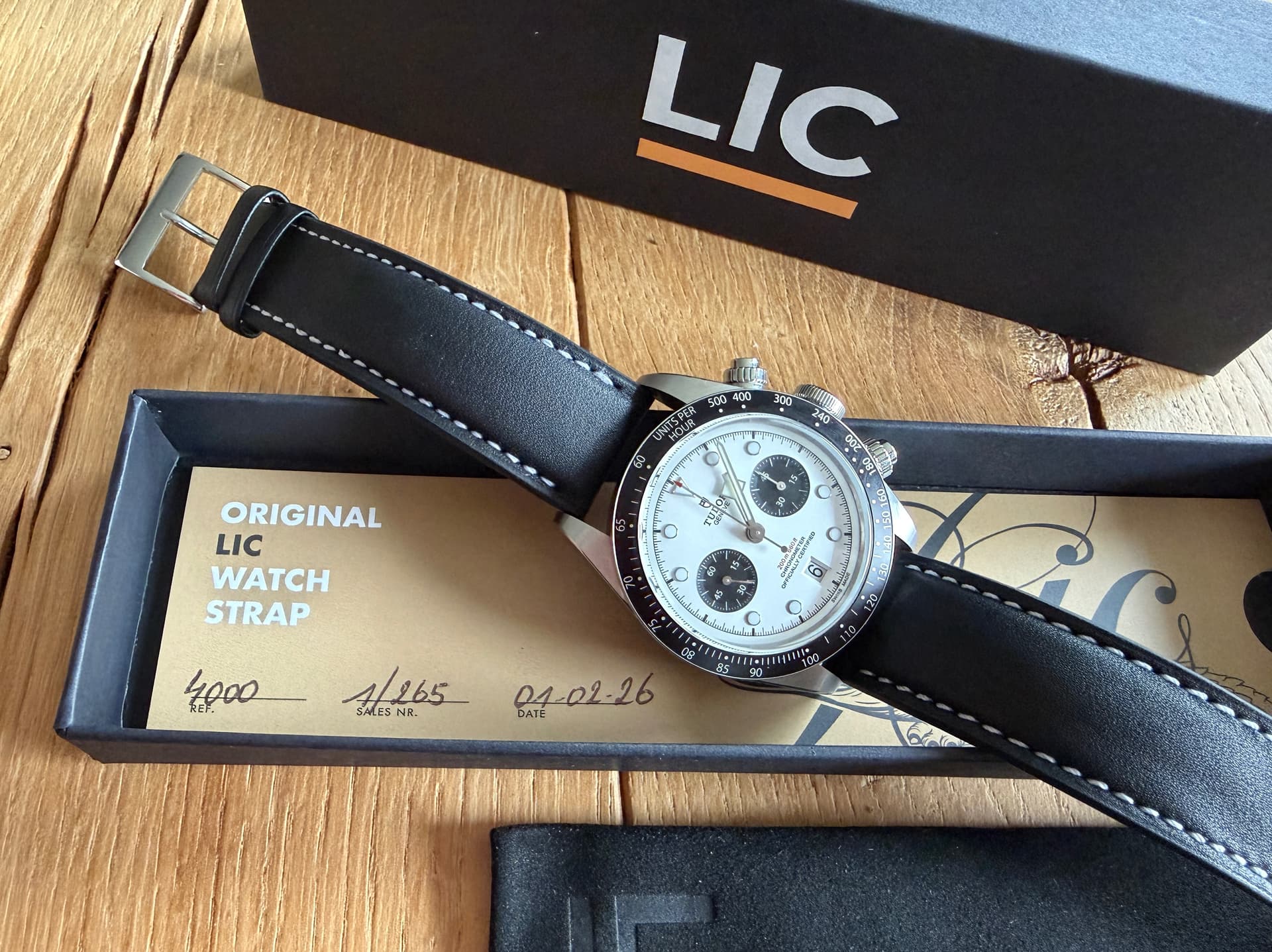 De “Baranil Zwart Navigator” van het Belgische merk International Leather Company (LIC ook bekend als ILC) uit Oostende. Vorige week besteld, vandaag op de mat. Een prachtige zwart-lederen horlogeband met wit stiksel voor mijn Tudor BB Chrono Panda. Mooi handgemaakt spul en in dit geval lijkt het ook nog eens nummer 1 van 265 te zijn.