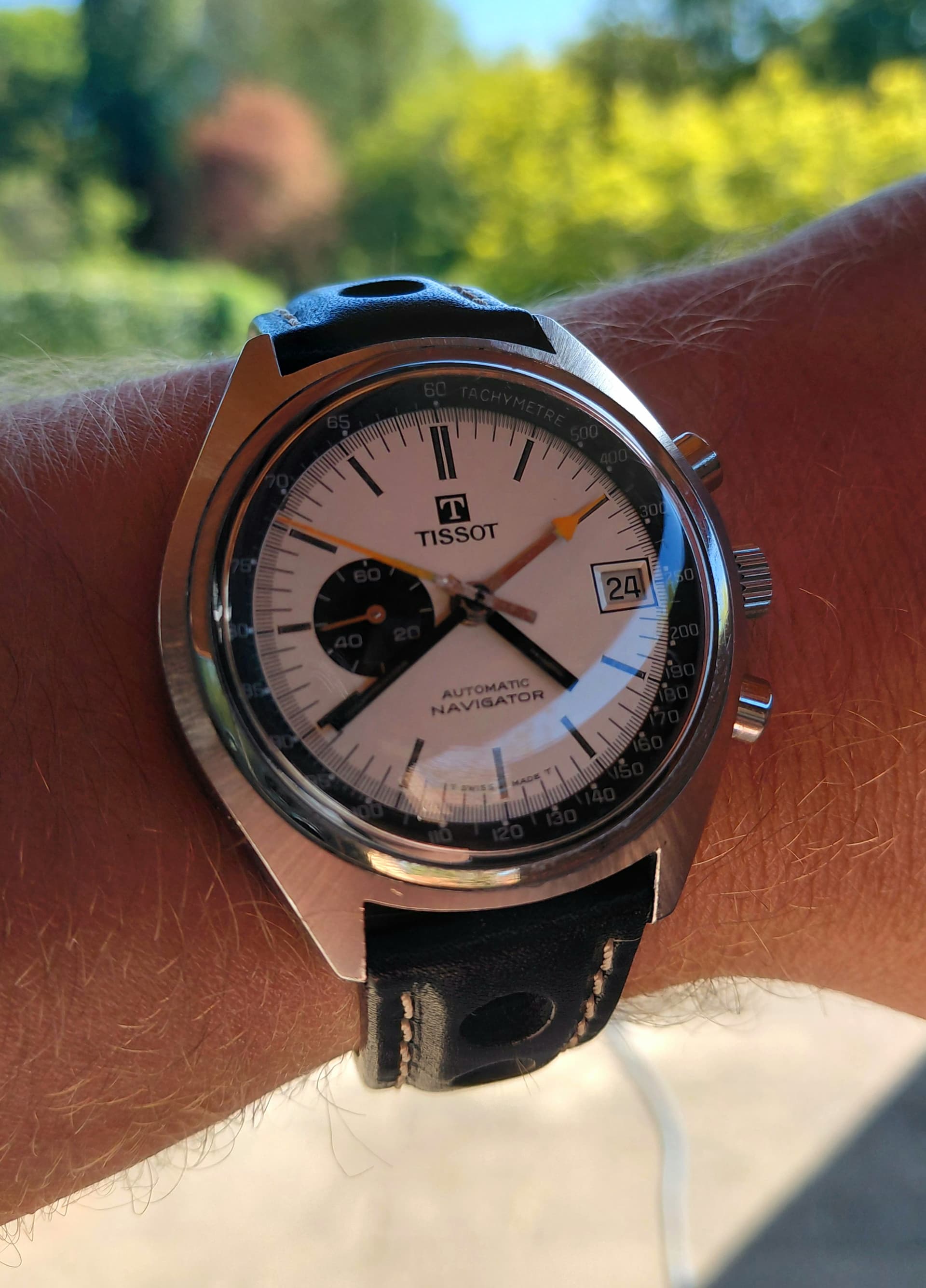 Het betreft een klassieke Tissot Navigator met een automatisch Lemania 1343 uurwerk. Dit uurwerk heeft een chronograaf functie bestaande uit een grote secondenwijzer en een grote minutenwijzer. De chronograaf werkt perfect en reset mooi op twaalf.