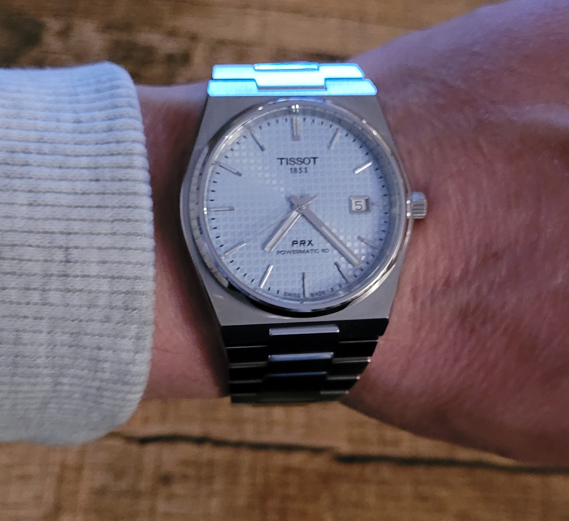 Zakhorloge om de pols. Wel wat fors, maar ter compensatie de PRX met Ice Blue wijzerplaat, net effe kleiner.
