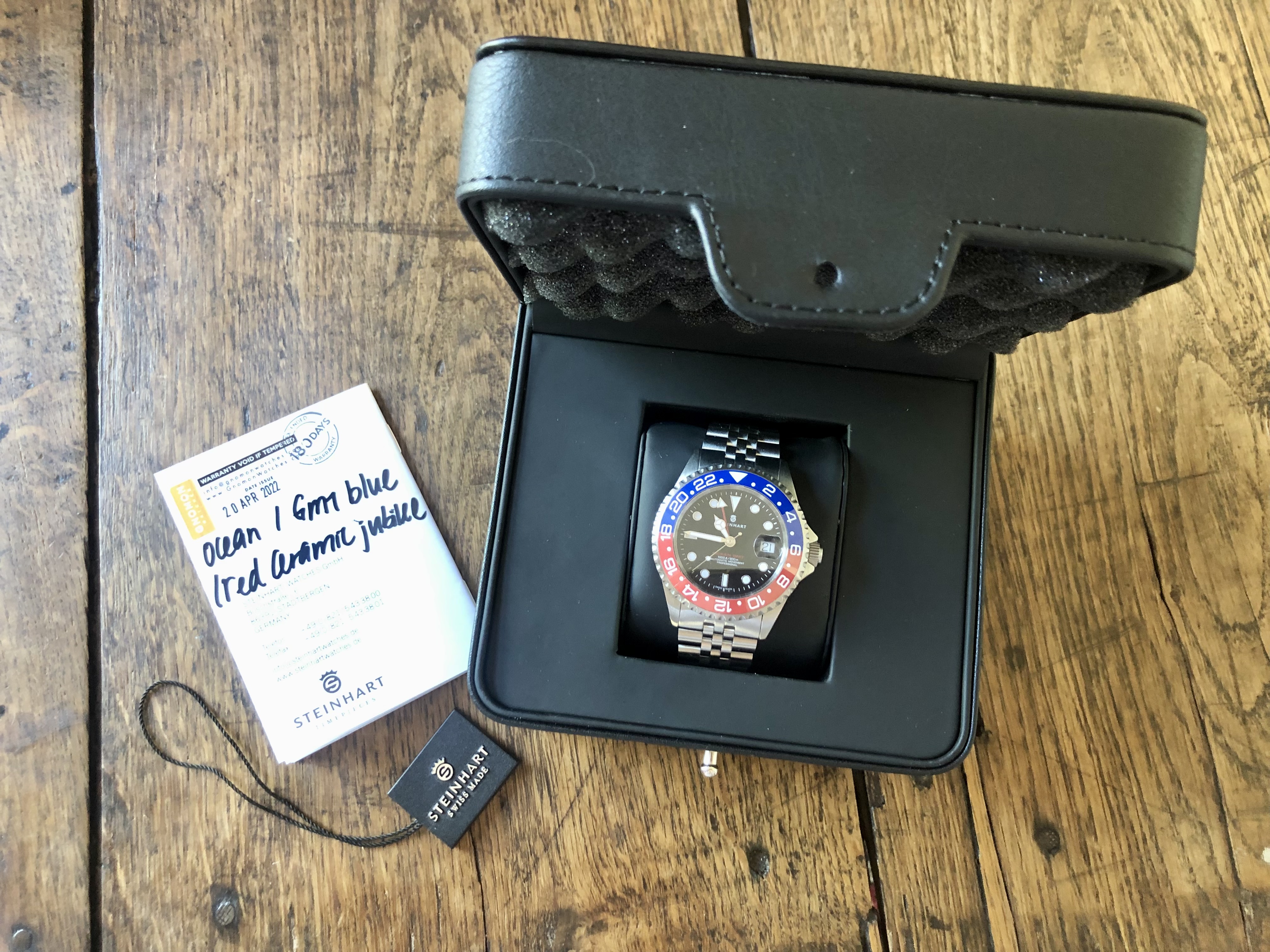 Omdat ik zin had in een zomer vol Pepsi + Jubilee geweld, maar iets minder zin in idiote prijzen en grijze dealers, bestelde ik een Steinhart Ocean One GMT Pepsi. 2 Ceramic bij Gnomon. De 39 mm, voor mijn ranke polsen. Of in ieder geval, dat dacht ik.